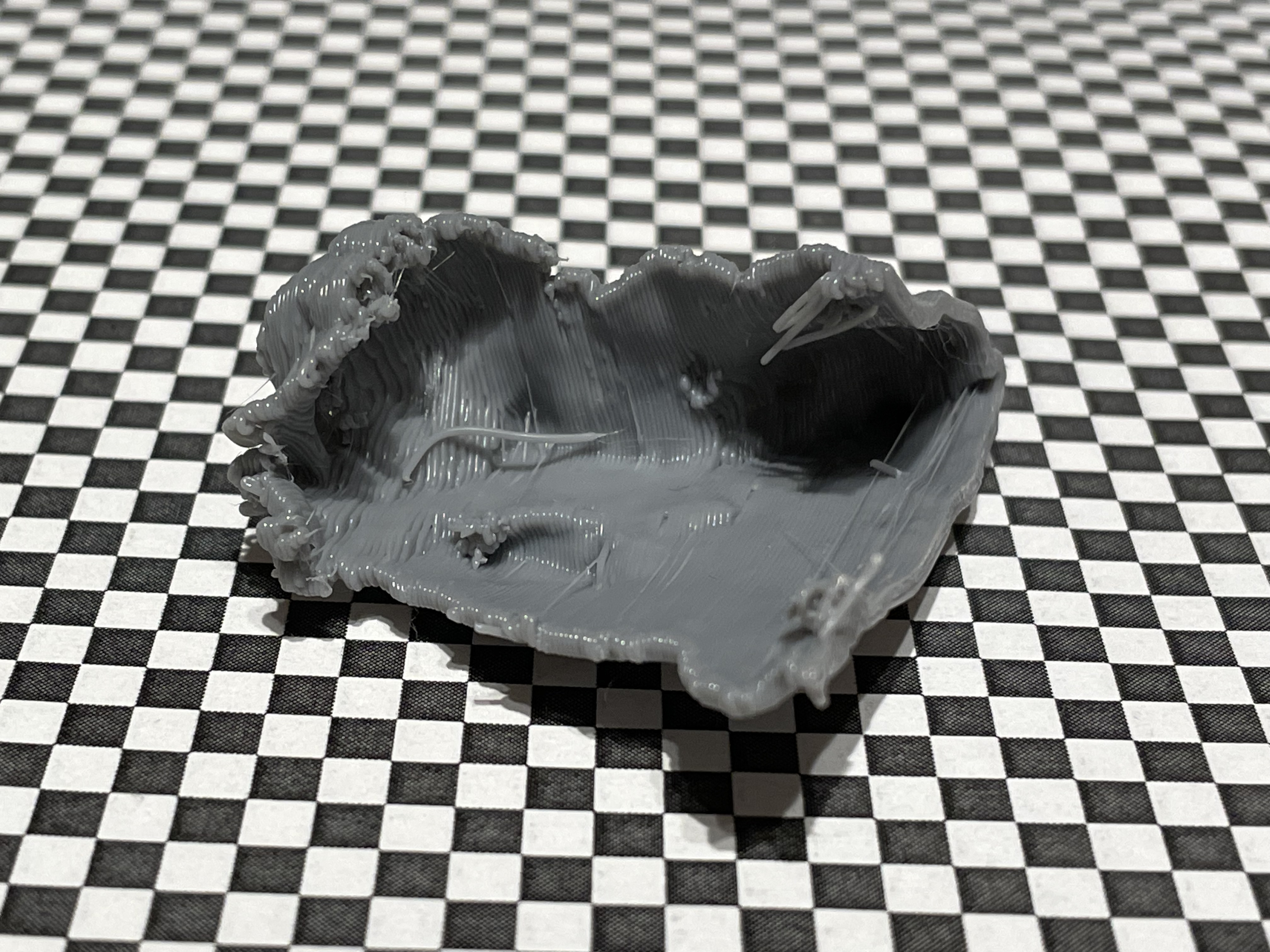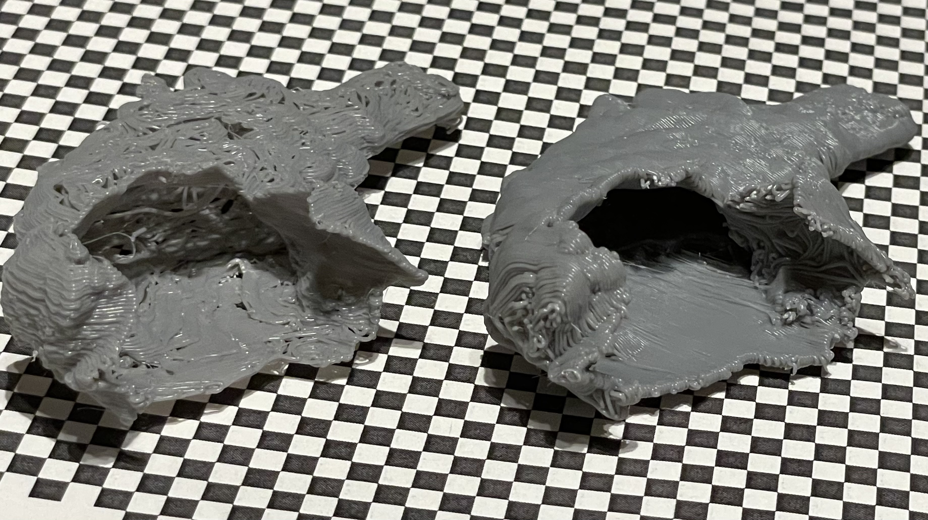 Our next iteration increased the amount of extrusion. But it too failed, as the cave was now built upwards, and it fell down in the middle of the printing.