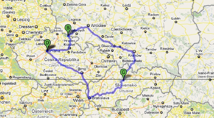 On the right there is one possible route, stopping (again) in Czech Republic, somewhere in Poland, and in the Tatra mountains in Slovakia.