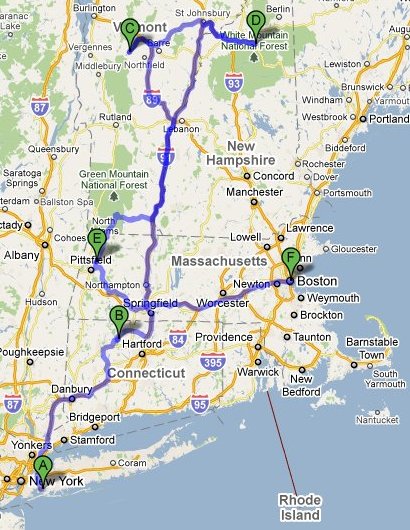 Can you see a shorter route that would enable me to cover four states? Is there something in MA that would be closer to Boston? What's the traffic like from JFK to Hartford, CT on a Friday evening?
