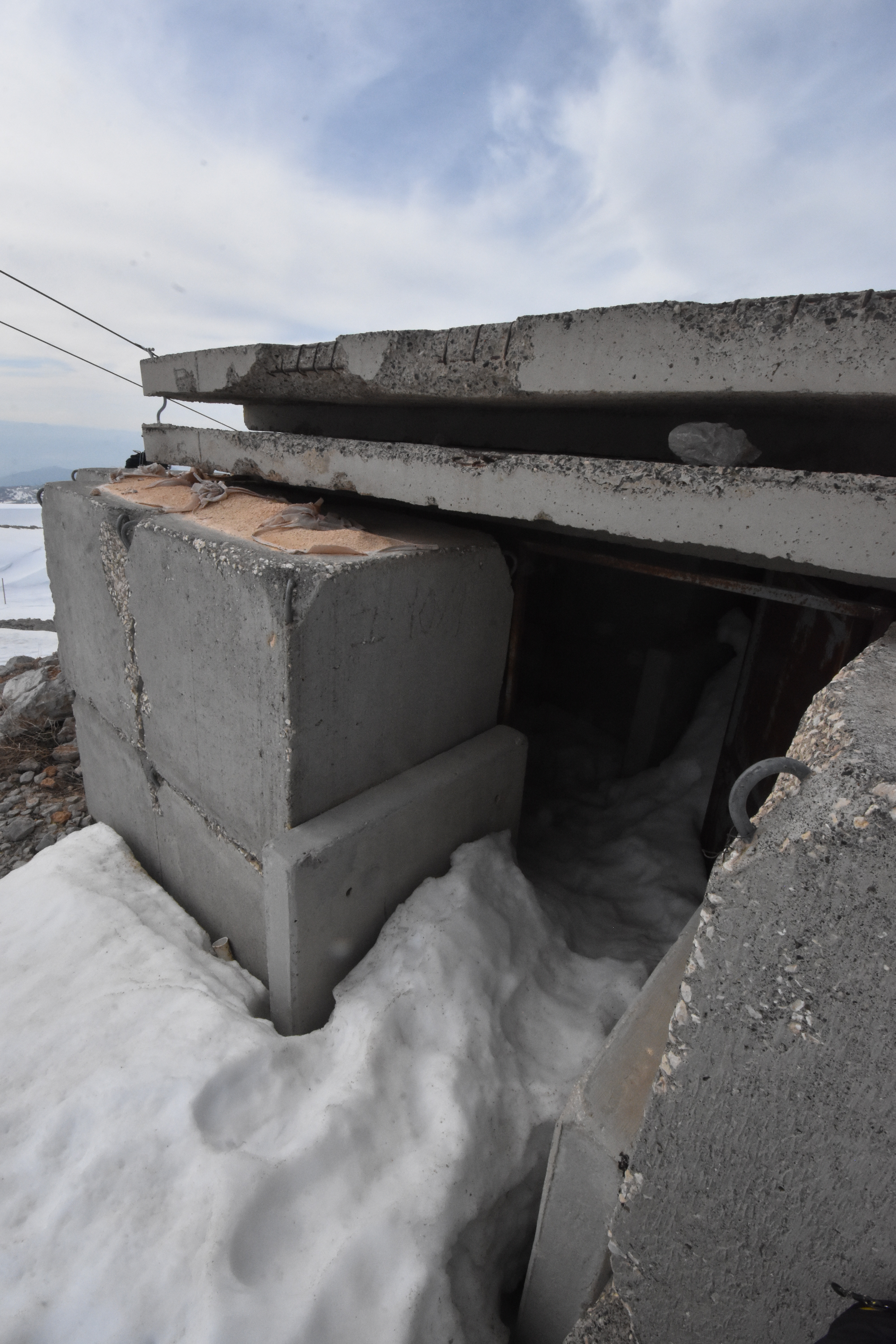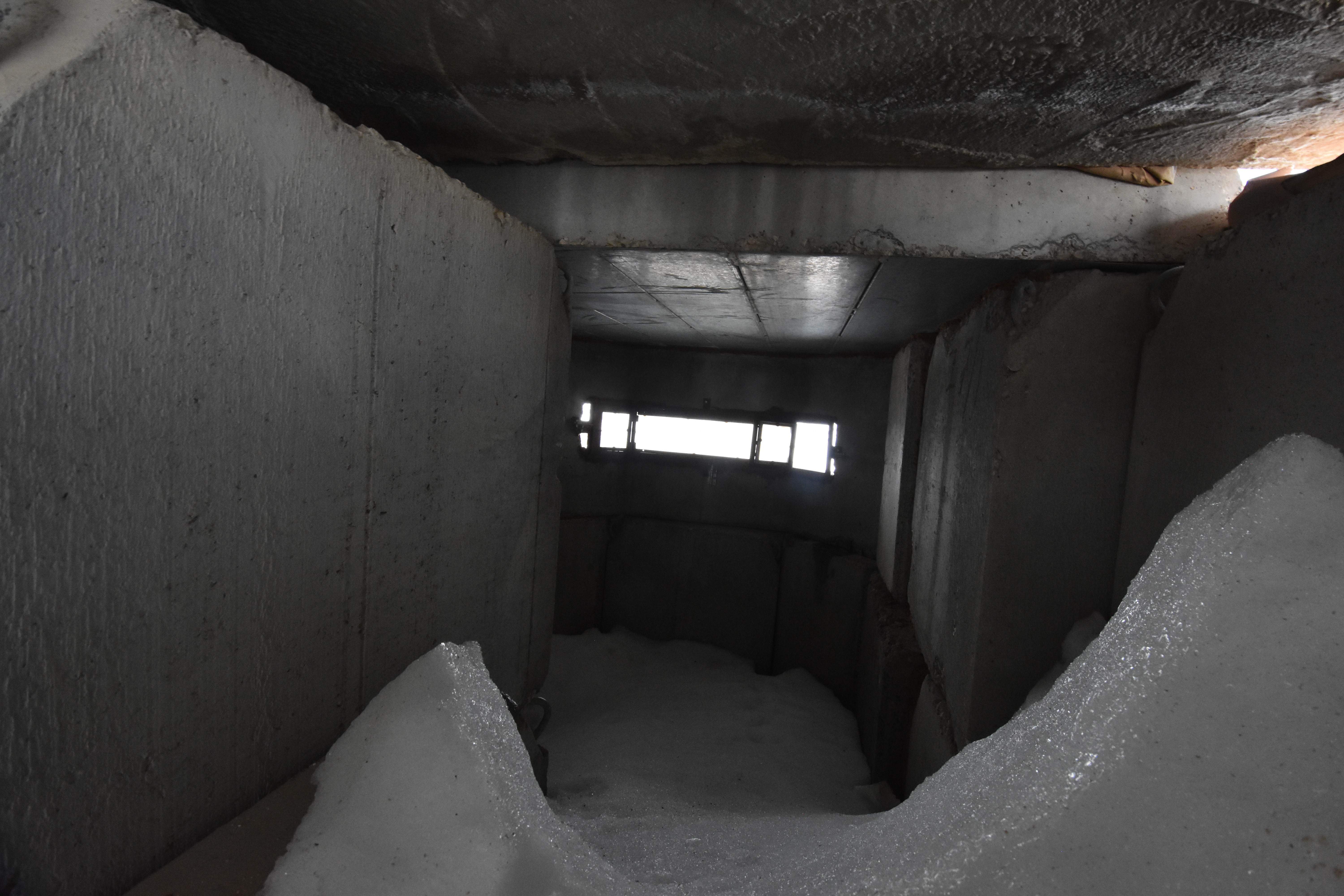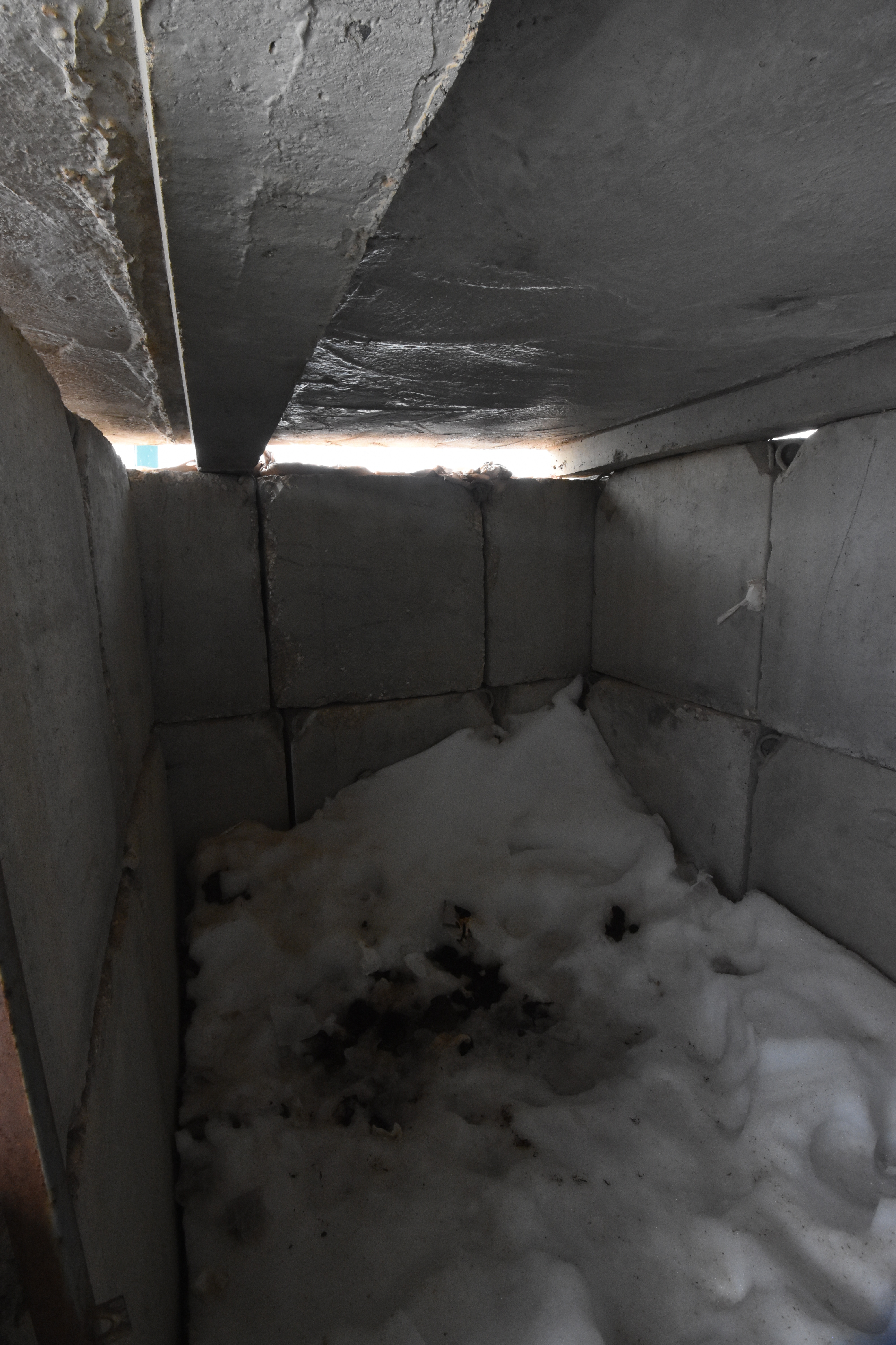 The bunker was a simple concrete block construction, with a two-layer sandwich structure at the top. The first room had been used for shitting, the second with more of a view down the hill was full of ice.