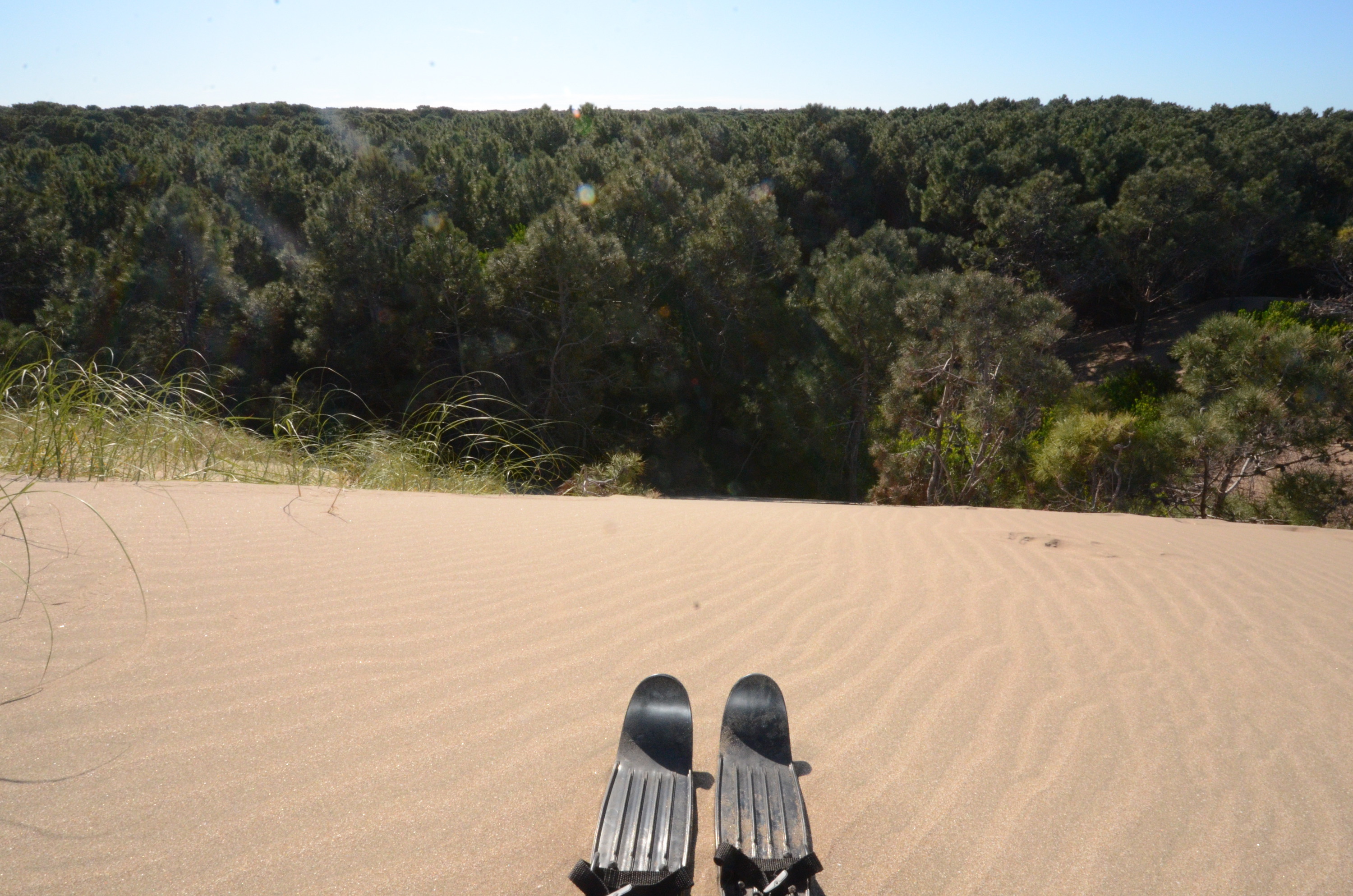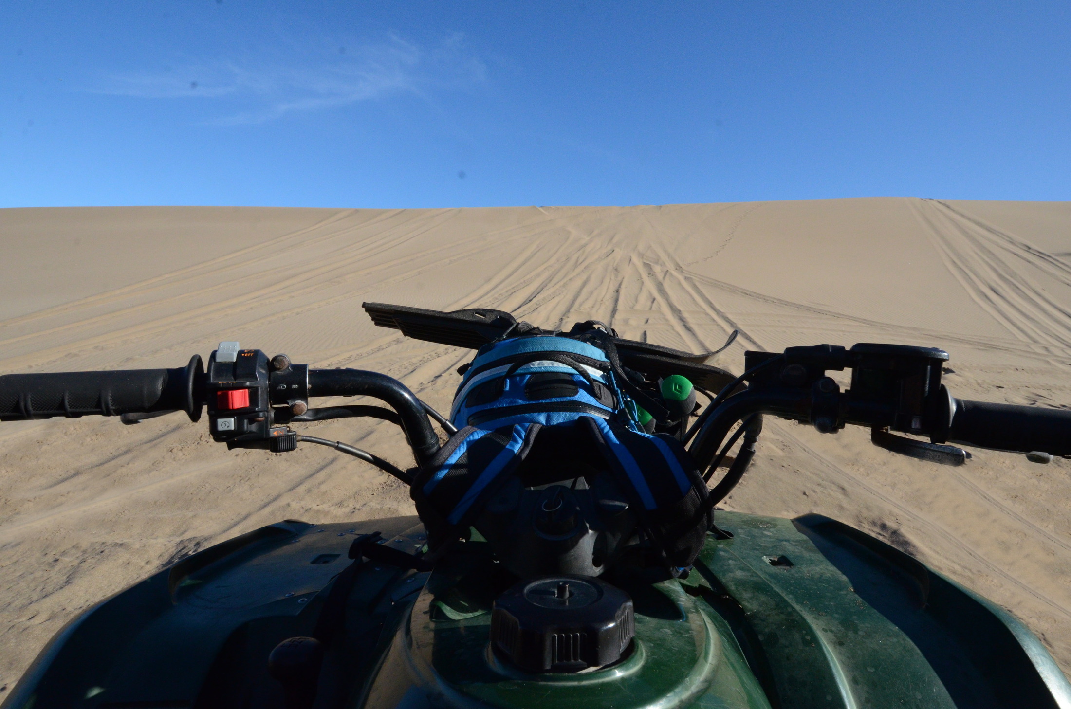So I ended up going to the slopes on the one vehicle that I have not tried yet: an all-terrain vehicle (ATV), a four-wheeled small buggy. There are some sand dunes in the seashore area, not too many but enough to try out some skiing. My miniskis are again in action, feeling at home on the sandy slopes. With enough steepness, the small skis slide better than long ones, turn better, and are easy to carry.