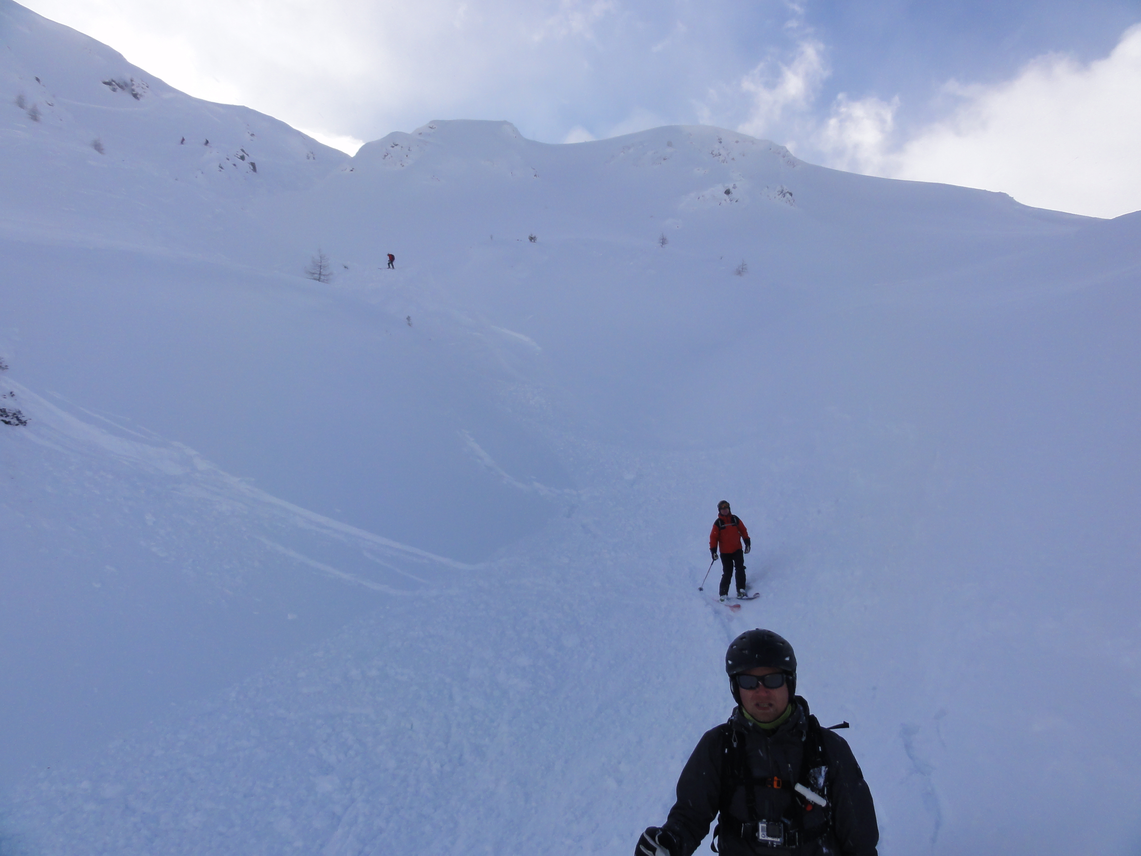 However, several hundred meters above there was a steep face. As we skied forward, high above us that face fractured. The avalanche turned into a wide, powdery cloud that first hit the plateaue above us, and then continued straight towards us in the mildly sloping couloir that we were at.