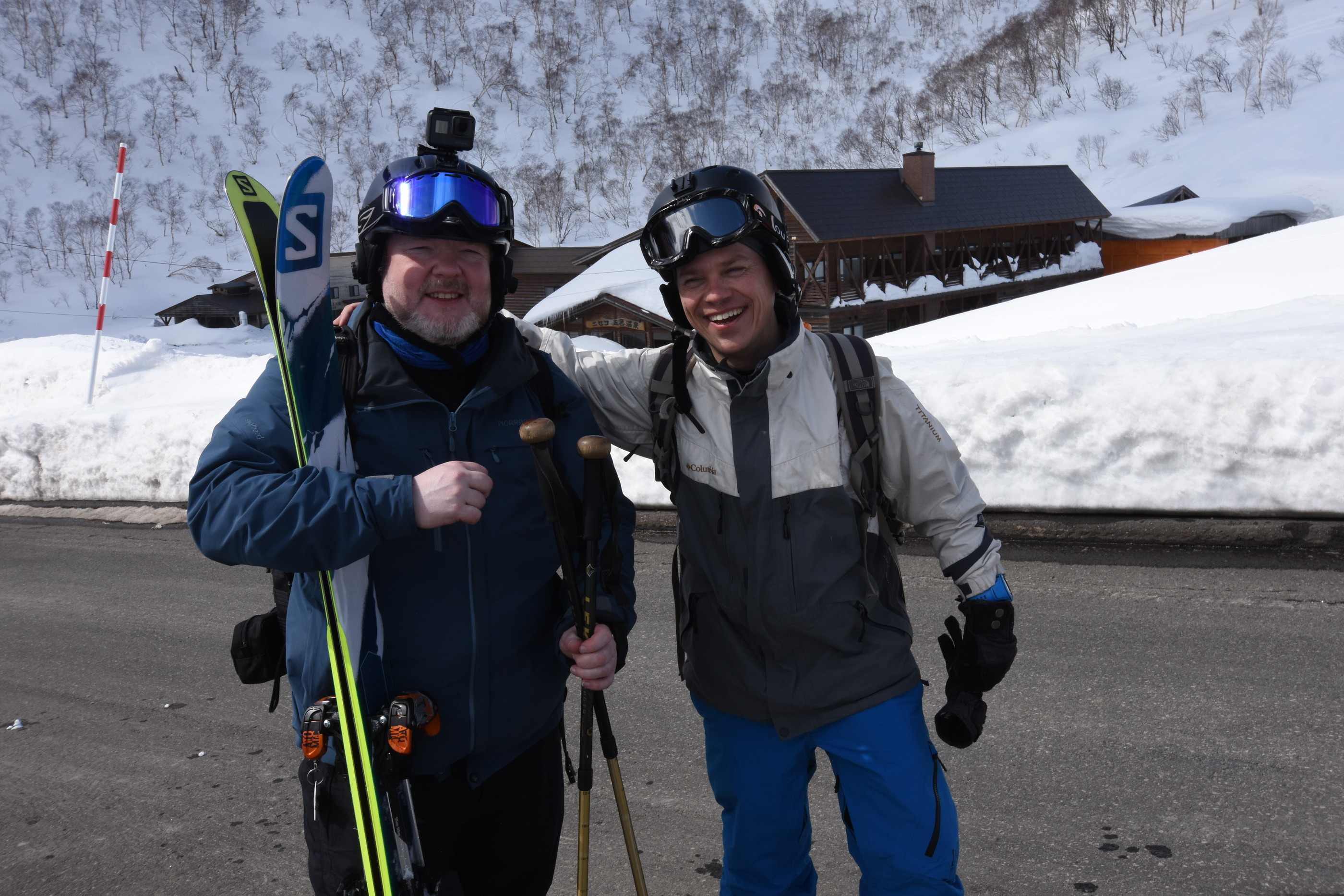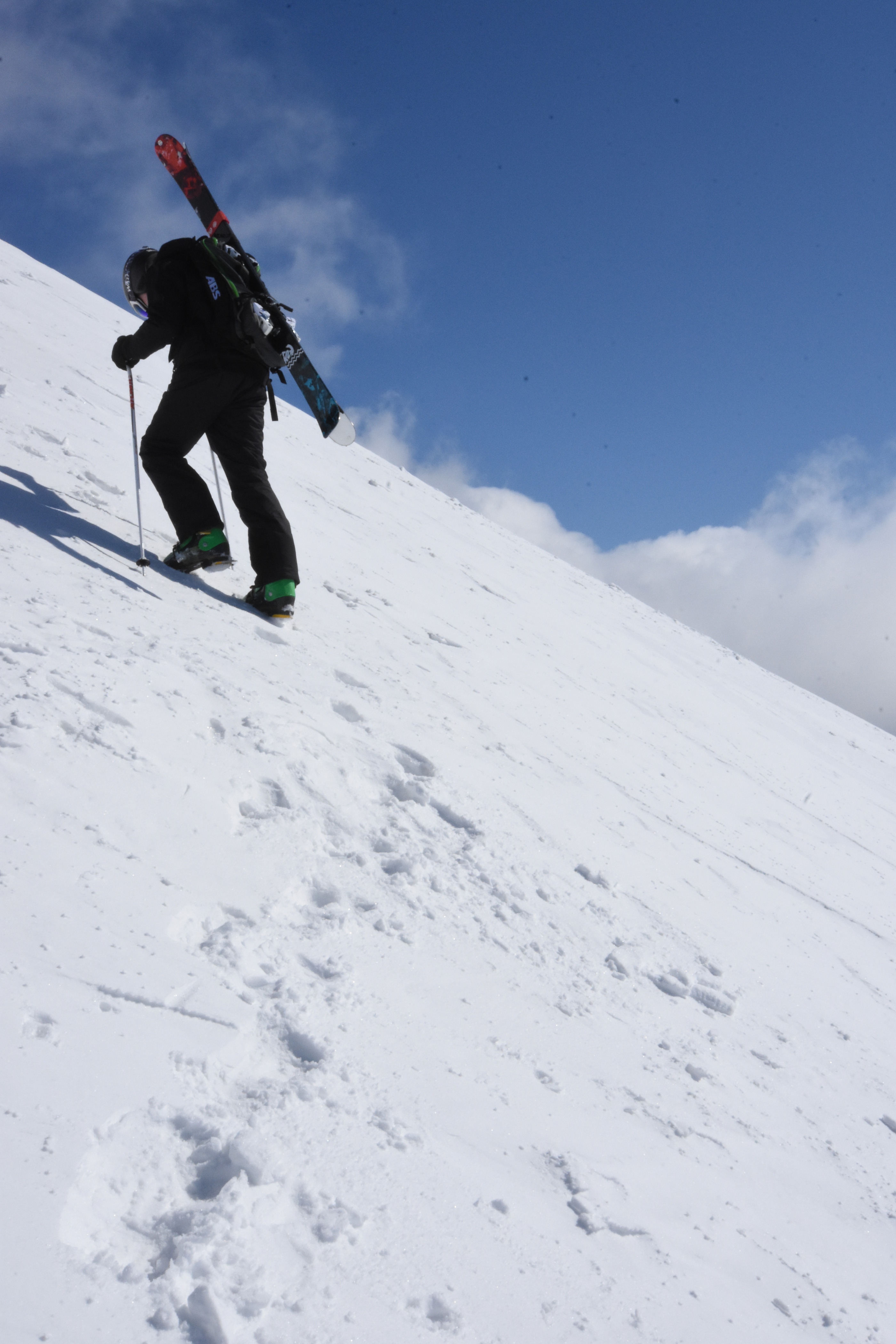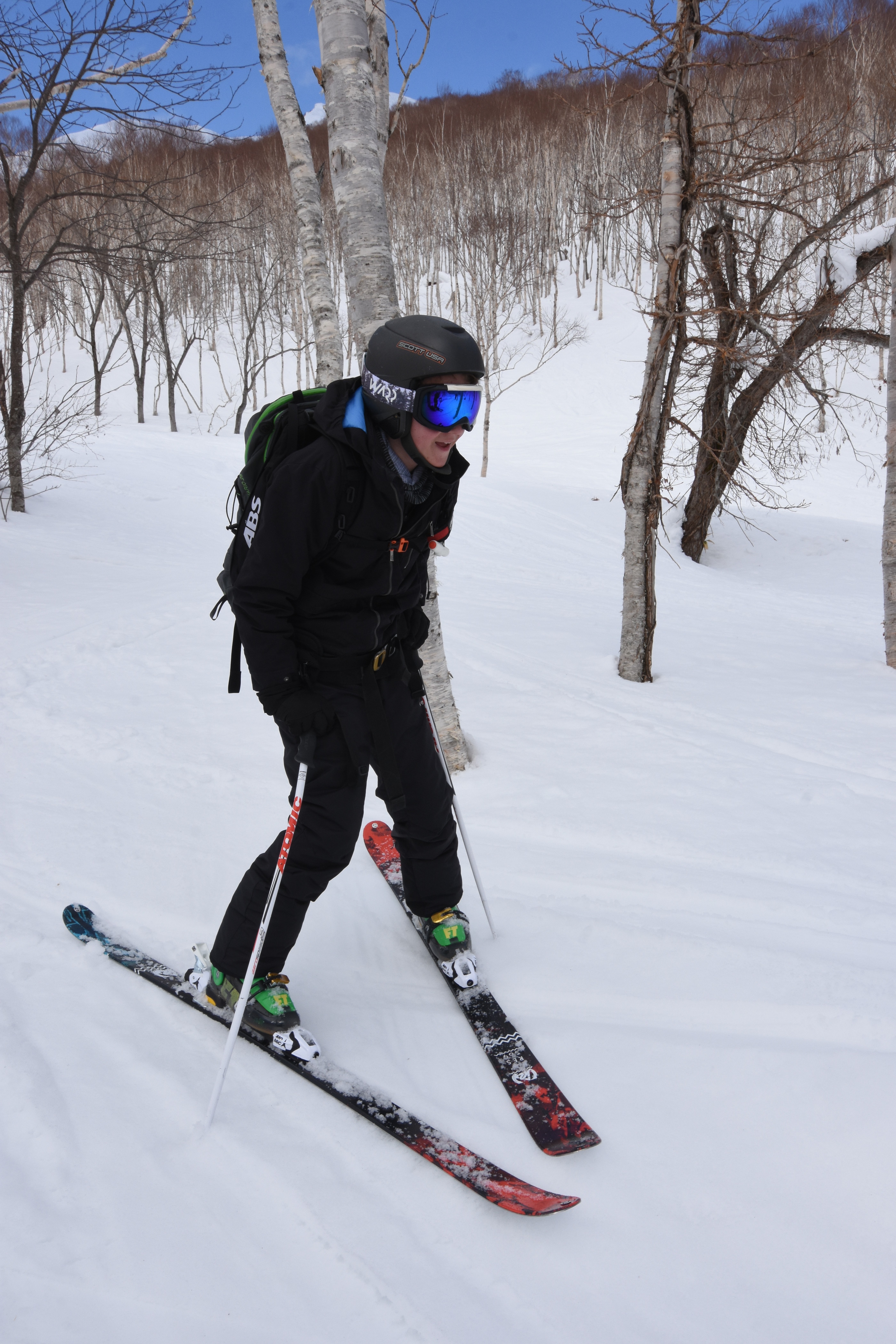 From the onsen one can either take a taxi back to the village (half an hour drive, cost about 40€) or skin up to a ridge 65 meter higher than the onsen, and then ski down to the ski area through forests and bushes.