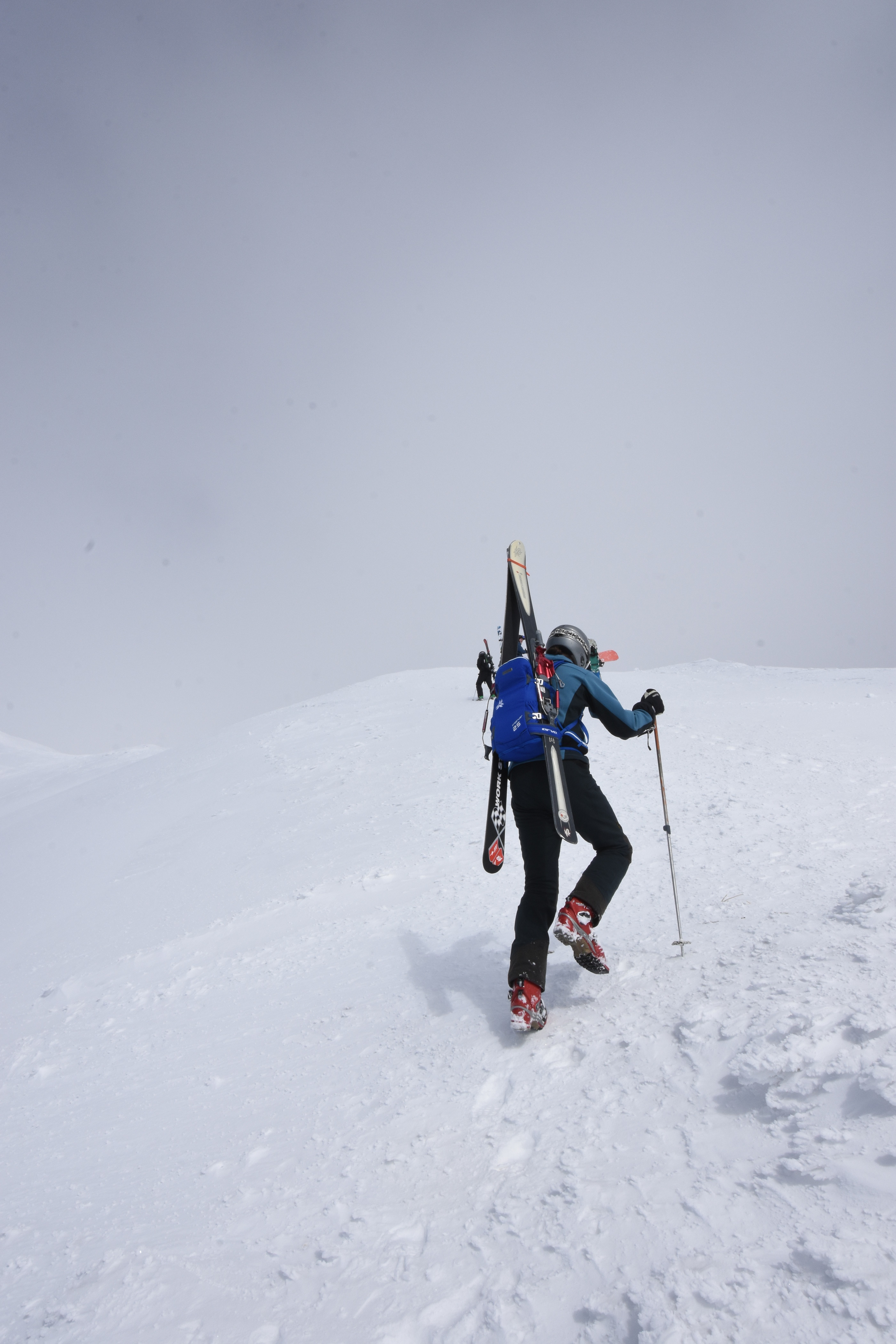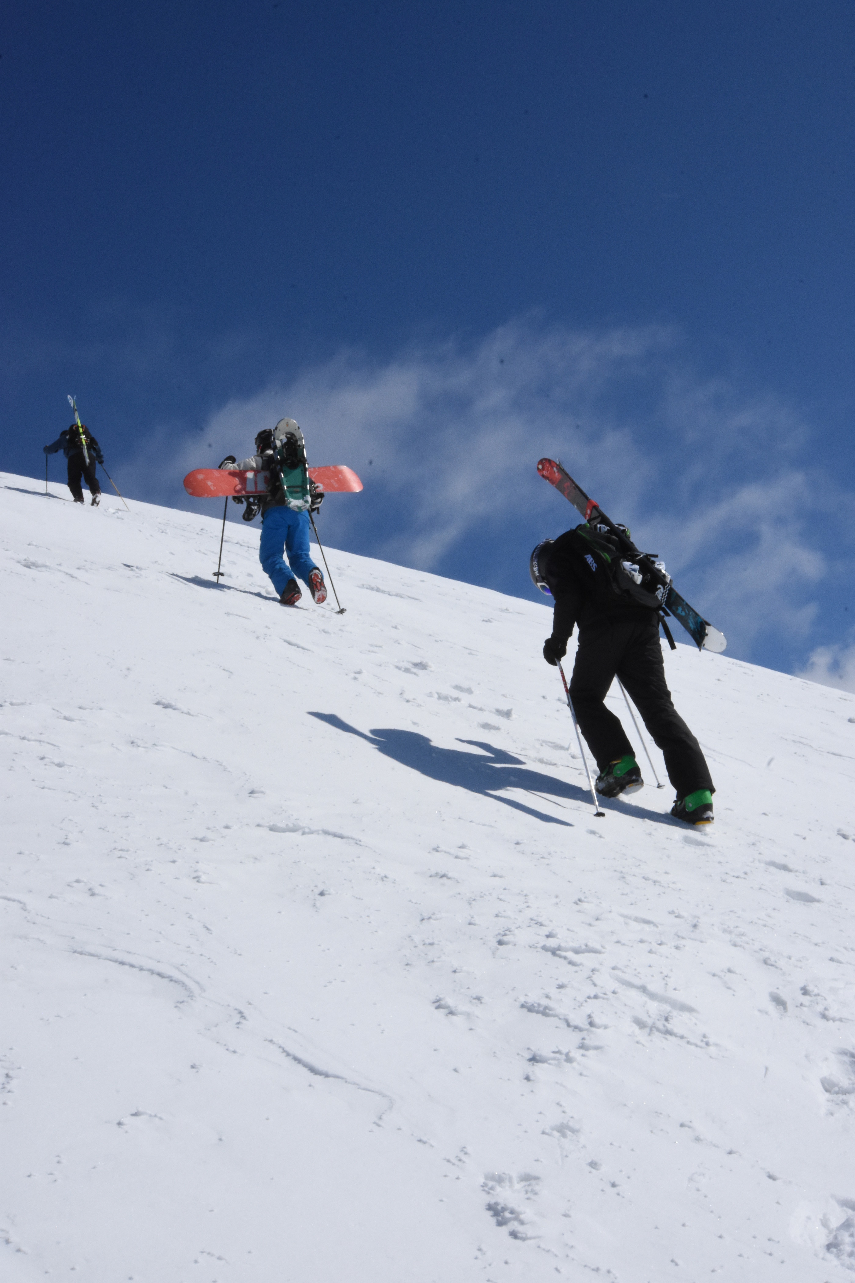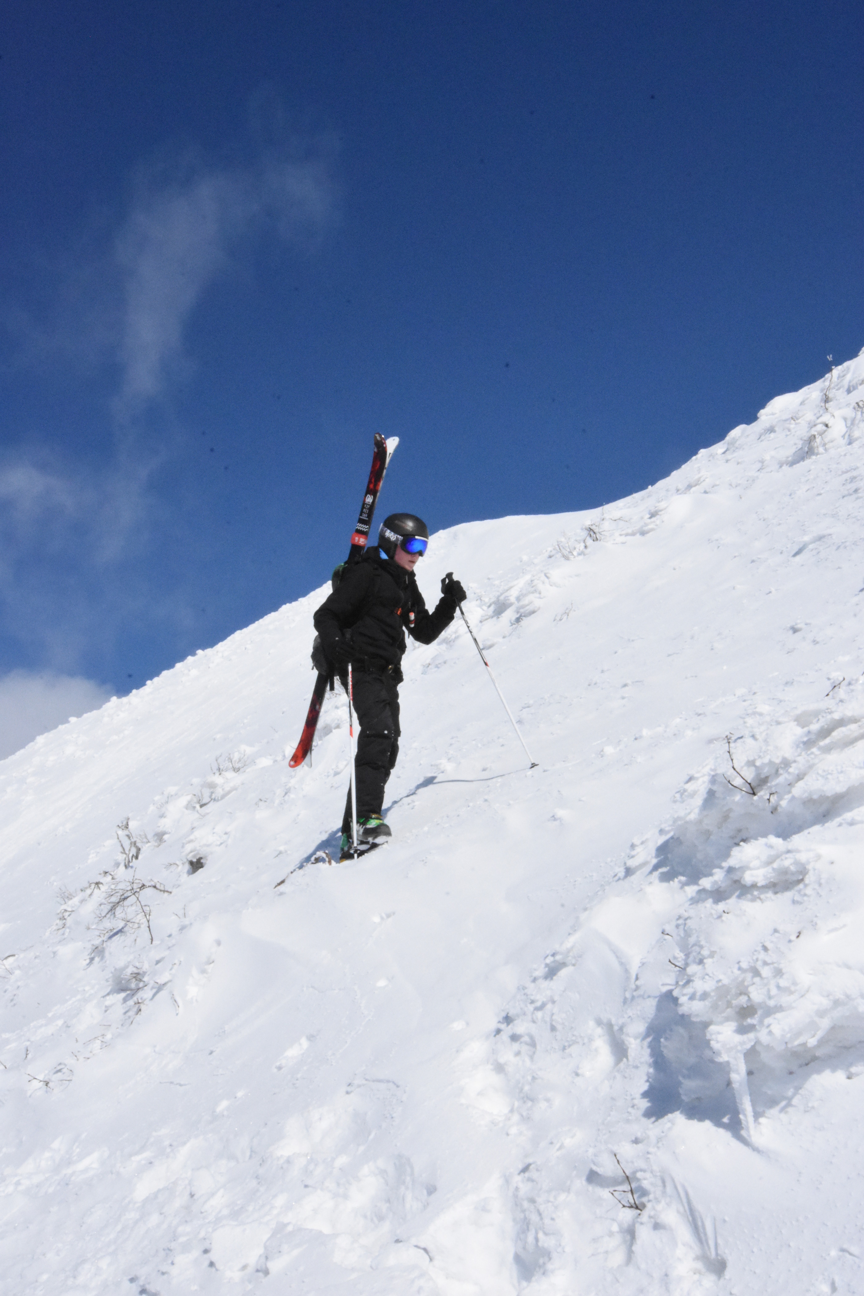 From the onsen one can either take a taxi back to the village (half an hour drive, cost about 40€) or skin up to a ridge 65 meter higher than the onsen, and then ski down to the ski area through forests and bushes.