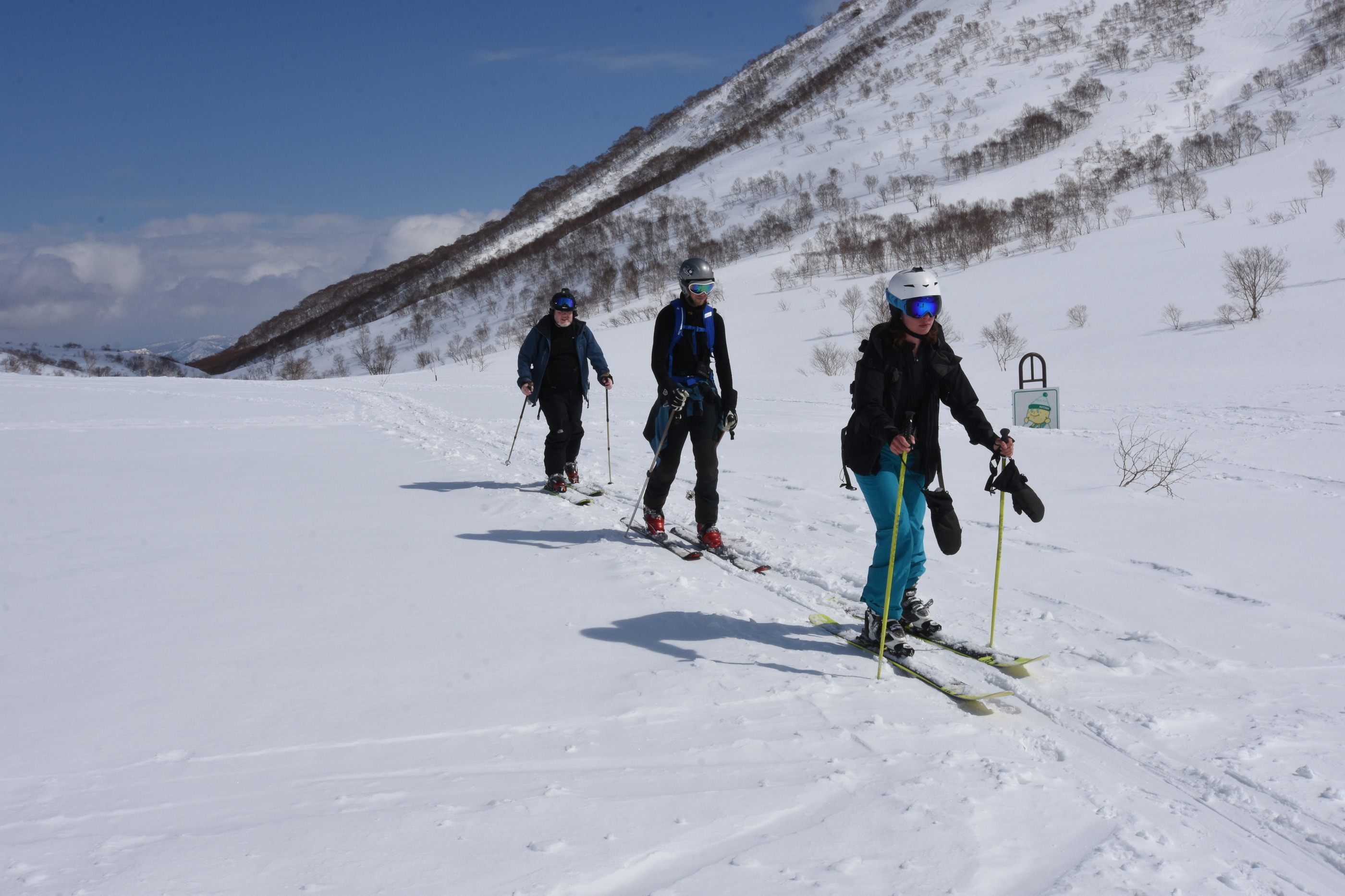 Onsens are of course popular in Japan. But this one was special, being in the middle of the mountains and hard to reach. In the summer, a road leads through the mountains. In the winter, the road is closed. You can still reach the Goshiki Onsen via the tunnel side of the road, but not continue further. But most people visit the Goshiki on skis. We started this journey from the Annupuri ski area's high point, at 1152 meters, and proceeded to climb 150 meters higher to the top of Mt. Niseko Annupuri. In Niseko, you can only access the backcountry via special gates, and to get to the top you should use either gate G2 or G3. The former requires slightly more climbing, but much nicer views and mountain environment.
