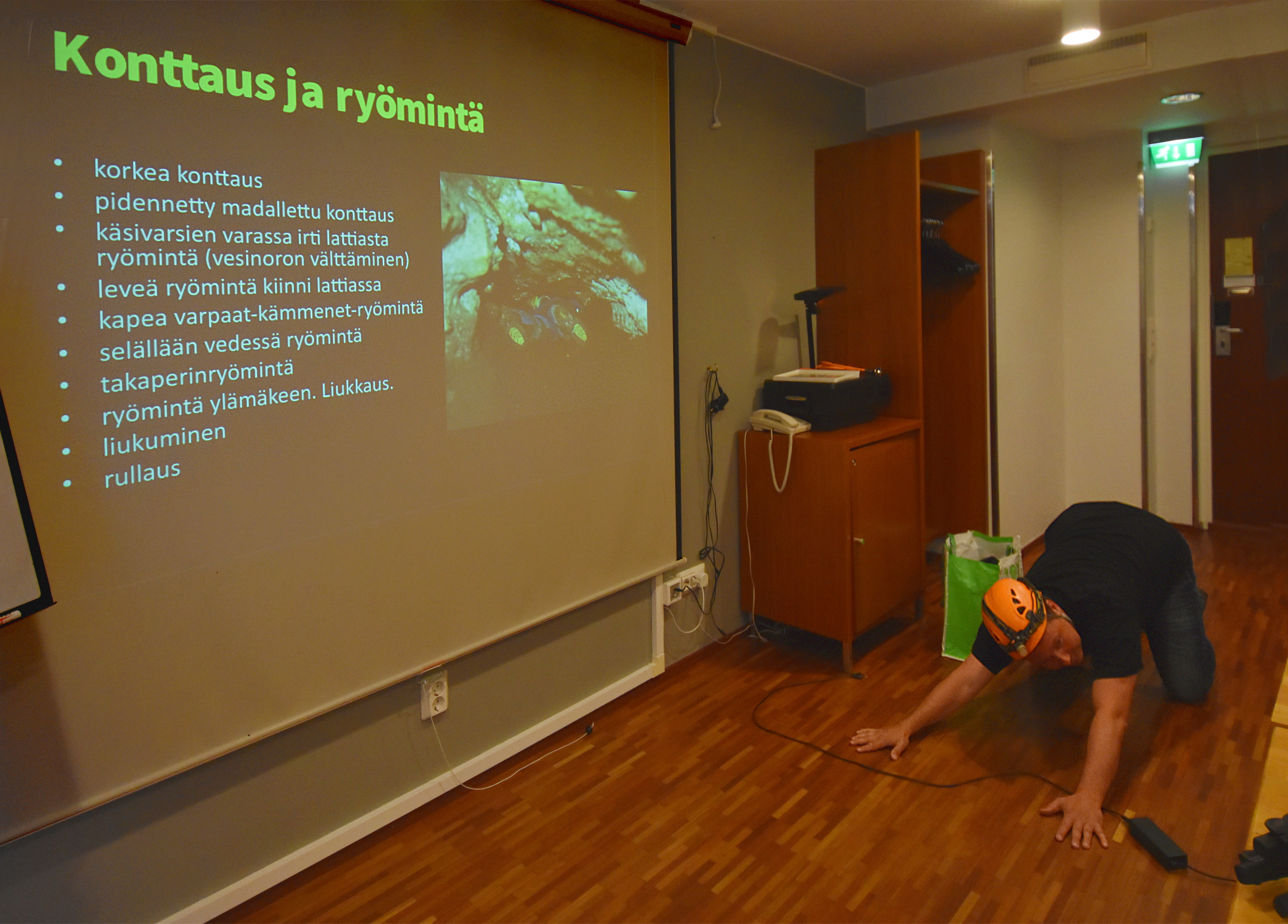 The Finnish Speleological Association arranged a basic caving course in Turku in June. The course started from the basics, like crawling. A slide to teach crawling! And walking, for that we had another slide.