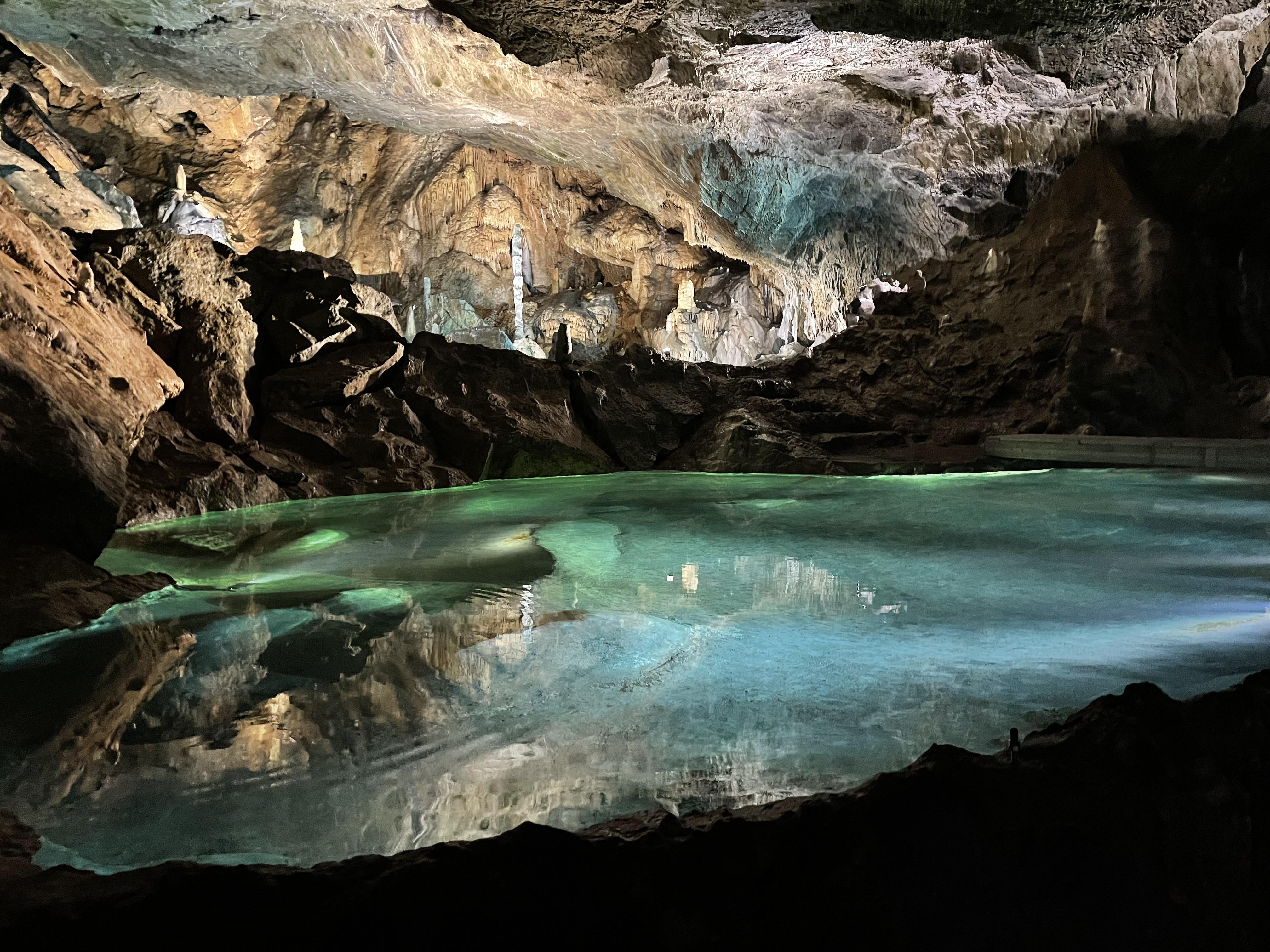 The cave itself is about 2 kilometers long total, the showcave part being maybe few hundred meters. This is a karst cave, i.e., has stalactites, flowstone, etc. The most impressive feature of the cave is the biggest hall, named after Goethe: the Goethe hall & Wolfgang Lake. Concerts and events are held here regularly.