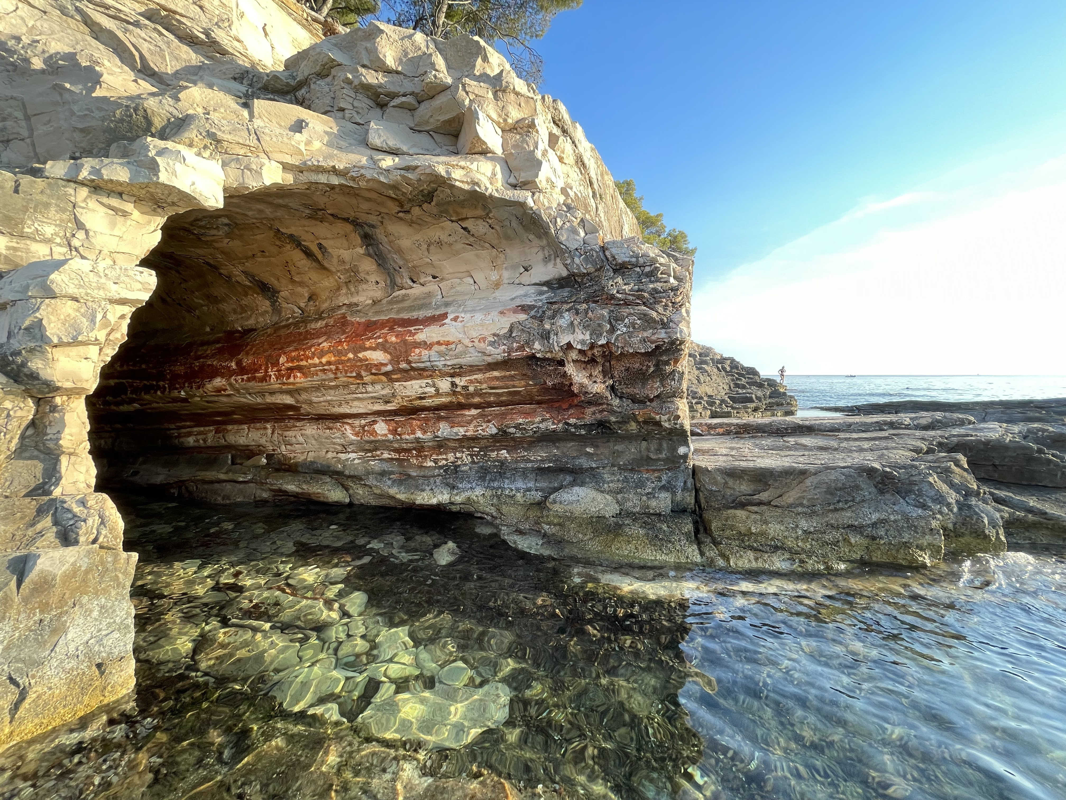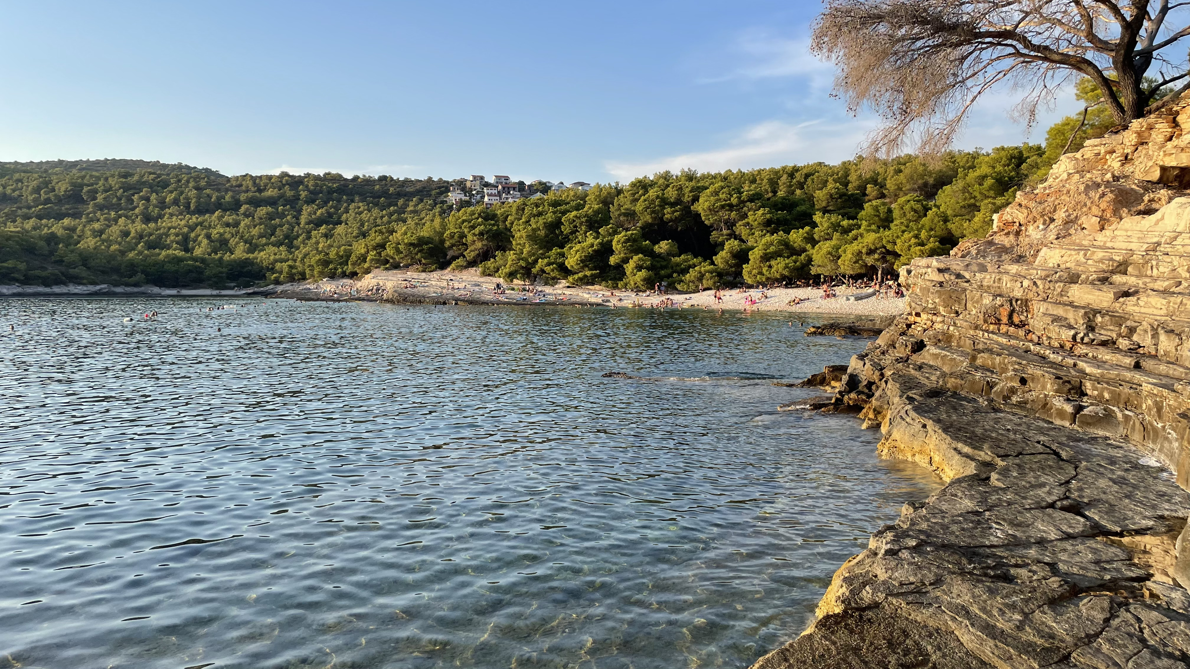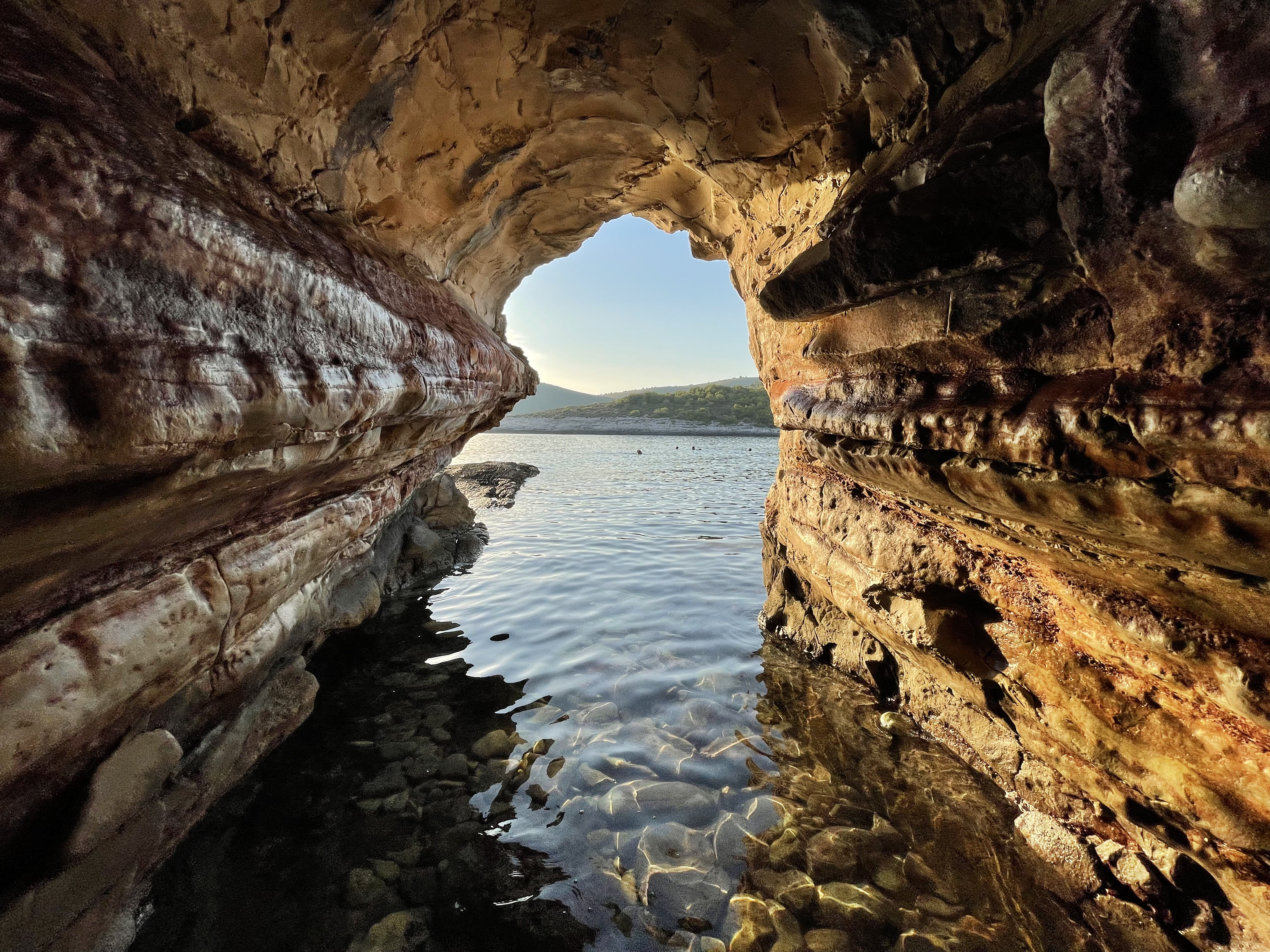 The Srebrna Beach is a popular, rocky beach in the limestone layer of on the south side of the Vis island in Croatia. Beach caves are a very frequent occurrence on Croatia's coast, but for me - coming from a cave-poor country - they are always a wonder. There's a very nice straight, tunnel-like beach cave on the left side of the Srebrna beach.