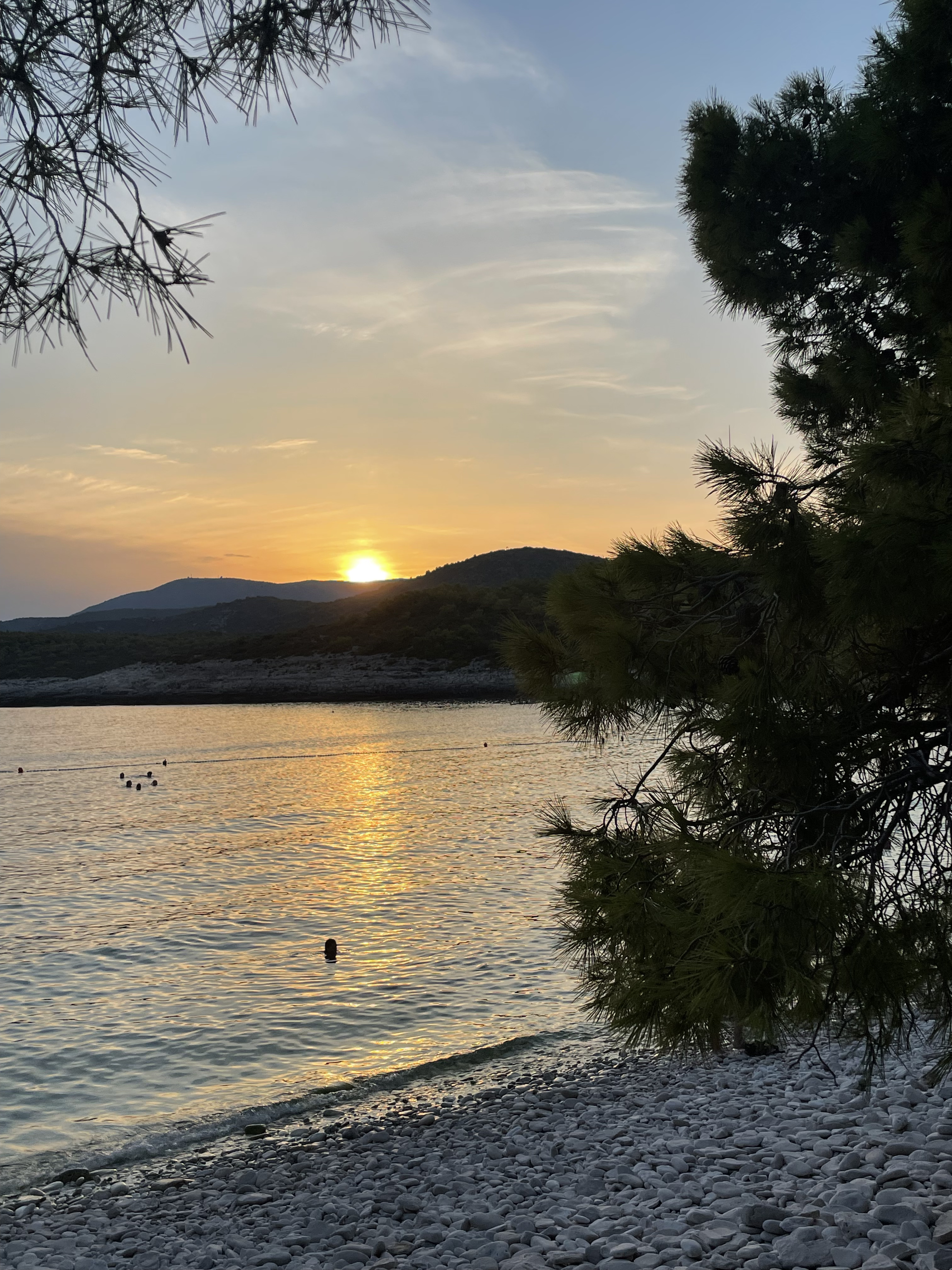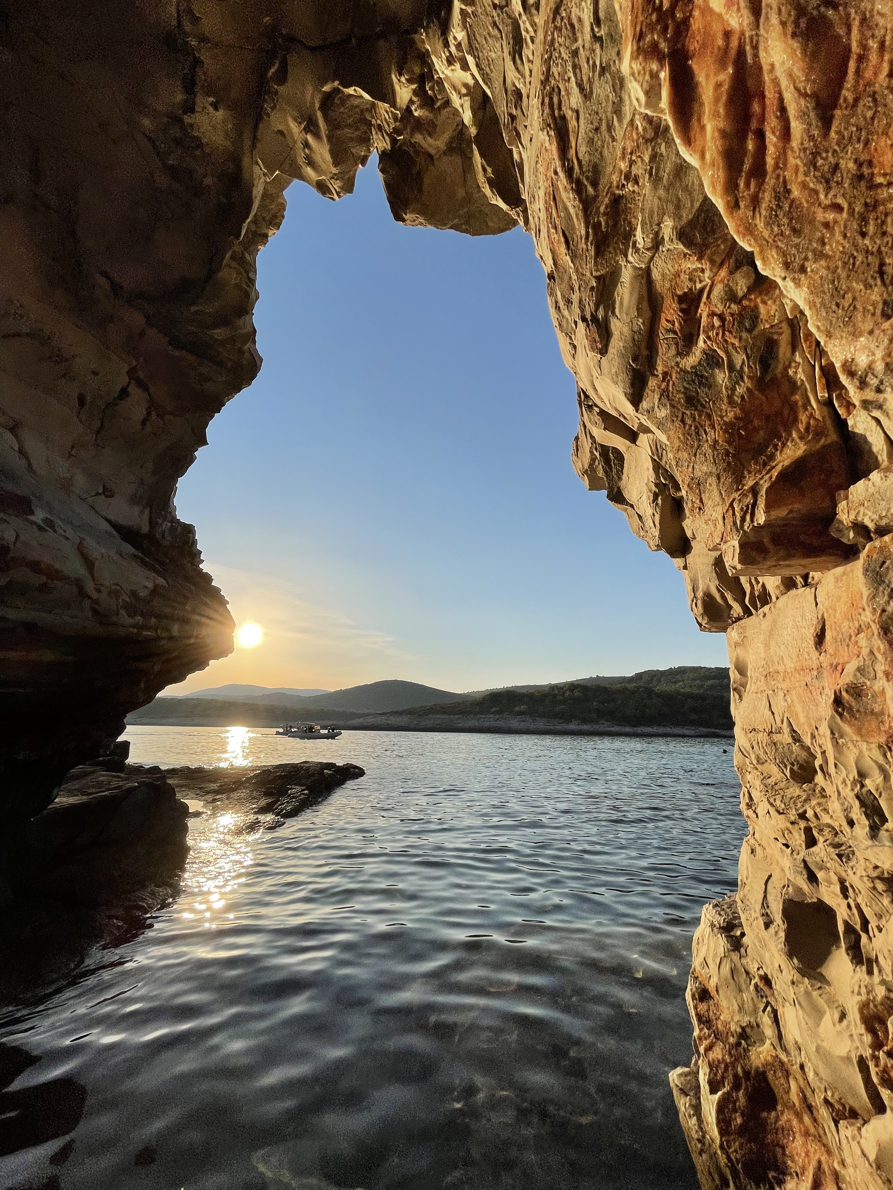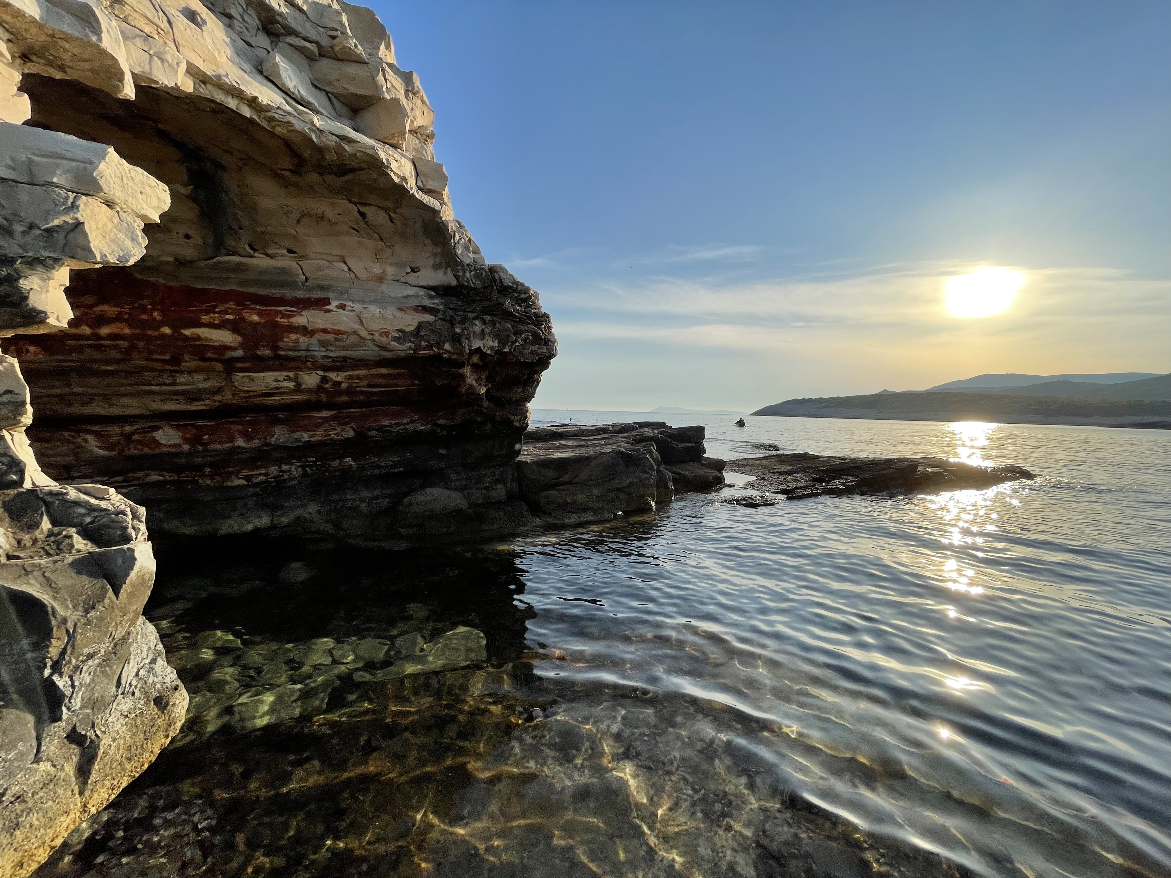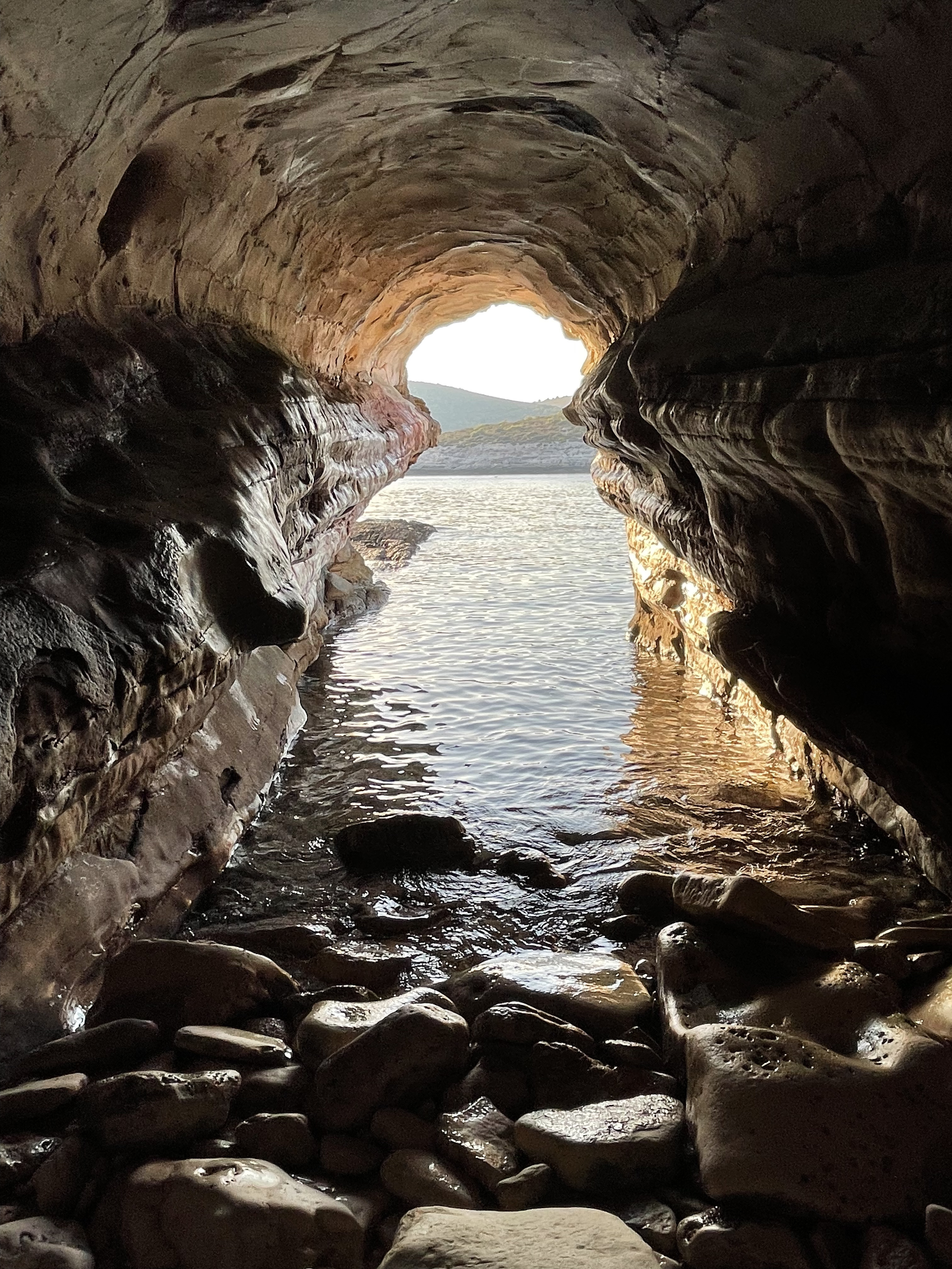 The Srebrna Beach is a popular, rocky beach in the limestone layer of on the south side of the Vis island in Croatia. Beach caves are a very frequent occurrence on Croatia's coast, but for me - coming from a cave-poor country - they are always a wonder. There's a very nice straight, tunnel-like beach cave on the left side of the Srebrna beach.