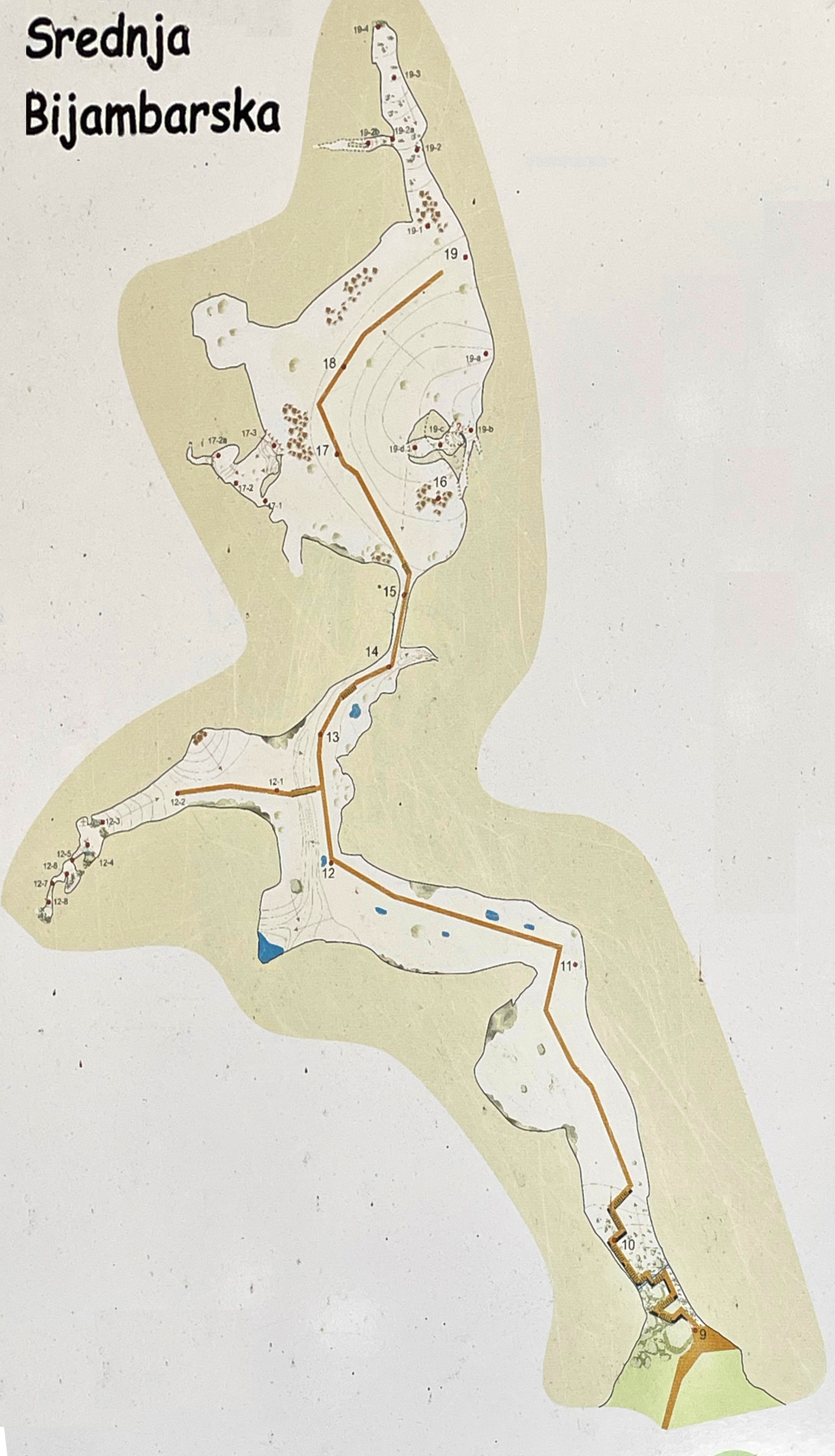 The biggest cave, Srednja Bijambarska is 553 meters long and at N 44.094563 E 18.503169. The smaller, Gornja Bijambarska, is 112 meters long and at N 44.094455 E 18.503559. Here are their approximate maps, as photographed on the site from the information signs: