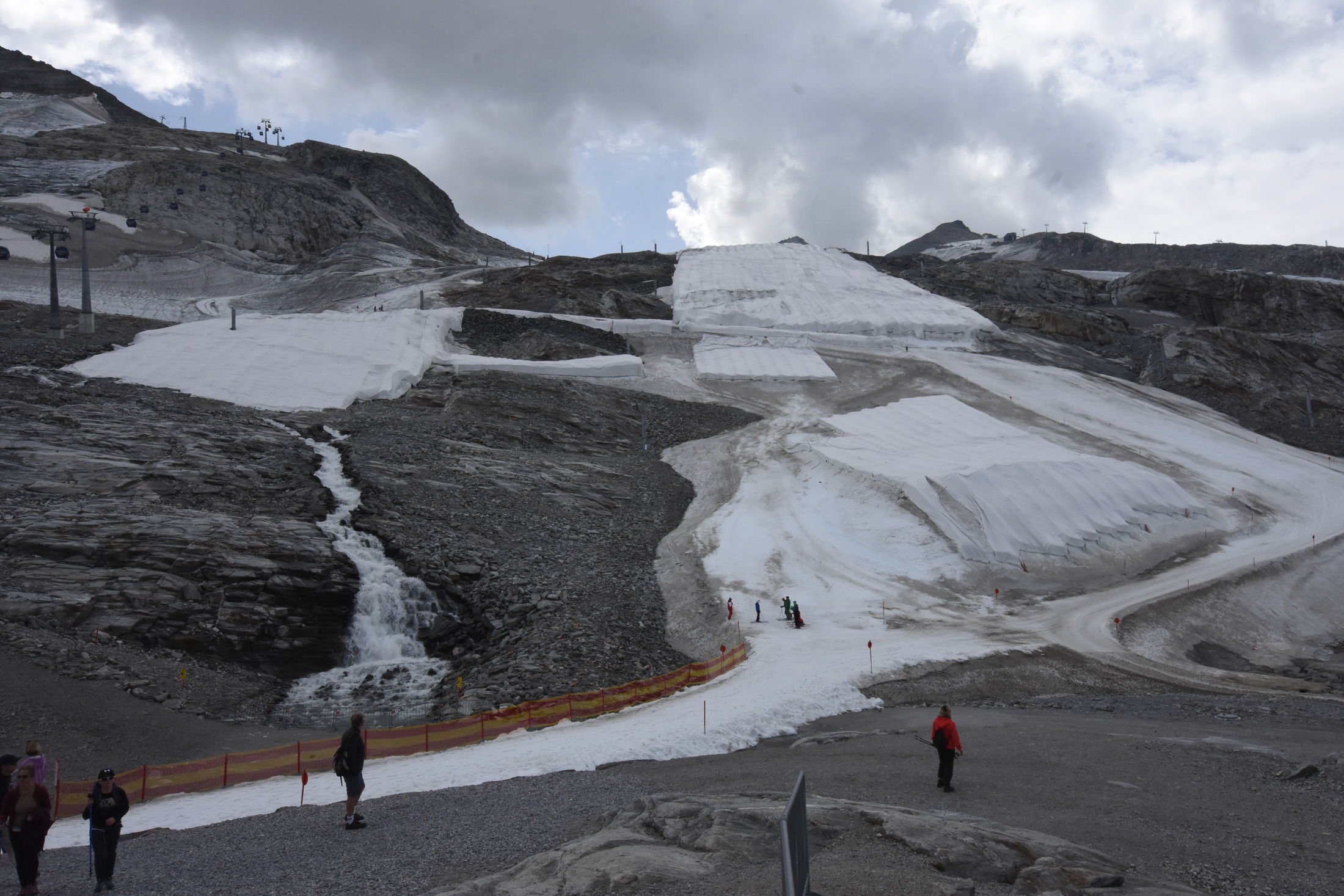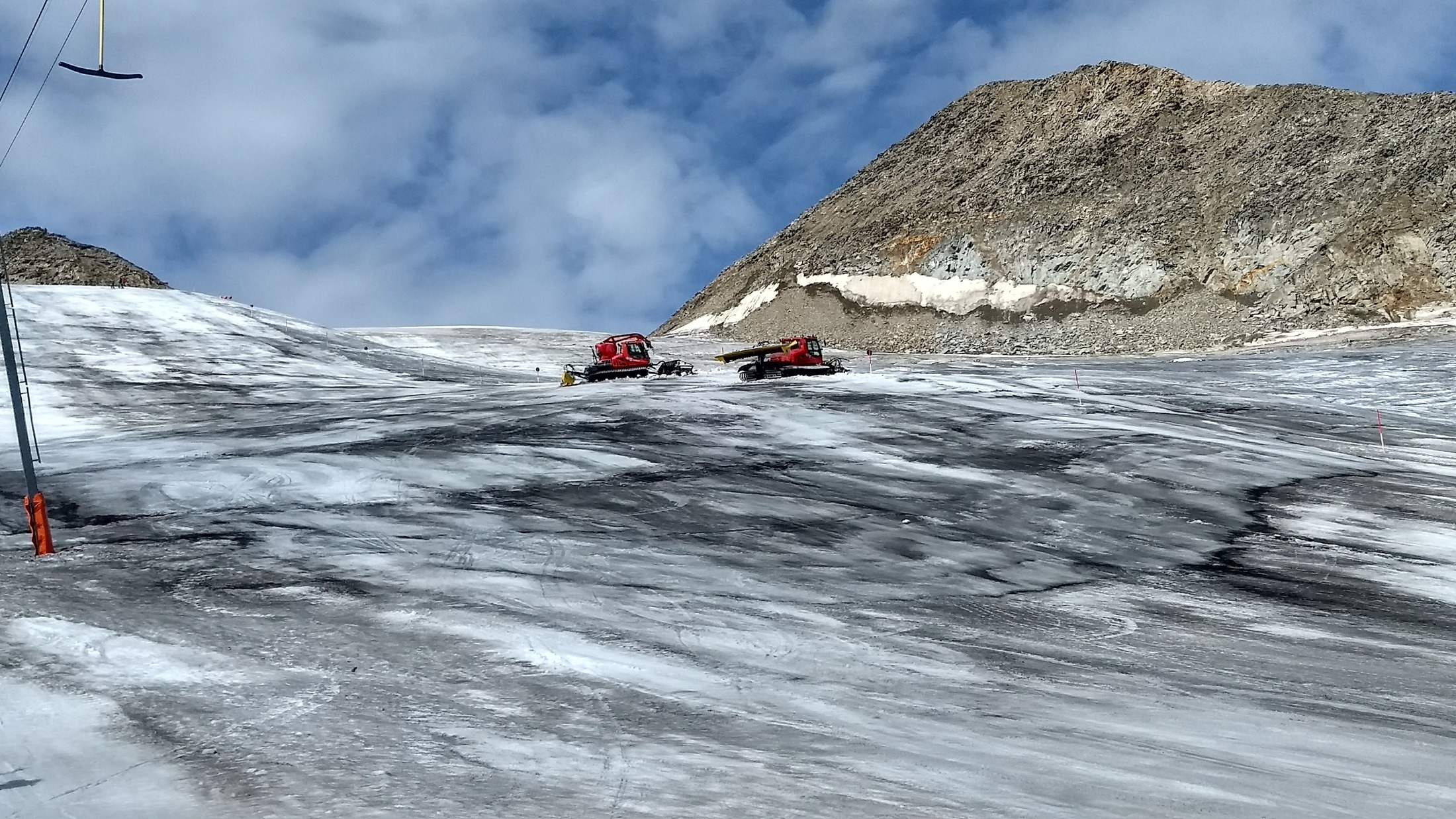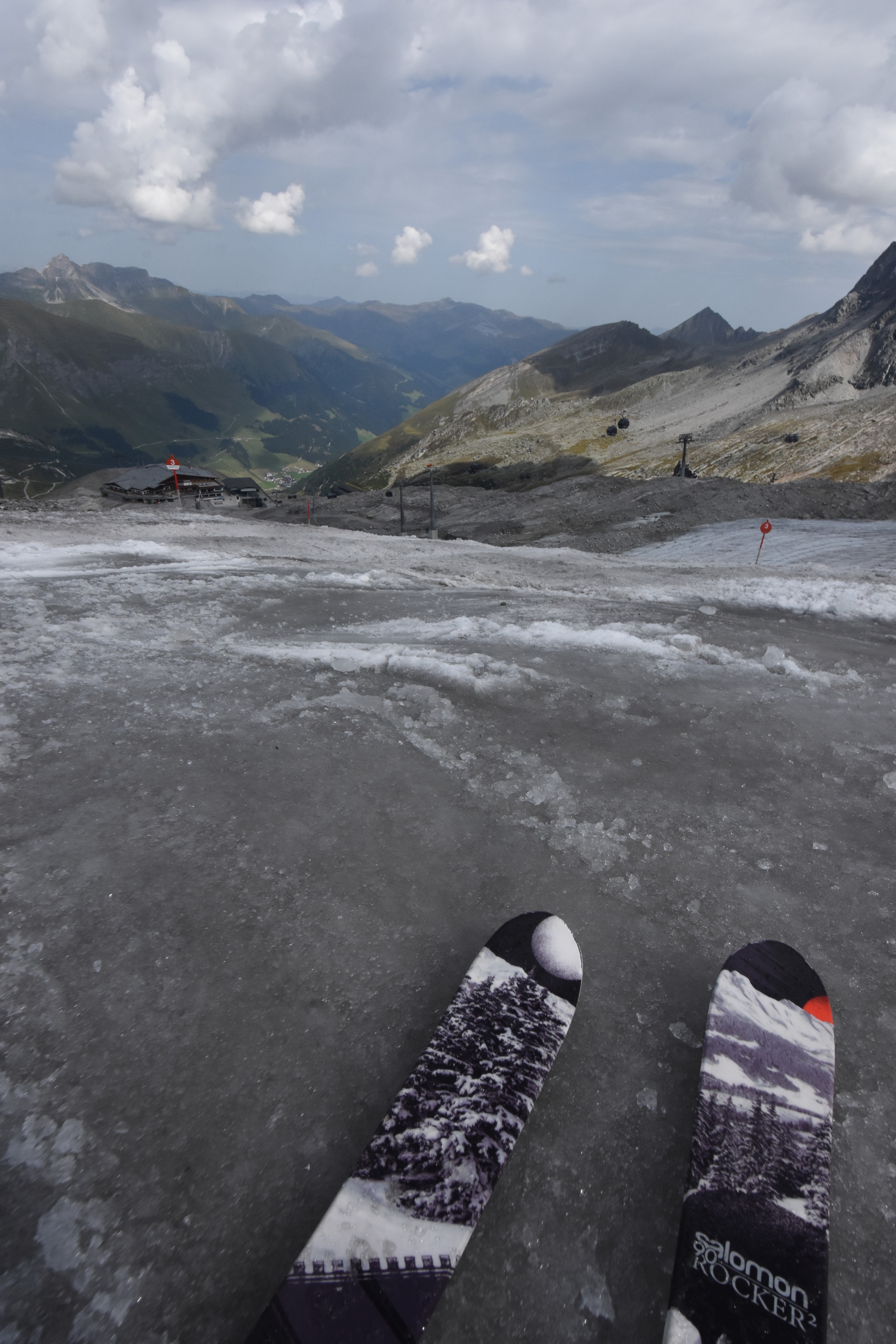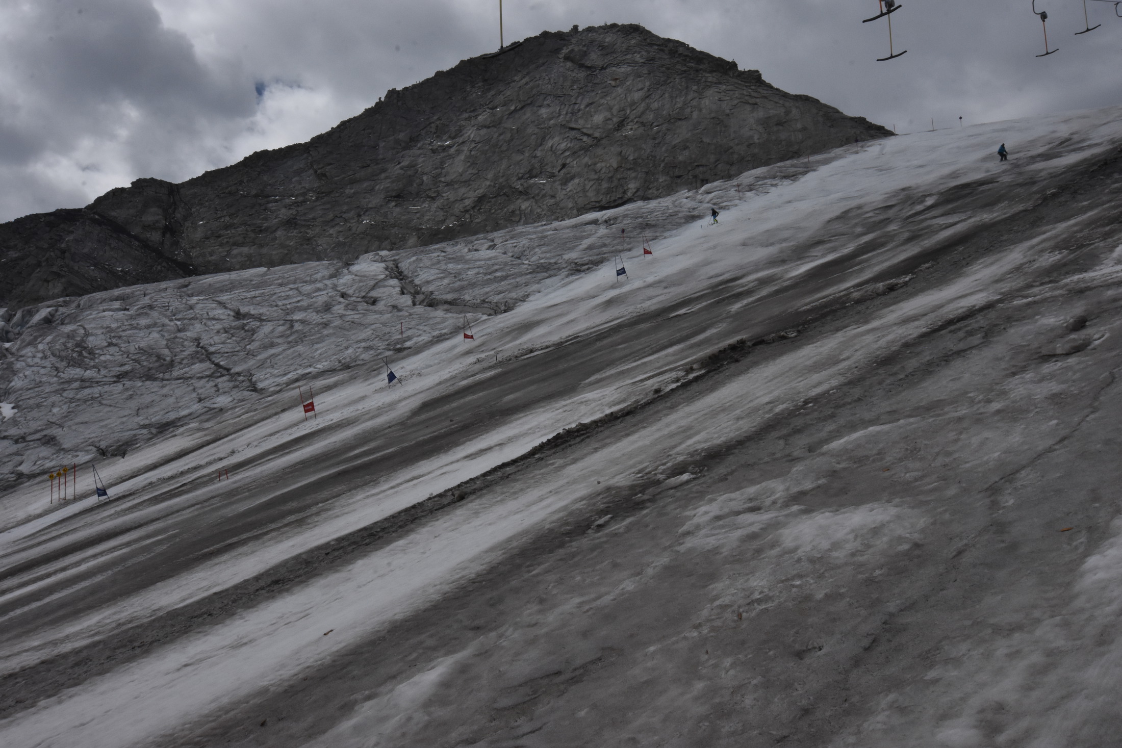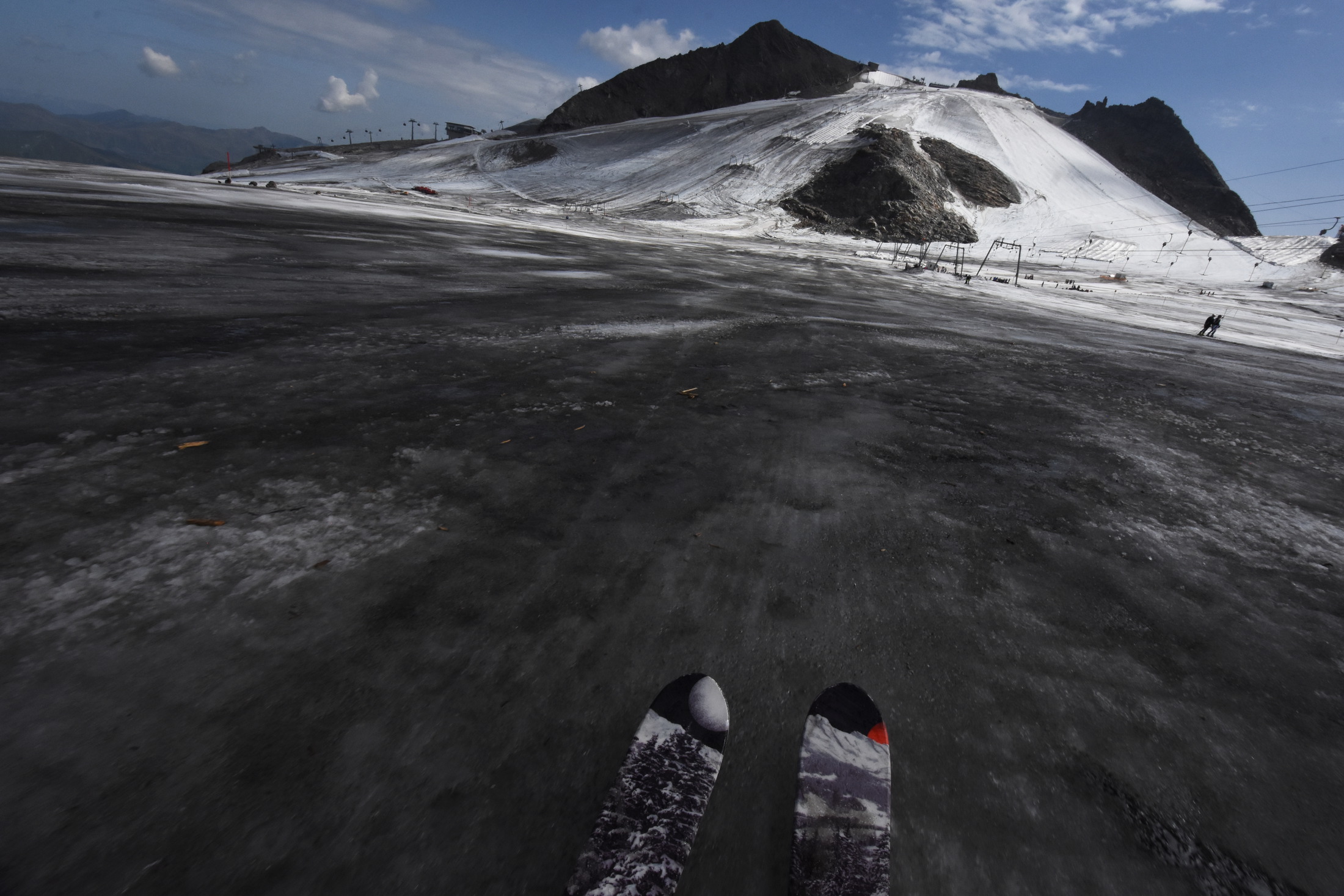 End of August is not great time to ski in the northern hemisphere. One of the few open places is Hintertux Gletscher in Austria. But even they have mostly melting ice and accumulation of dirt. Black snow.
