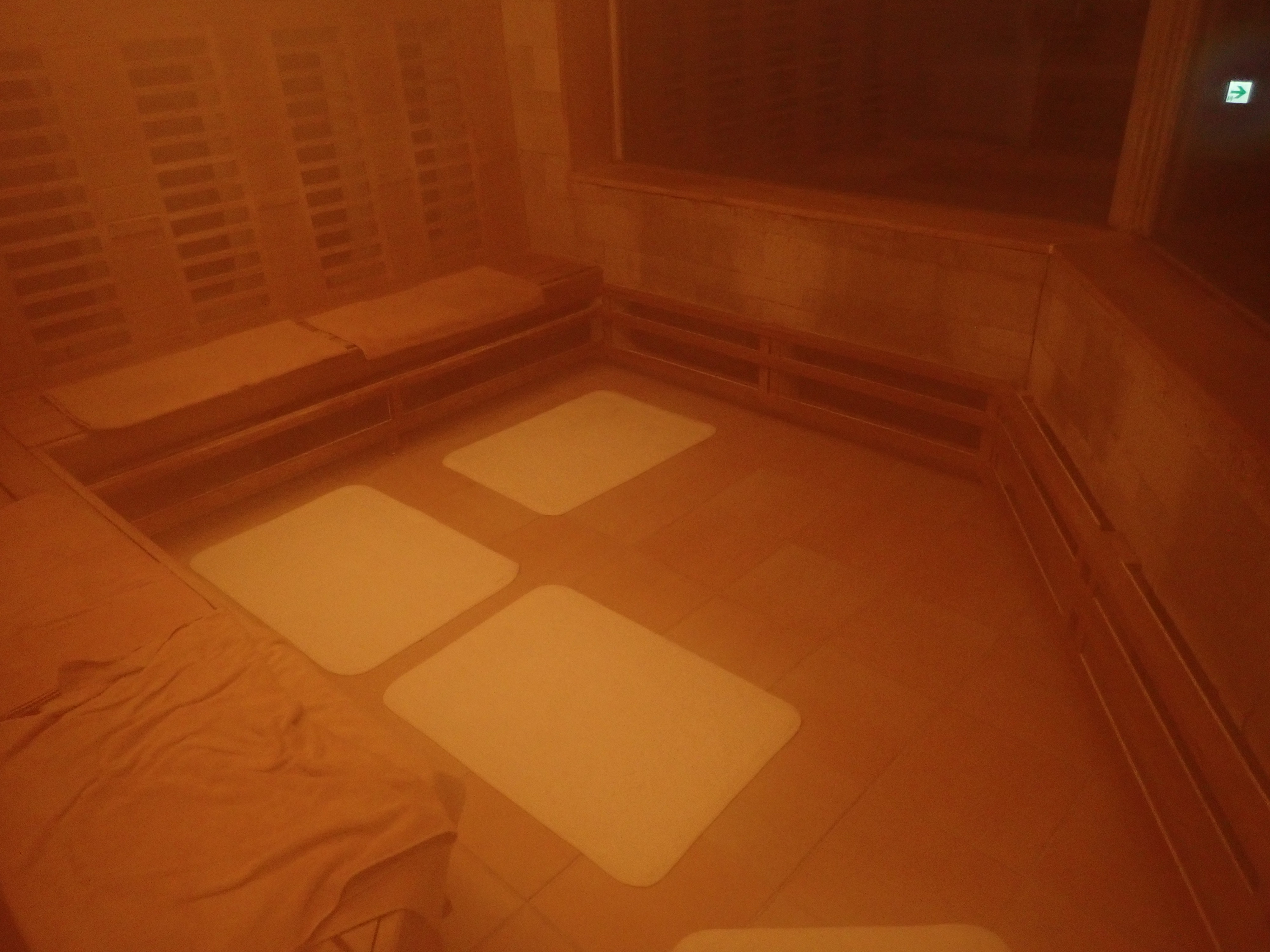 Huh, pretty hot weather. And hot sauna. Burning in both, almost. And thick carpets in the sauna! But what a view over the sea, Tokyo downtown, and the rainbow bridge.