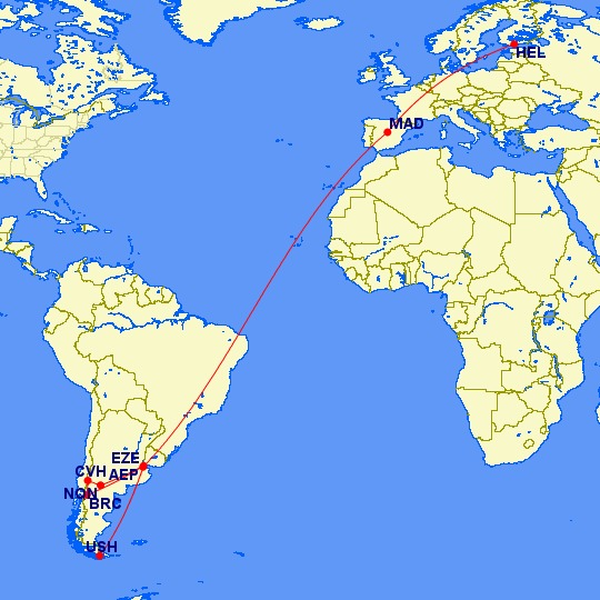 I have two sets of skis, two pairs of boots, crampons, ice axes, and other fun stuff with me, so regardless of the long way there I think it will actually be fun. This will be my first visit to Argentina, and among other places we'll visit Bariloche, the legendary ski and party destination for the Argentinians, a ski a volcano in Caviahue, and visit Ushuaia, the world's southernmost city. They also have the most southern bar, unless you count the one in Antarctica.