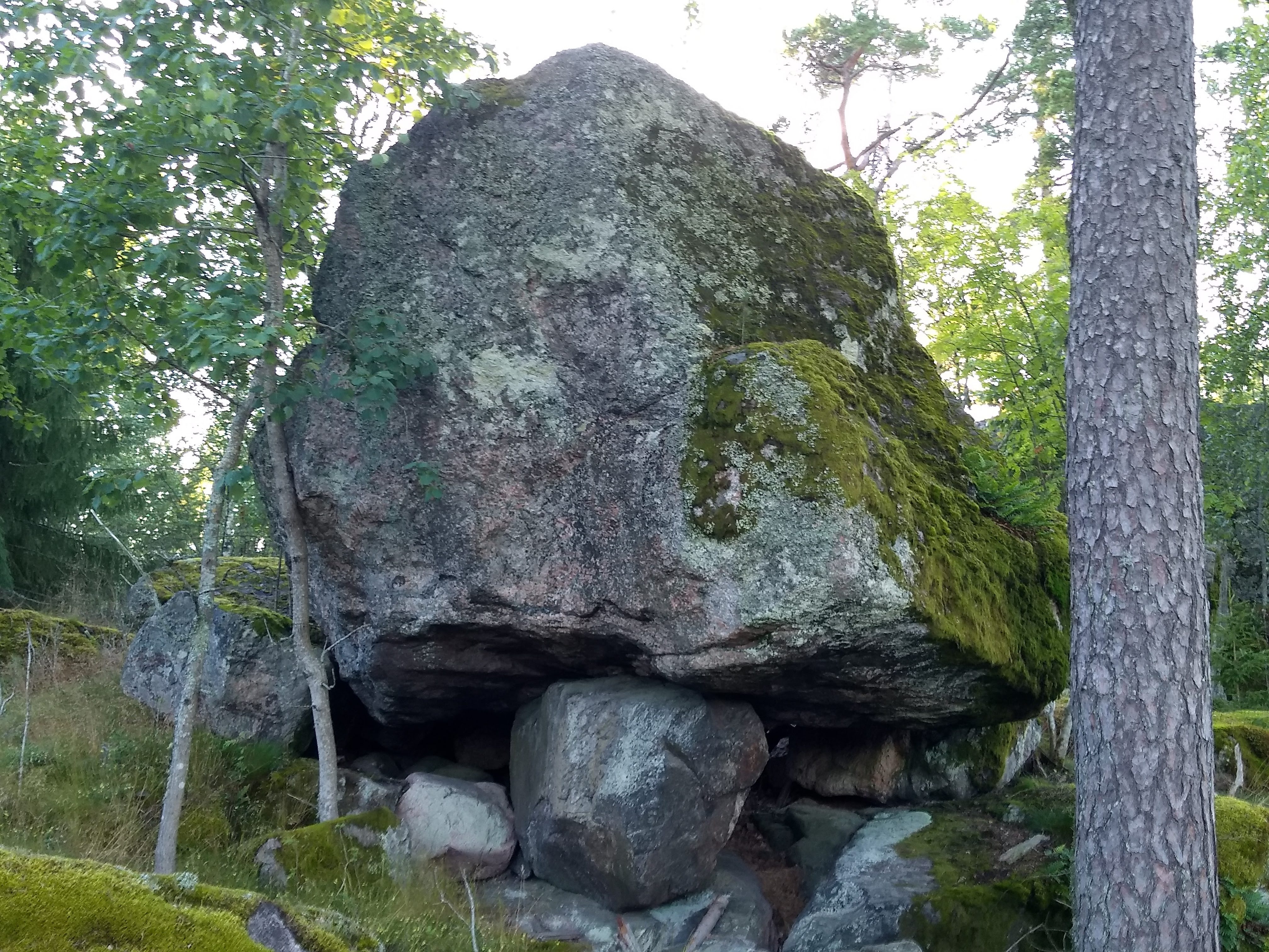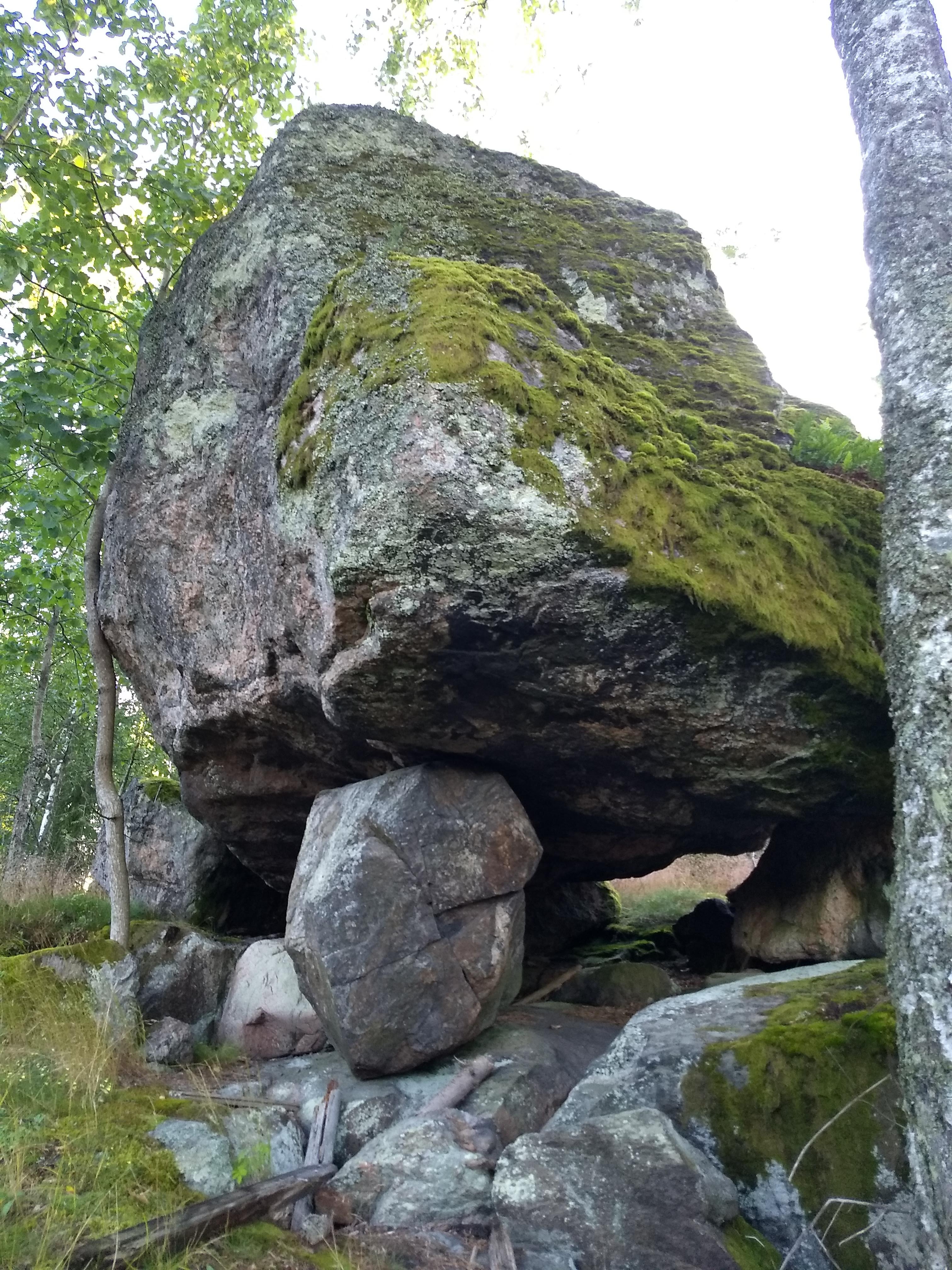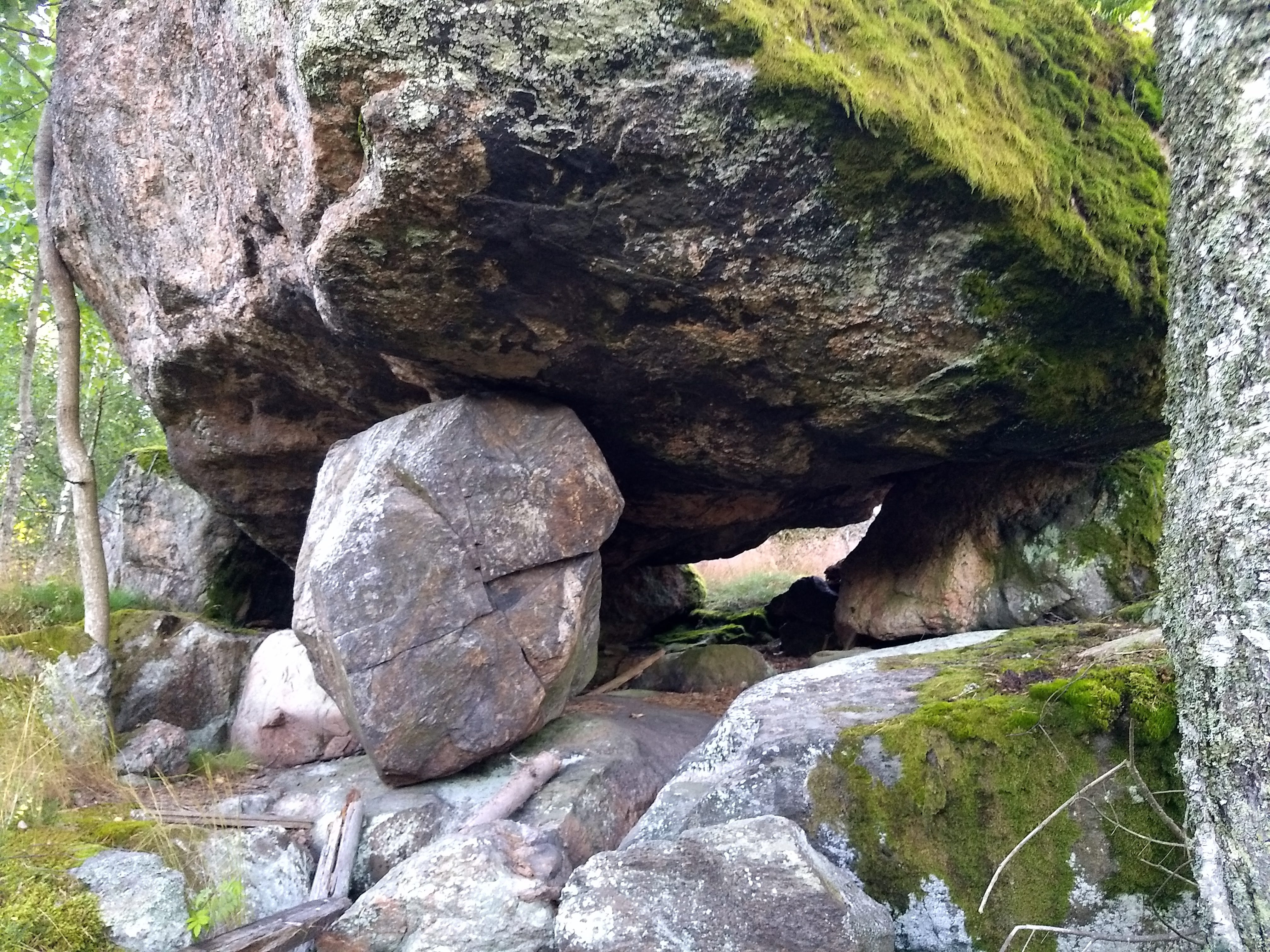 My swim at the Träskbyträsket yielded an unexpected benefit: a boulder cave. A huge piece of rock standing on four other rocks, as if by design.
