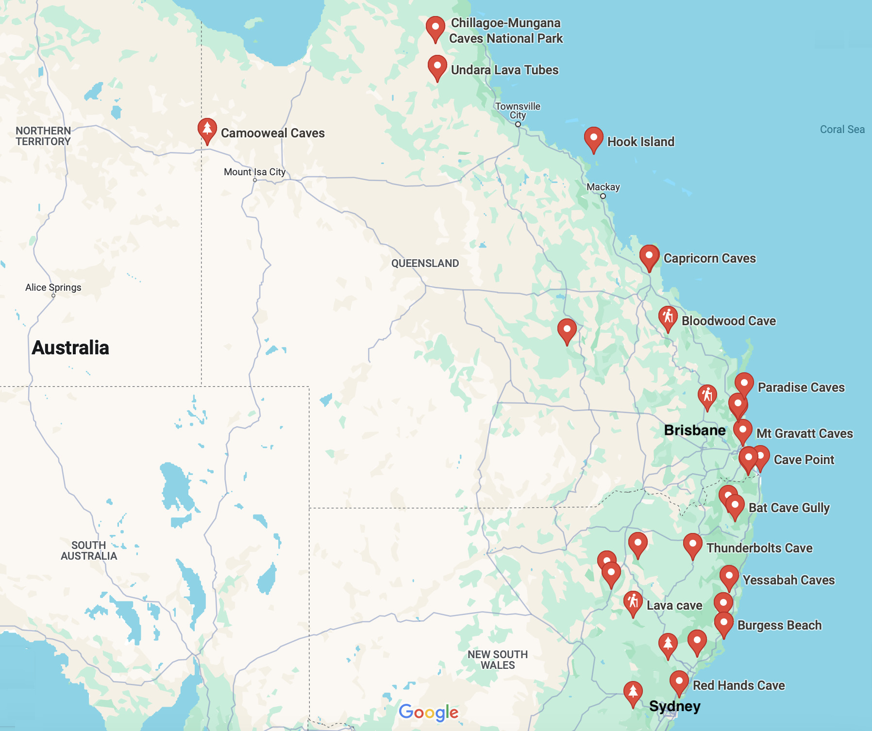 Below you will find my Google Maps list of caves that I've found within the 10 hour or so driving range from Brisbane. Some a bit further.