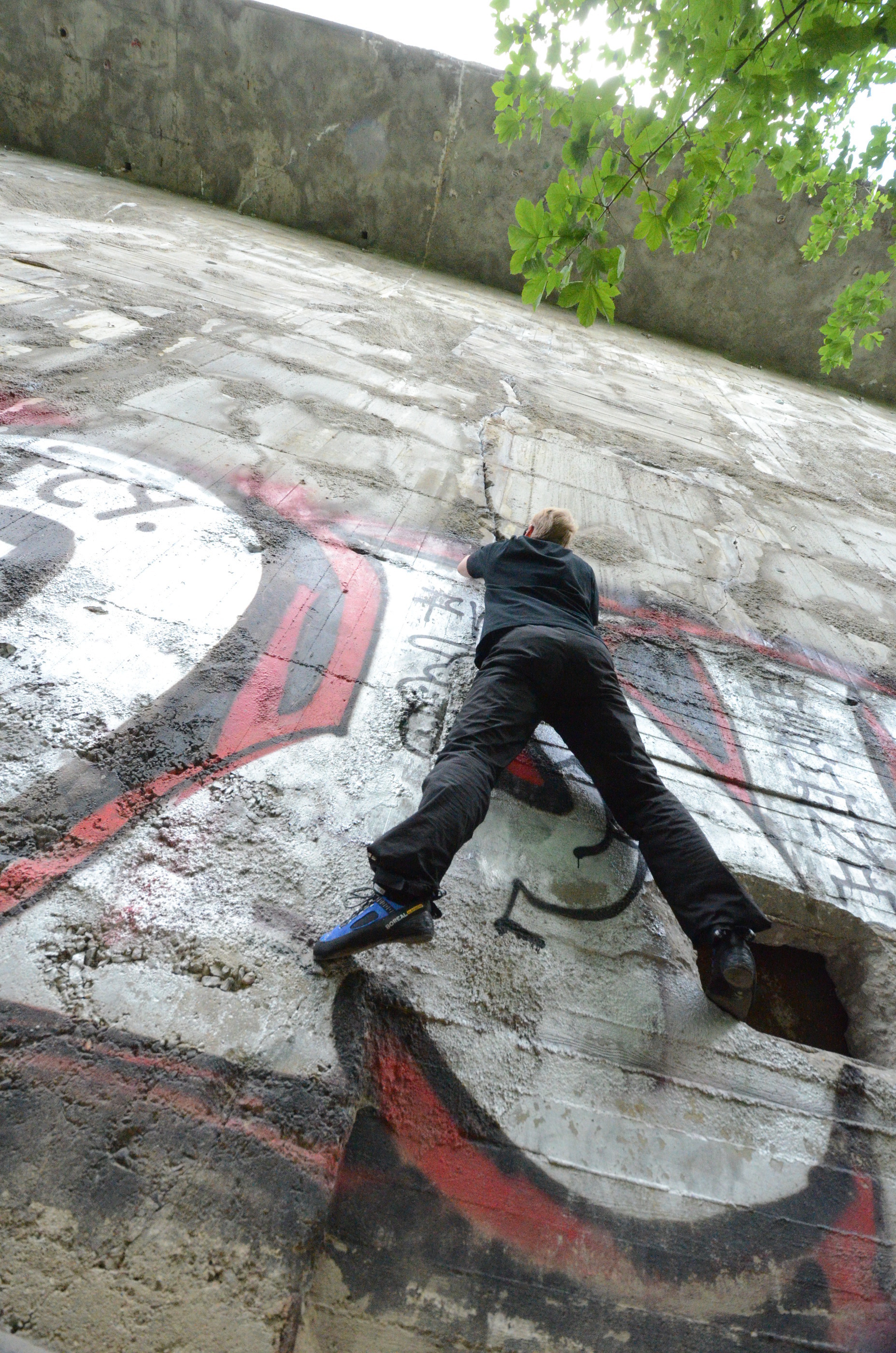 I am in Berlin, at the Humboldthain Flaktürme, in the remains of an enormous World War II anti-aircraft tower and bunker. It is a popular climbing site in this otherwise flat city. And the climbing is good.