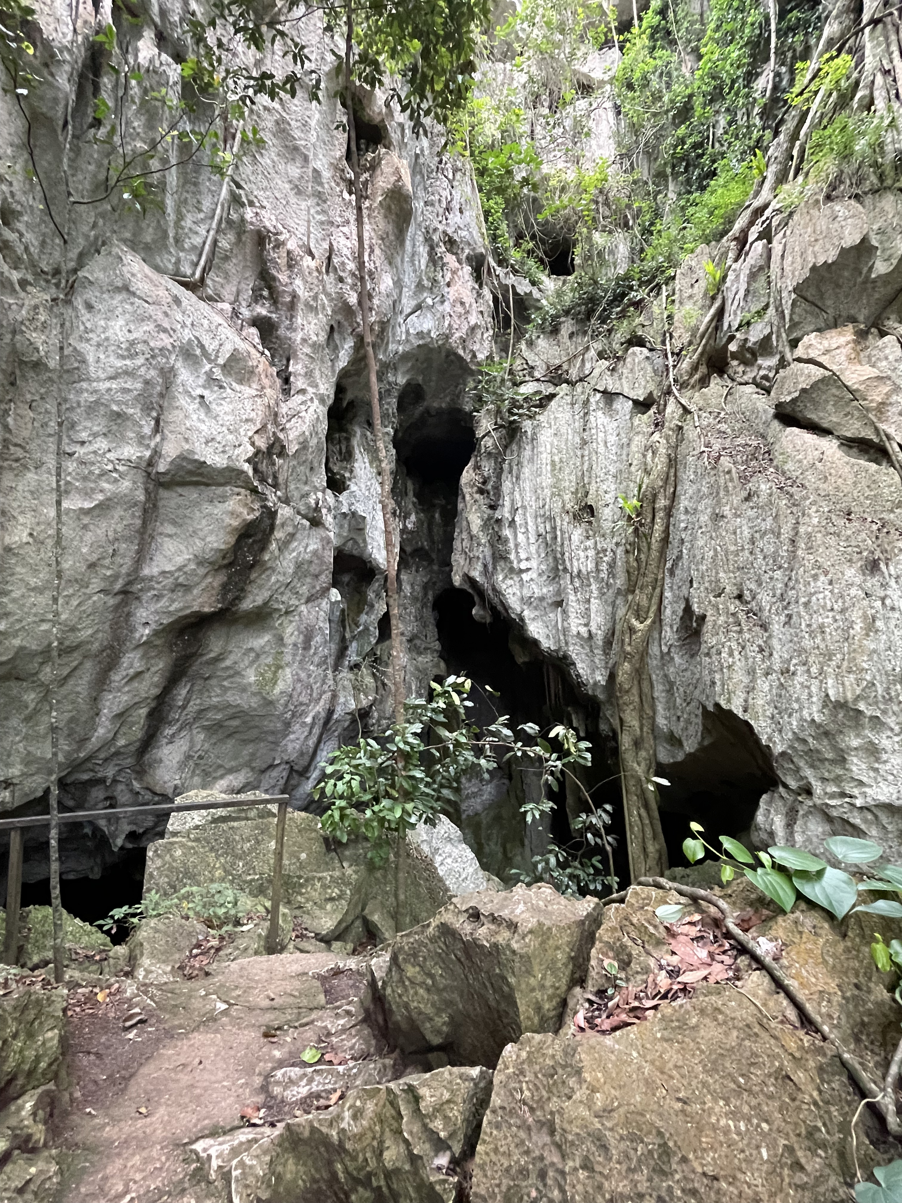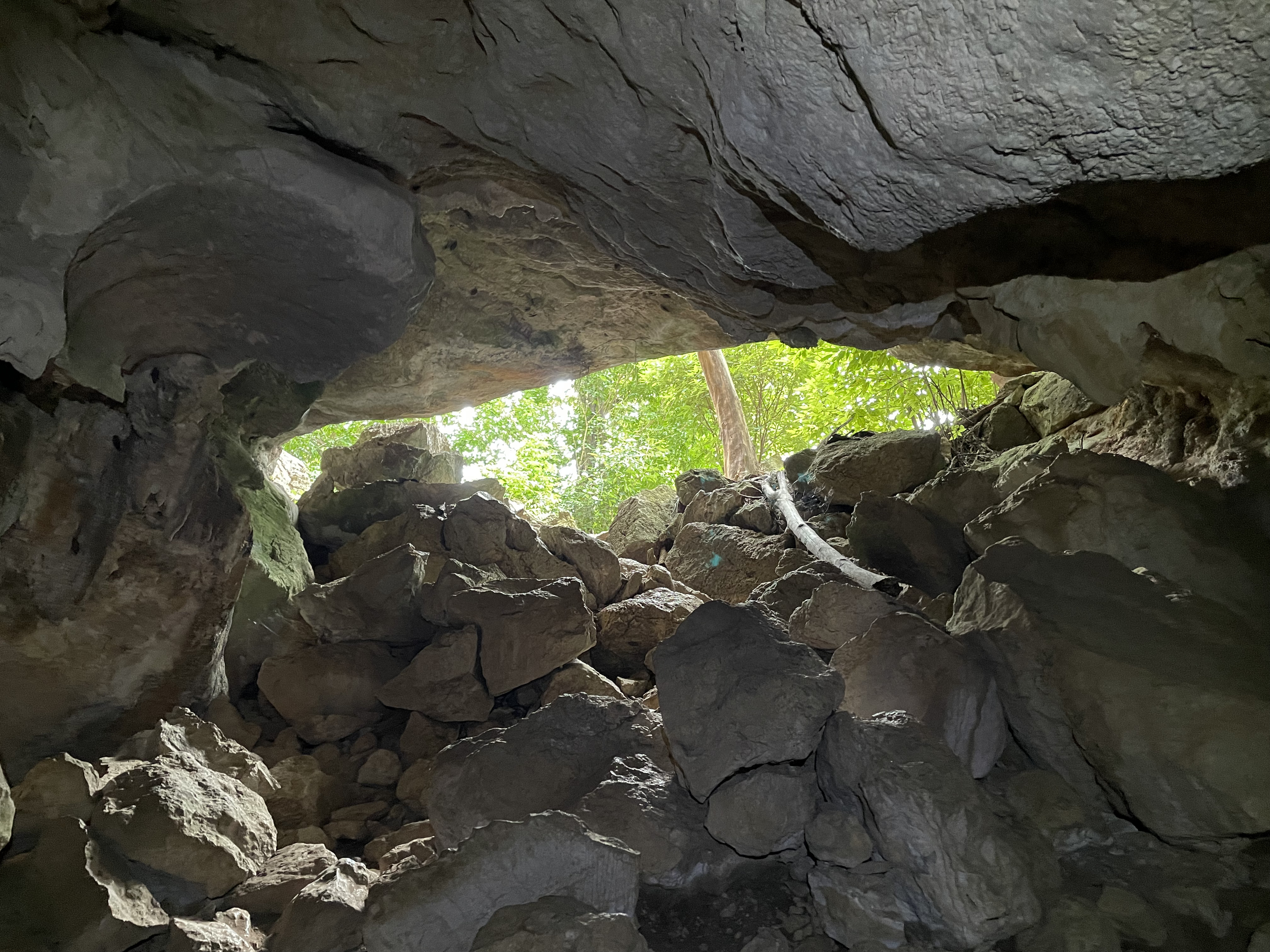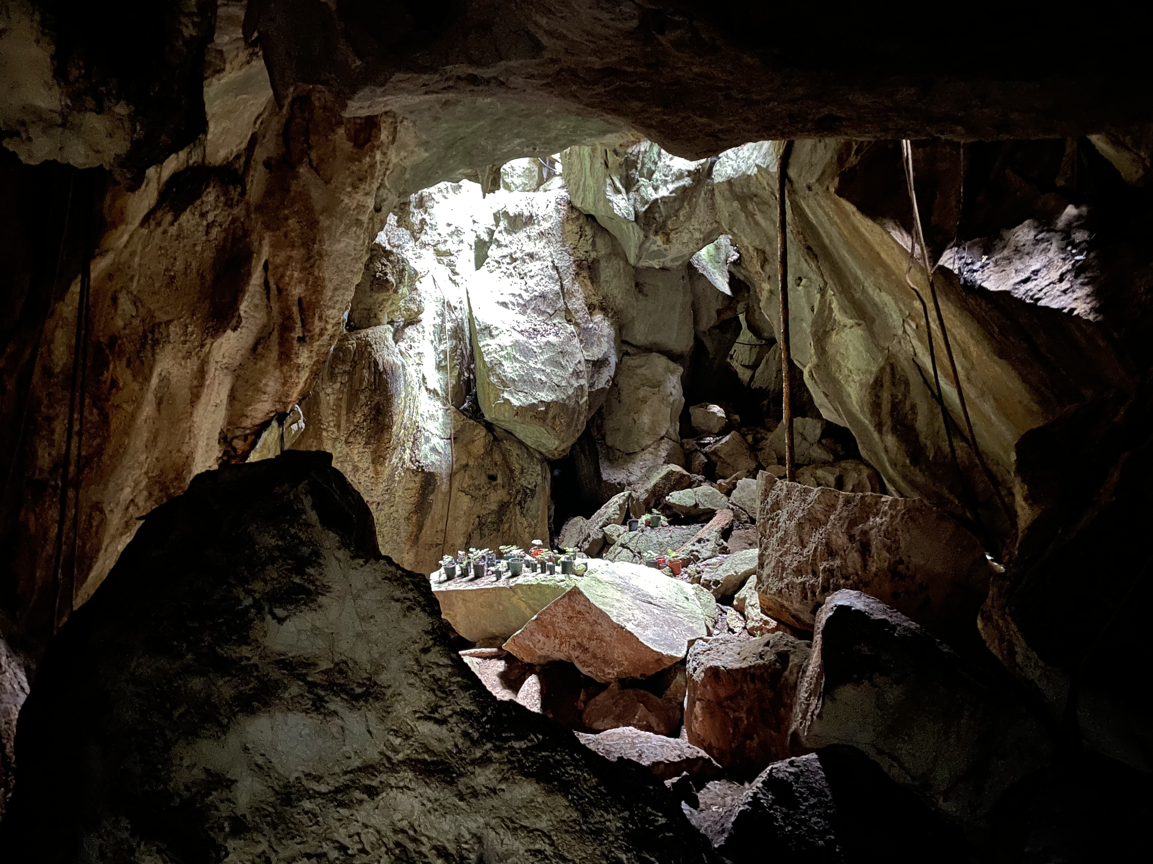 Ferns growing in pots inside the cave, moved back here after being rescued elsewhere post-wildfires: