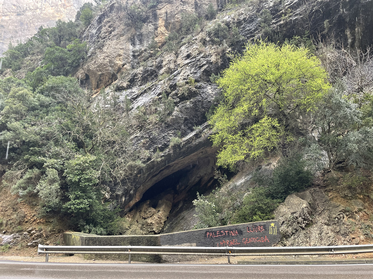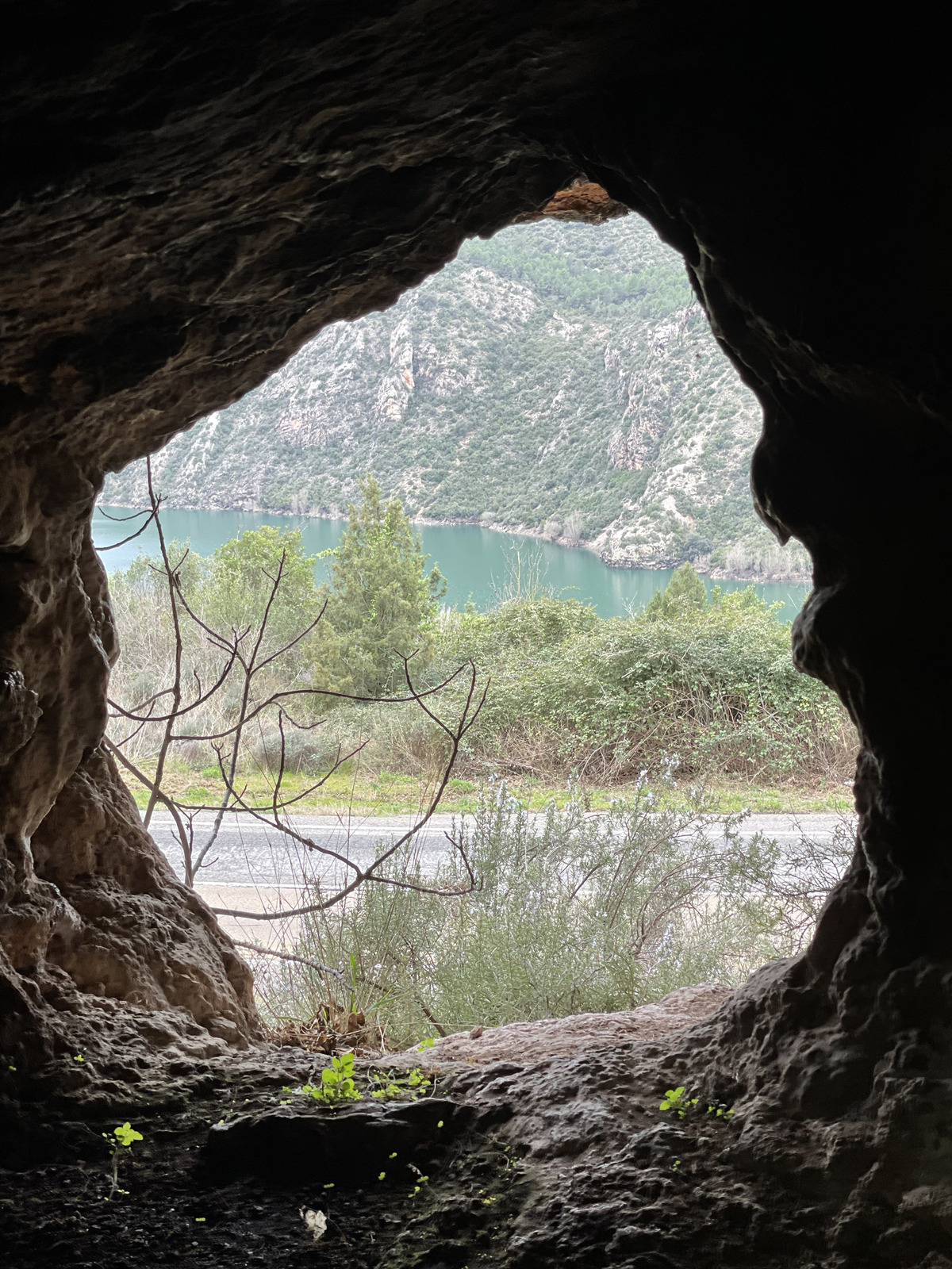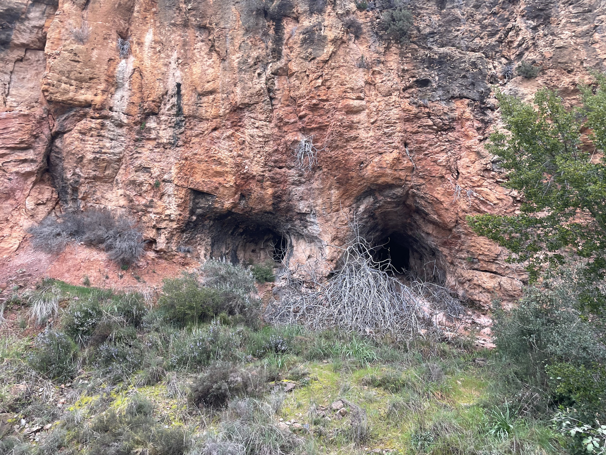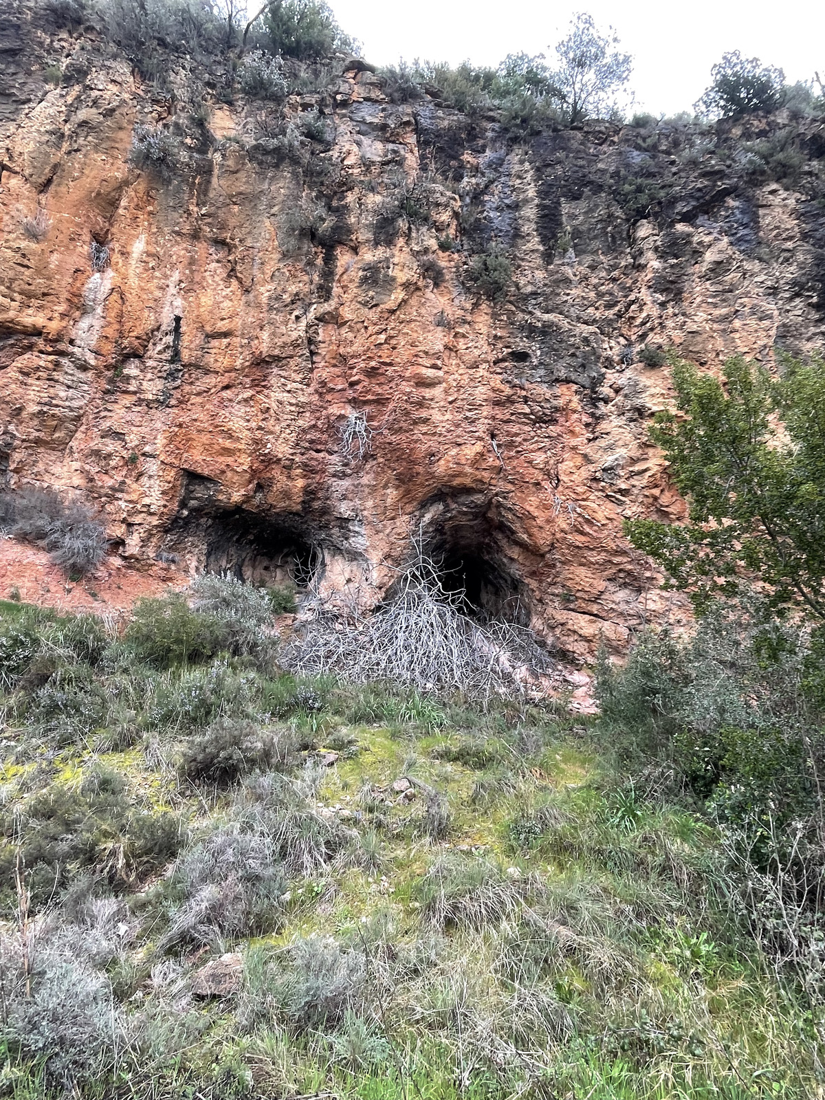 Cova de la Figuera in La Maçana. The coordinates are N 41.916889 E 0.867899. Read more here. This was my surprise find, just something that stared me from road. Literally, it is two eye-shaped openings looking down on the road from the cliff side. Very interesting cave.
