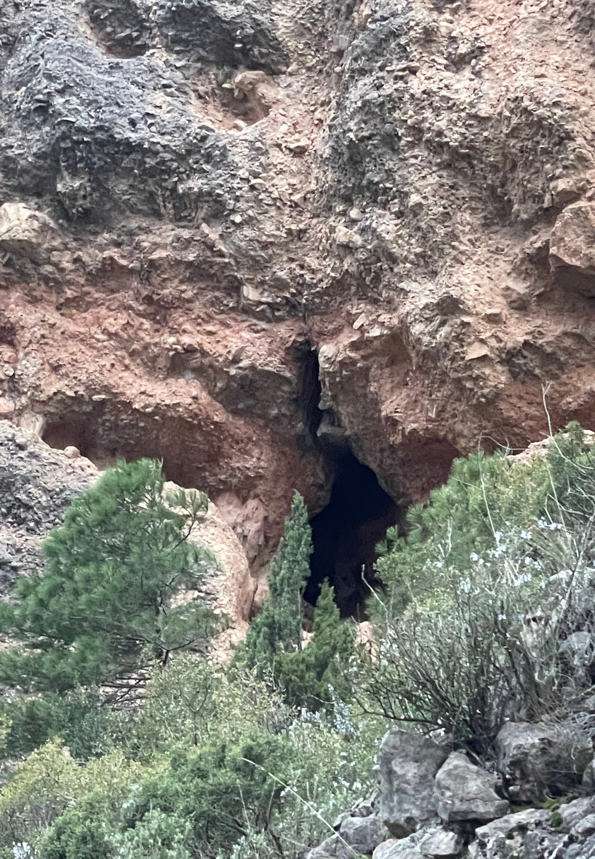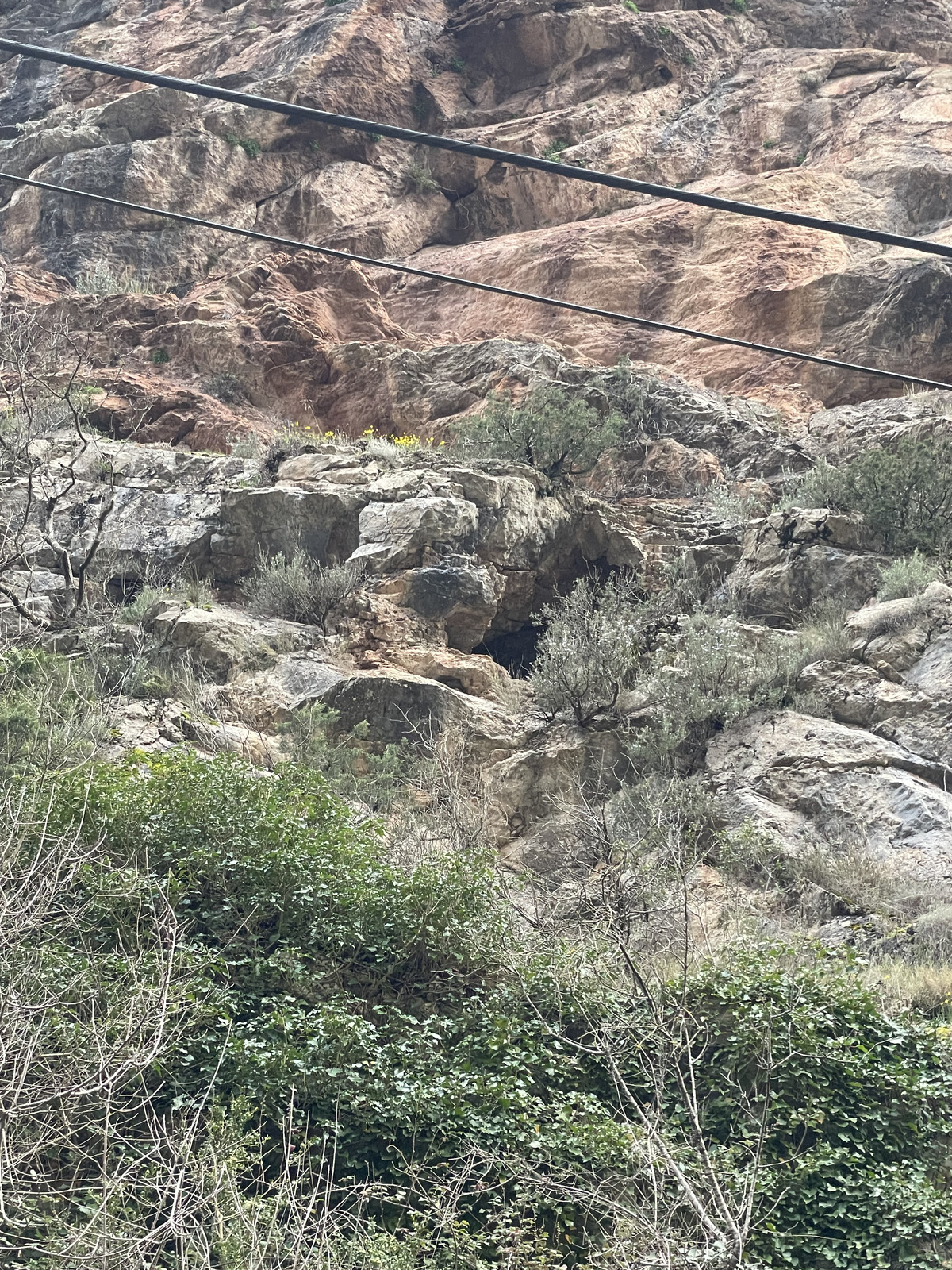 The first cave, Balma de la Paret in El Compte, was supposed to be right by the road. Close to the designated coordinates there was a small but intriguing hole too high to reach, another unnerving climb and also blocked by thick and sharp bushes. Several other candidate hole-like things may have also been on the wall higher up.