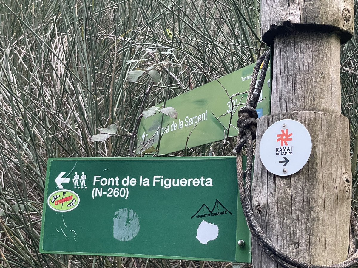 On the same path you could also reach a more famous nearby cave, Forat del Serpent (cave of the Serpent). The coordinates for this cave are N 42.280975 E 1.034601. You may alternatively (and that's probably the recommended approach) access it further south from the pedestrian road that bypasses the next tunnel. In any case, this cave is much higher and requires at least half an hour hike. More information about this cave here, here, here, and here. Note that I have not been to this cave and there seems to be some confusion about the location of the cave. Google and Grottocenter give a different location, and in addition there may be two different caves, Forat del Serpent and Cova del Serpent.