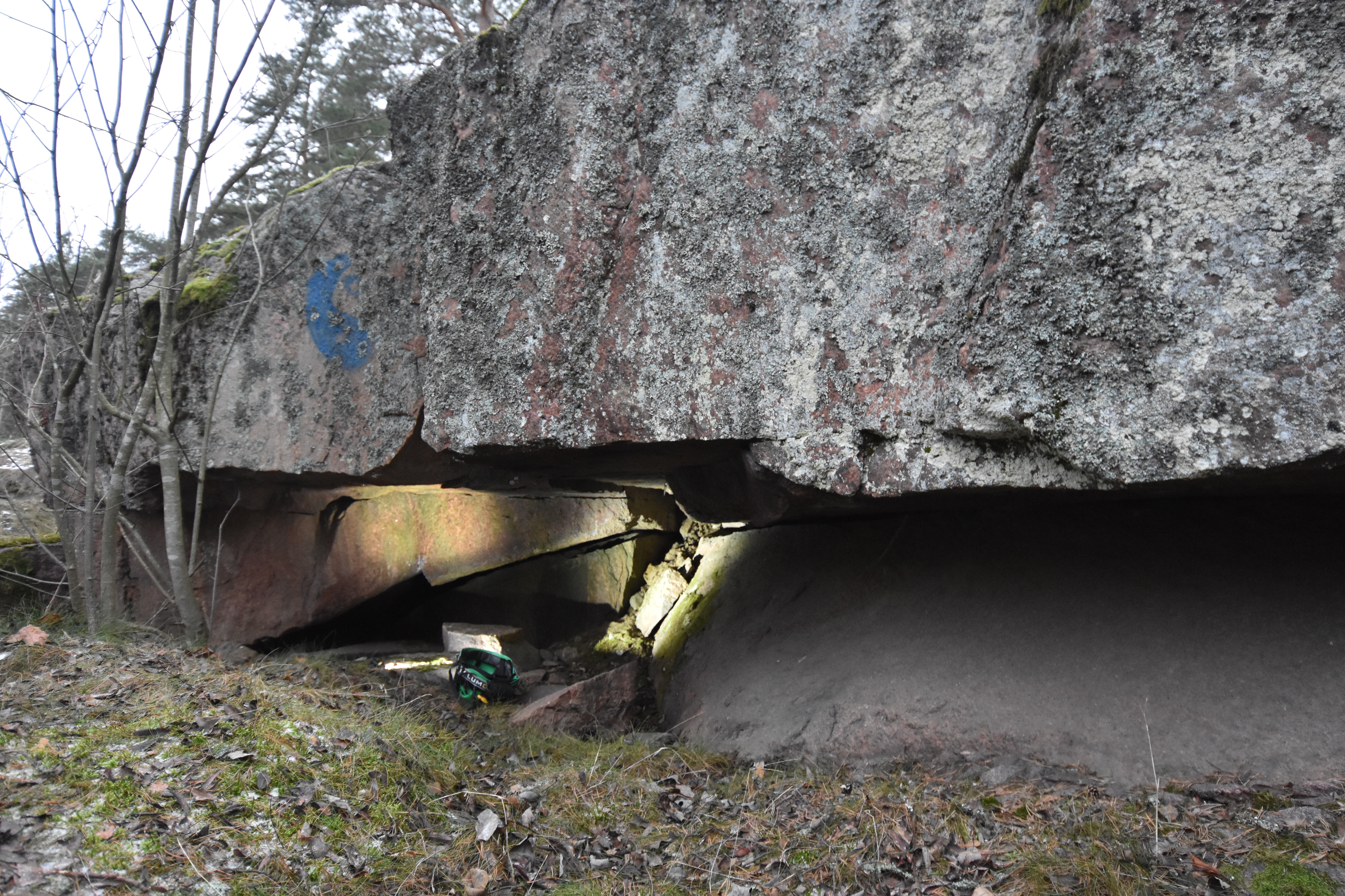 Espoo. While looking for the remains of fortifications in Laajalahti, I came across a possible small roof cave. Small, but maybe worth documenting since there are really very few caves in Espoo. But the question is, is this a natural cave or remains of fortifications or quarry operations in the area?