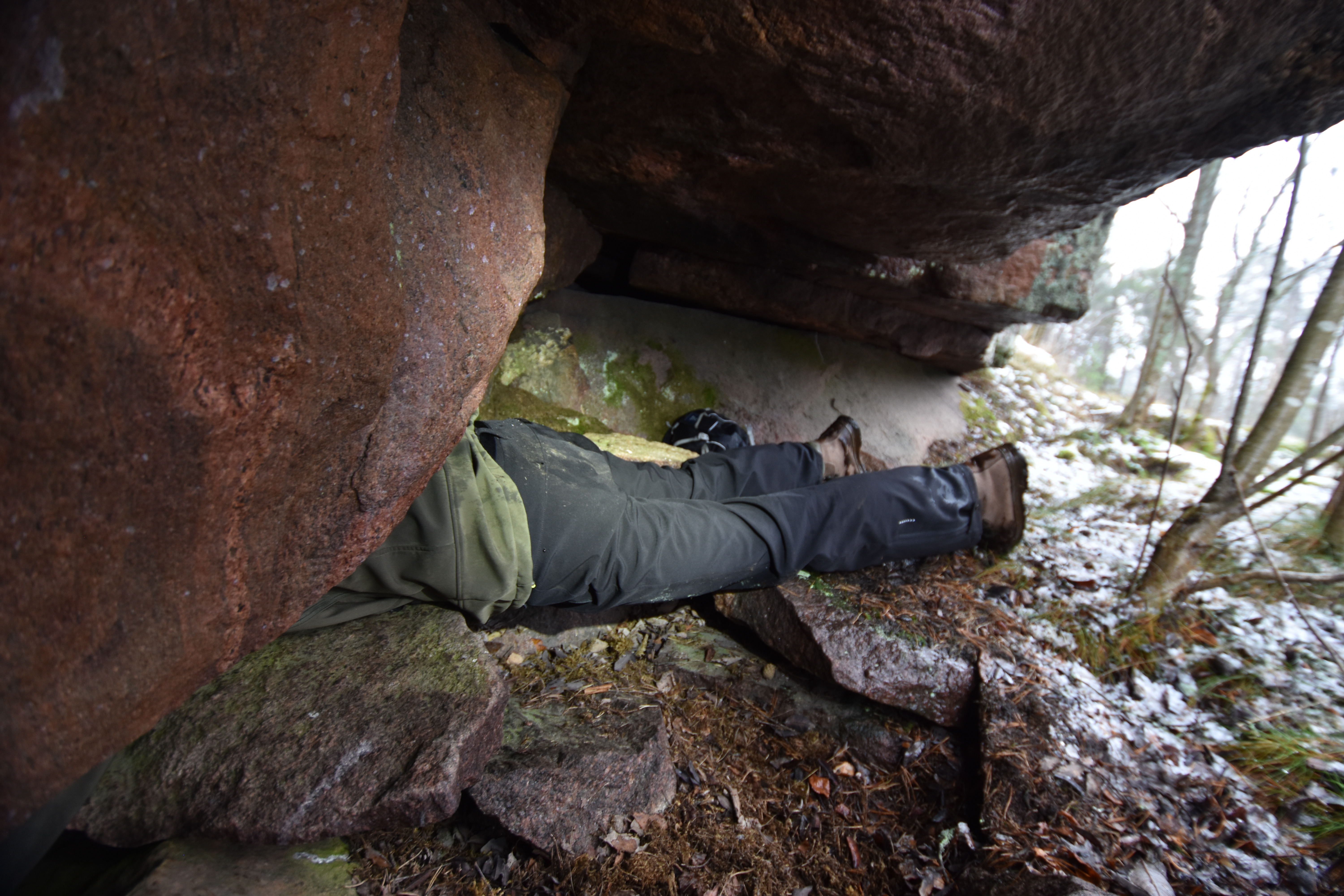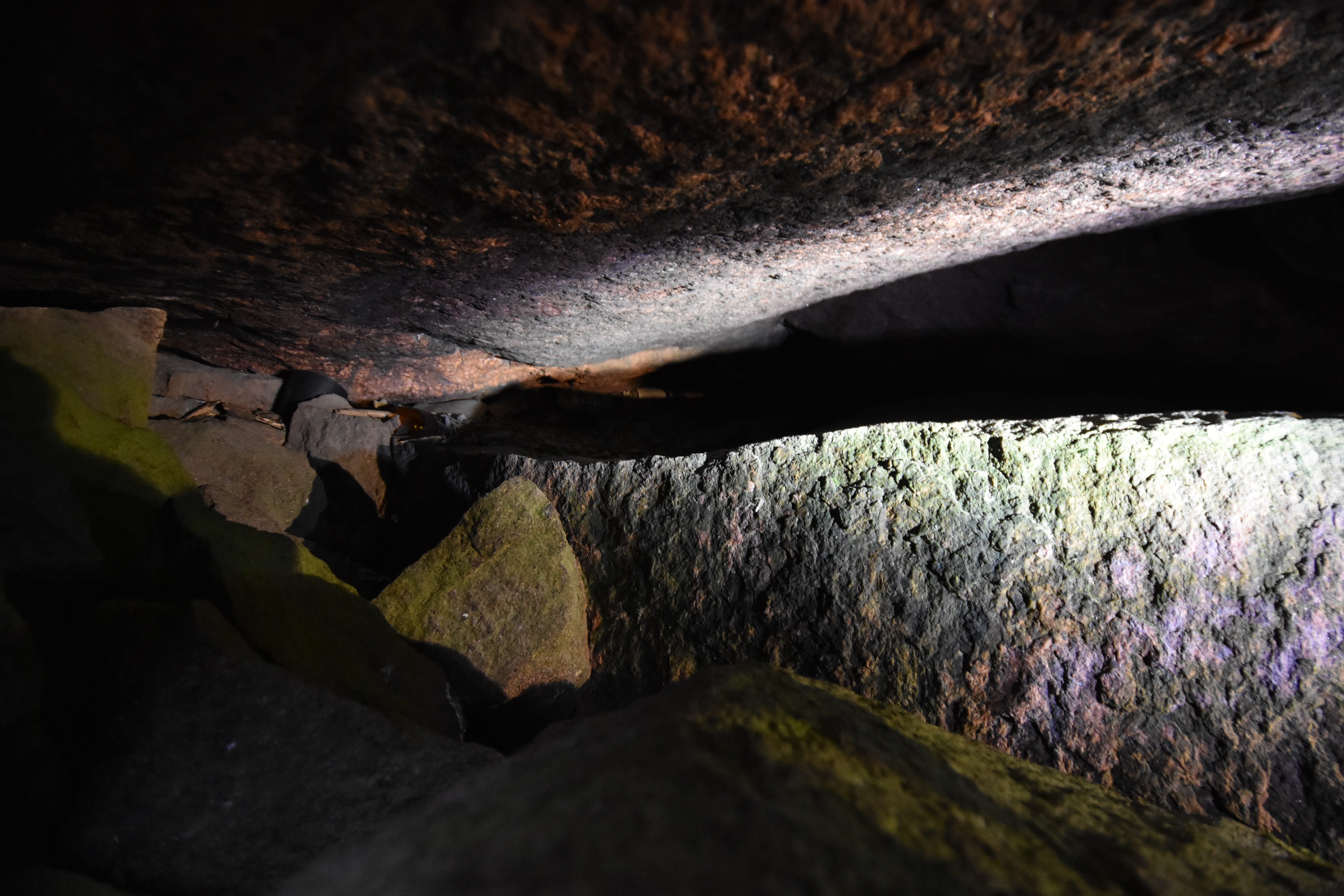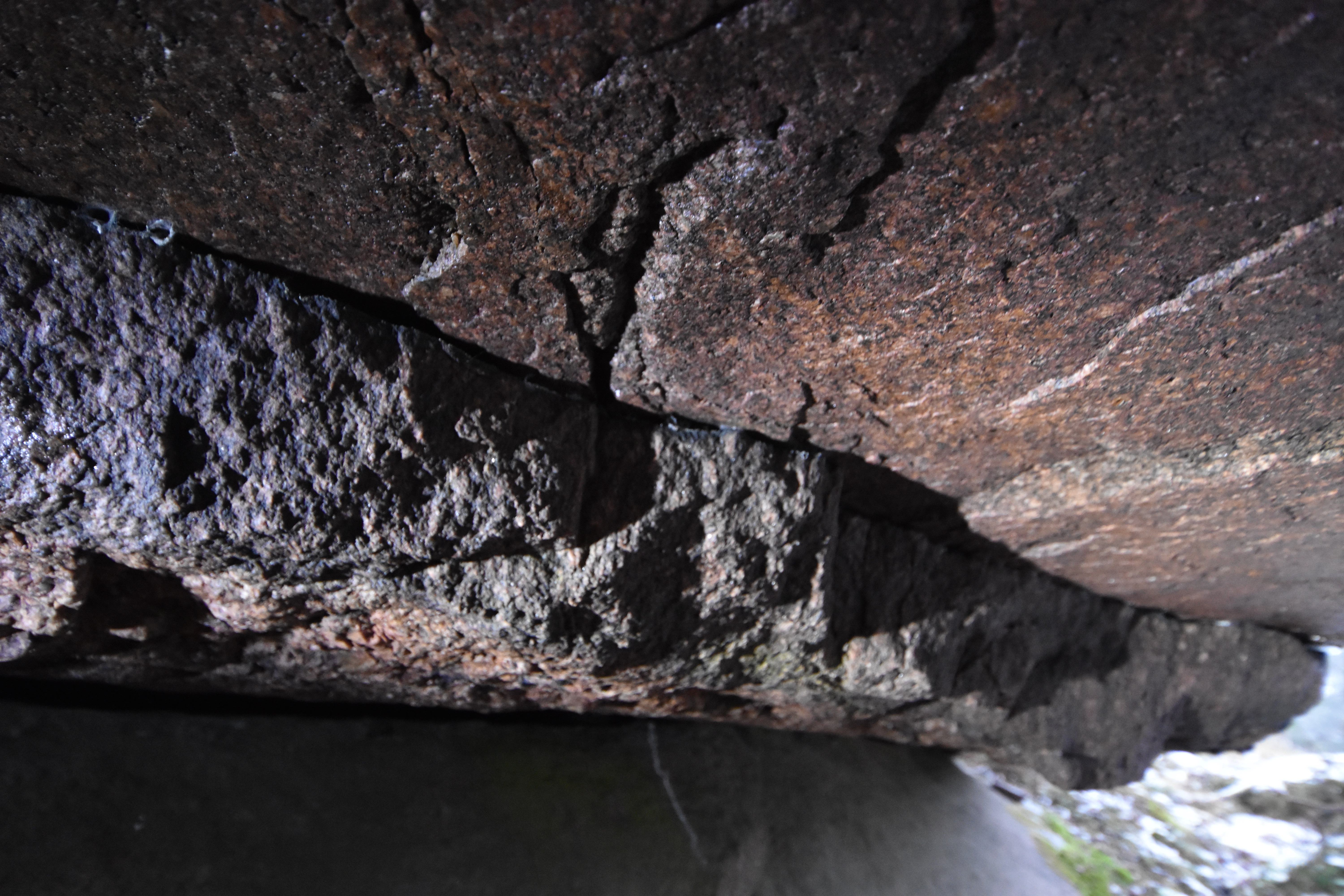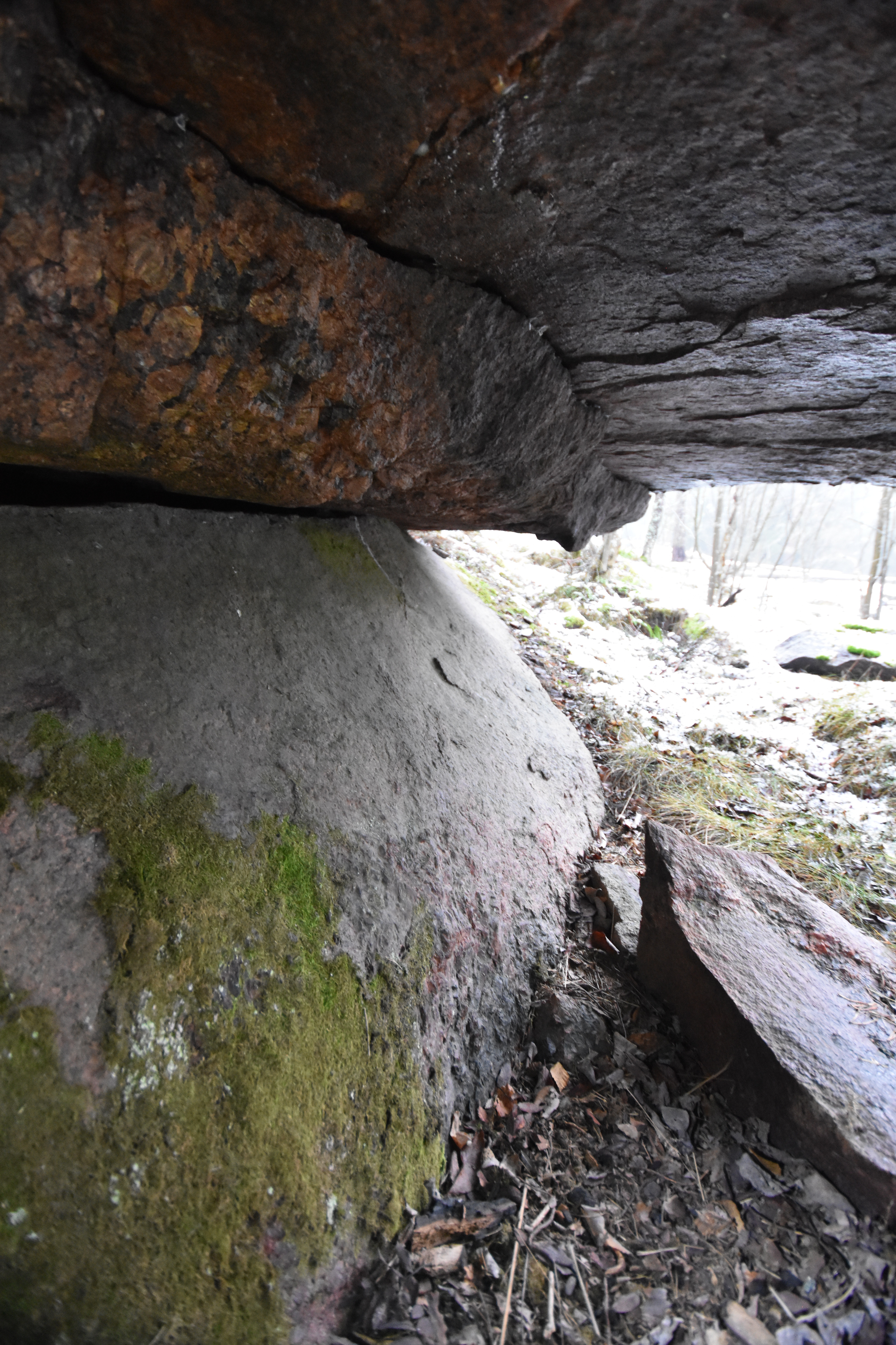 The place looks a bit like piled stone blocks, but the roof block and the ones supporting it are massive, not sure they would have been moved just for the fortifications. The question is perhaps if the space underneath is a natural phenomena or the result of quarrying taking away large rock blocks? Perhaps, perhaps not, but at least some the surfaces under the roof are clearly natural. Sloping rock, for instance.