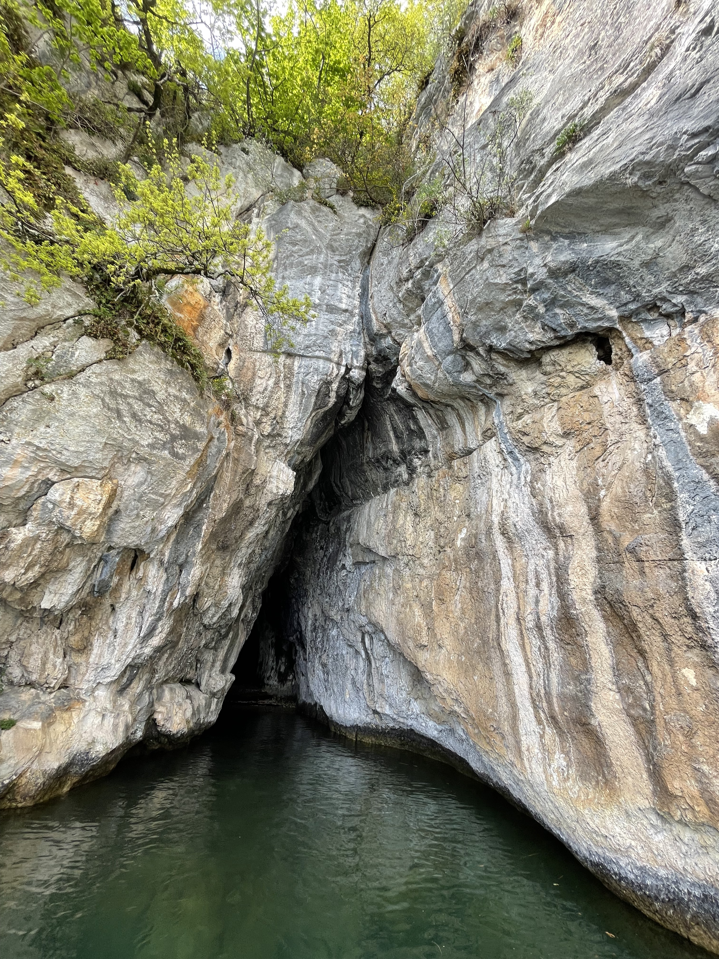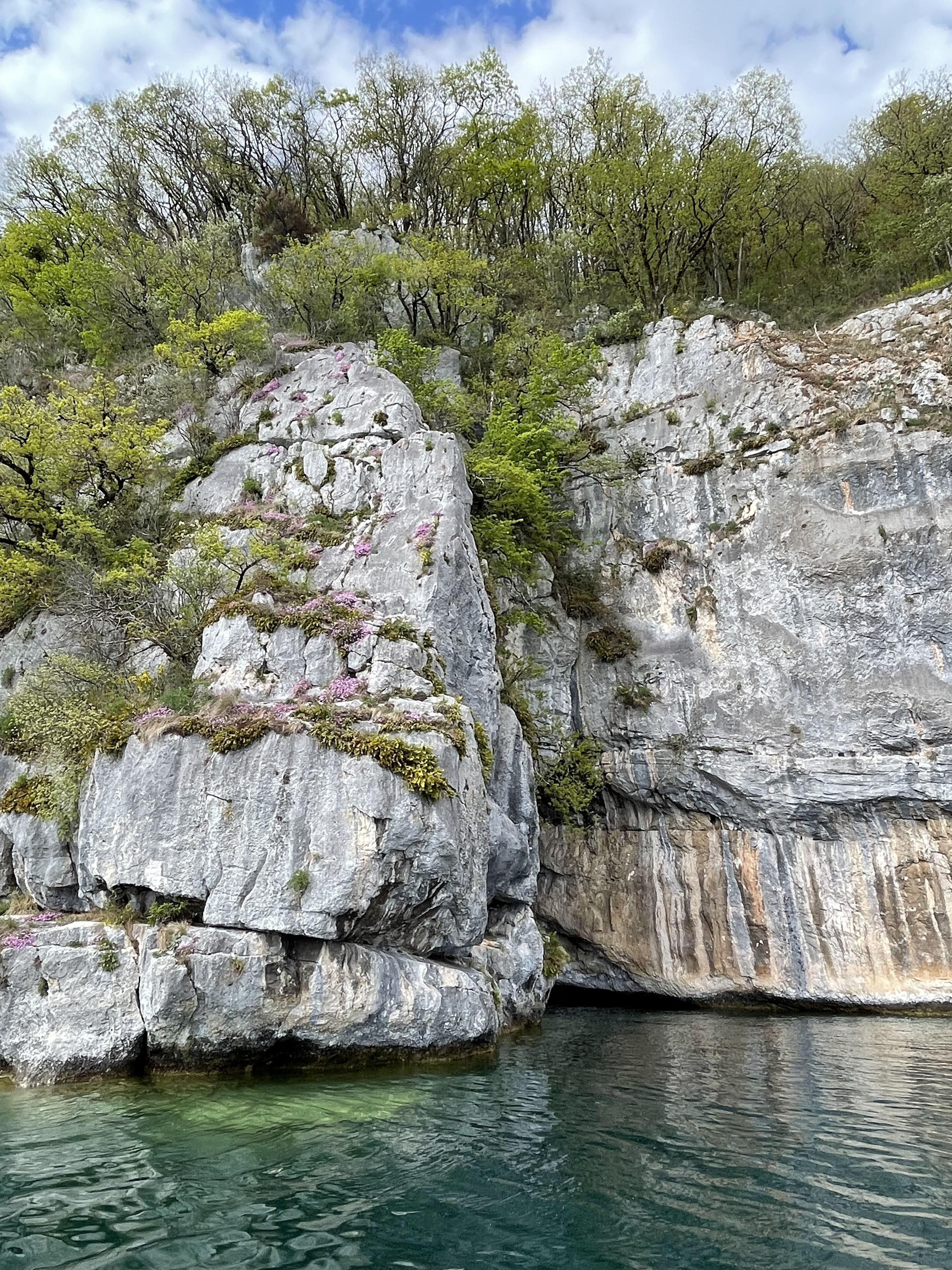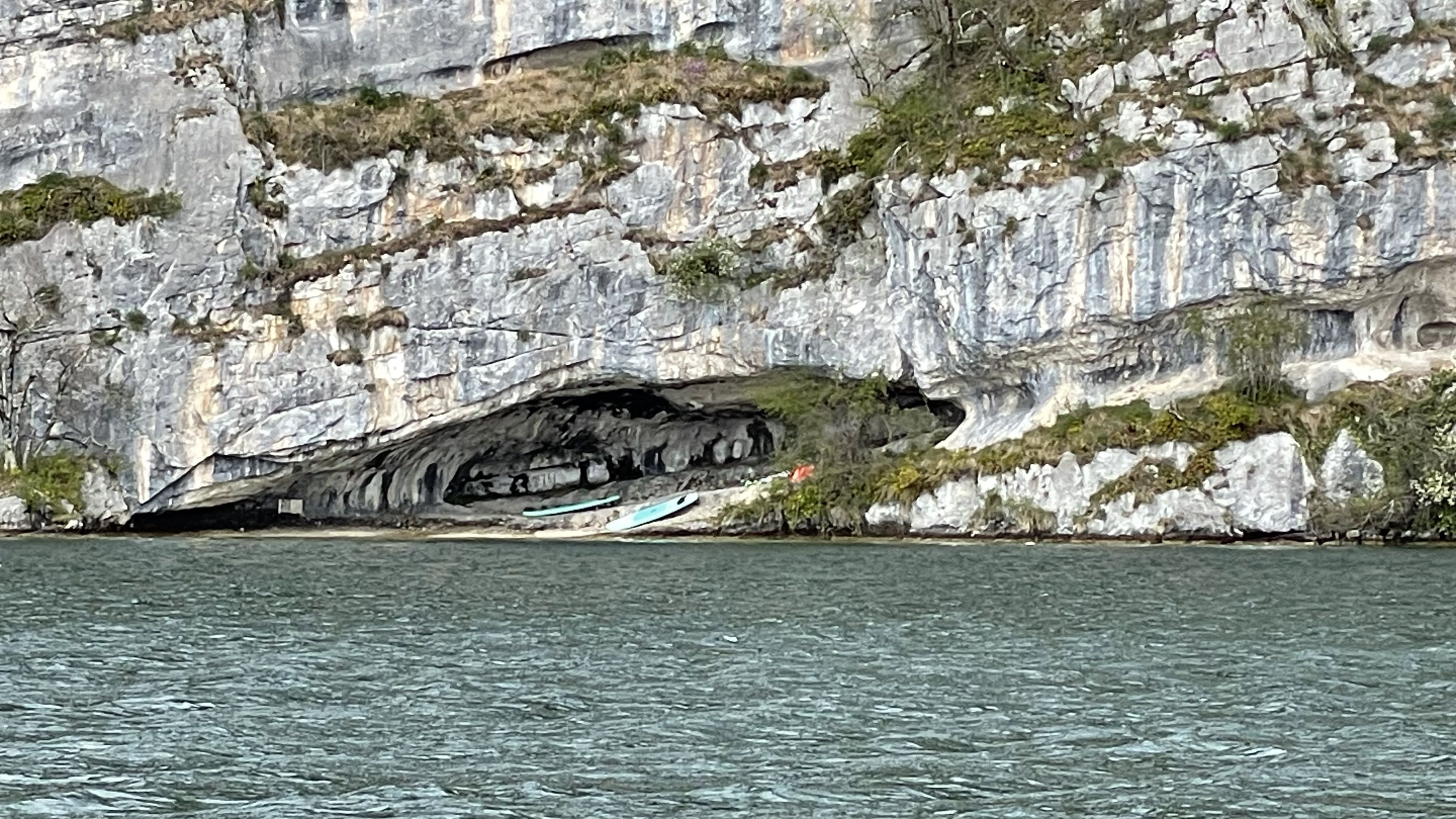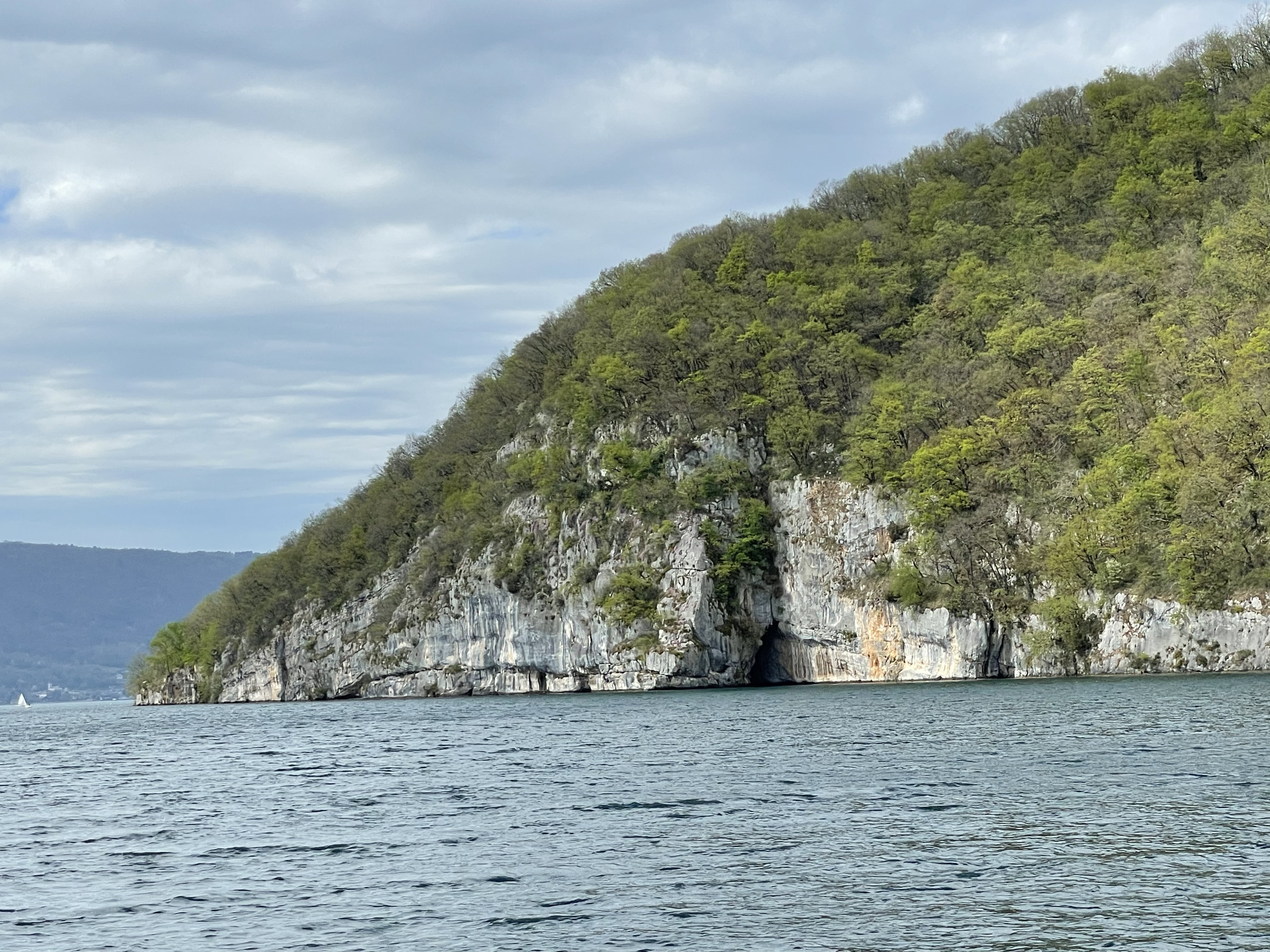 The Grotte du Grand Pertuis cave is in Talloires-Montmin, coordinates N 45.841638 E 6.194382. It is the cave that can only be reached by a boat. The cave is a crack in an inside corner of the massive cliff covering this side of the lake.