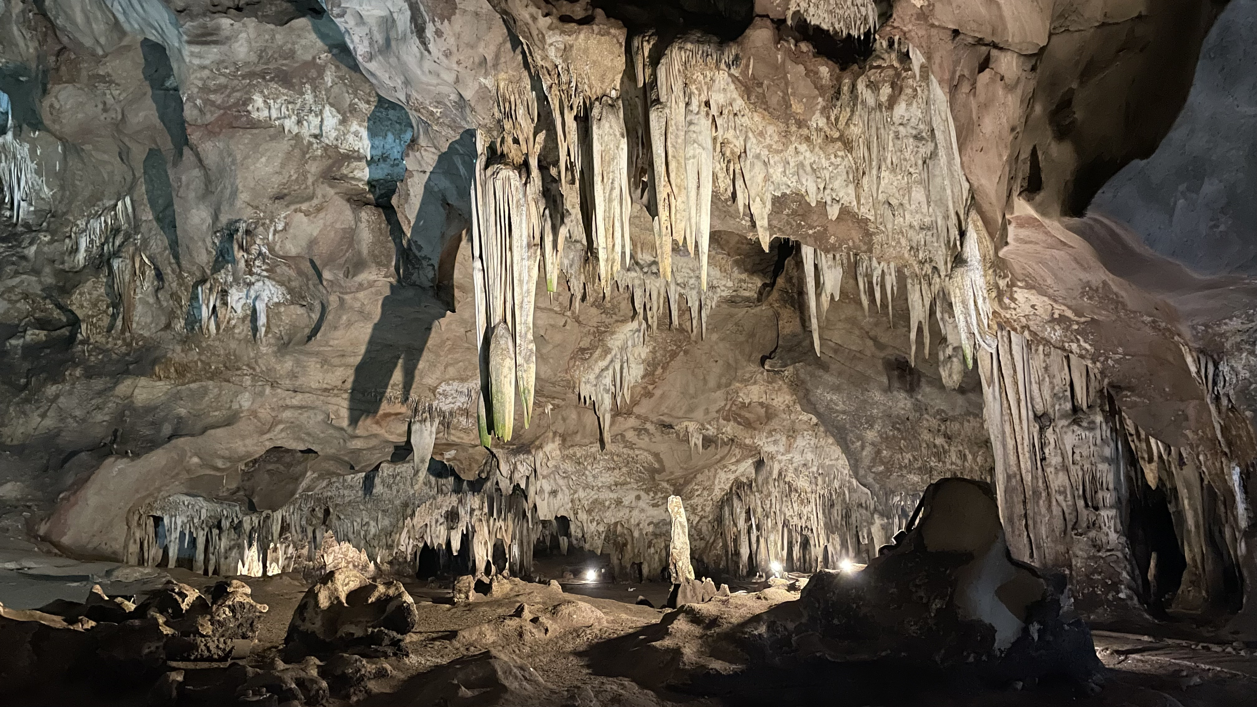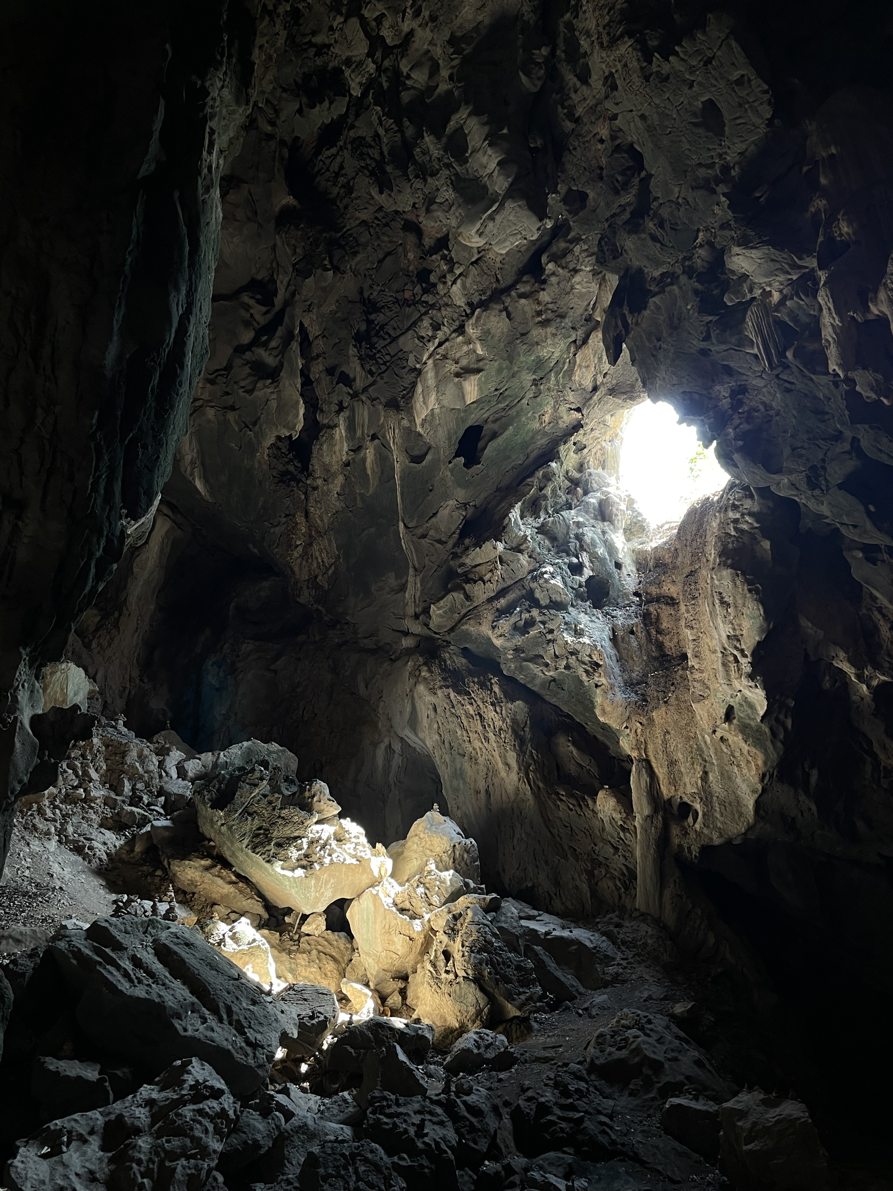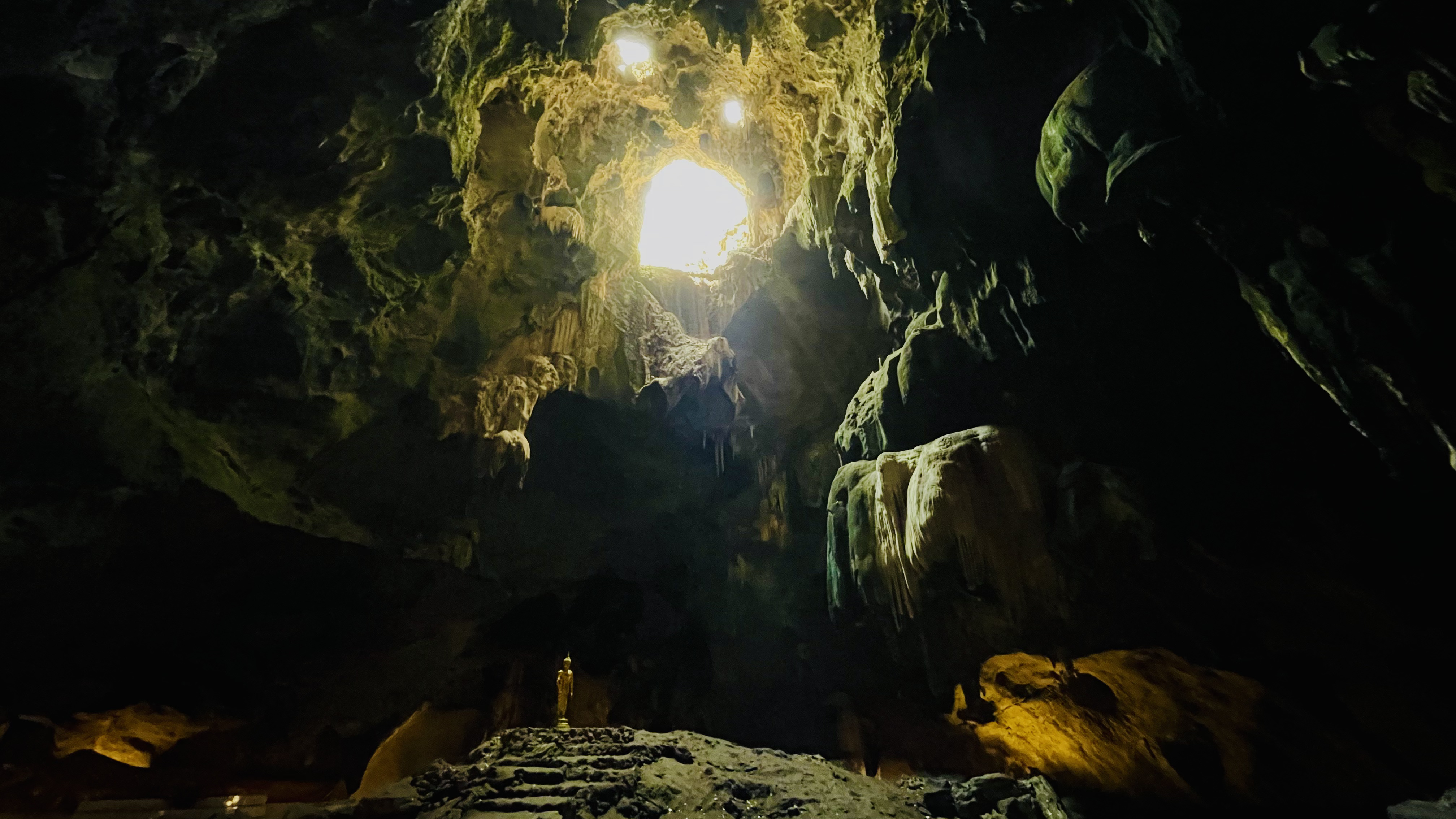Then you keep hiking. And hiking. Then you light dawns on you and you arrive at the last, massive chamber. The light from three small holes at the high roof shines down, and reveals a standing Buddha statue... and a Buddha statue laying on its side... and it is a religious experience. Blessed by God's light in the depths of a massive cave.