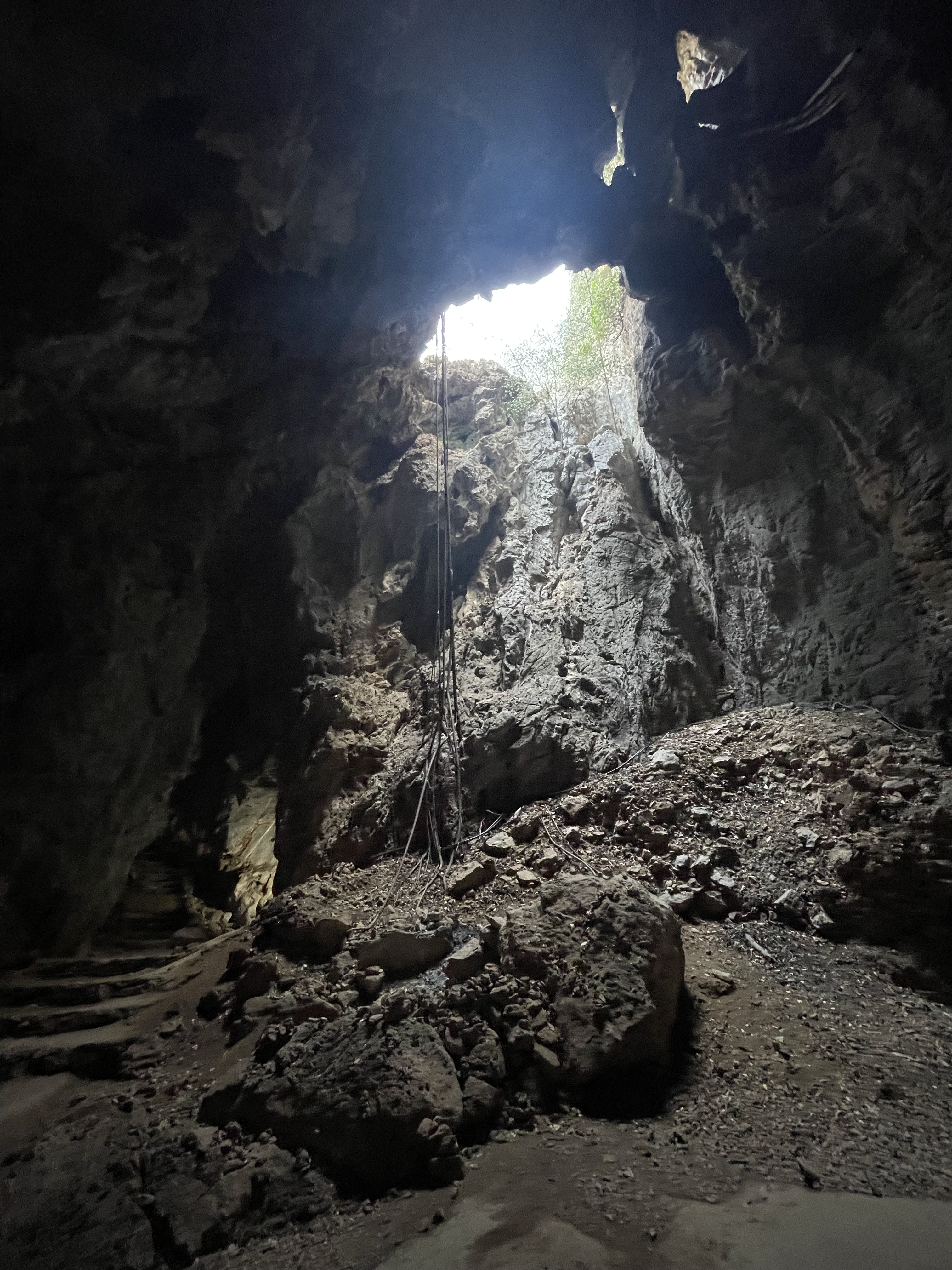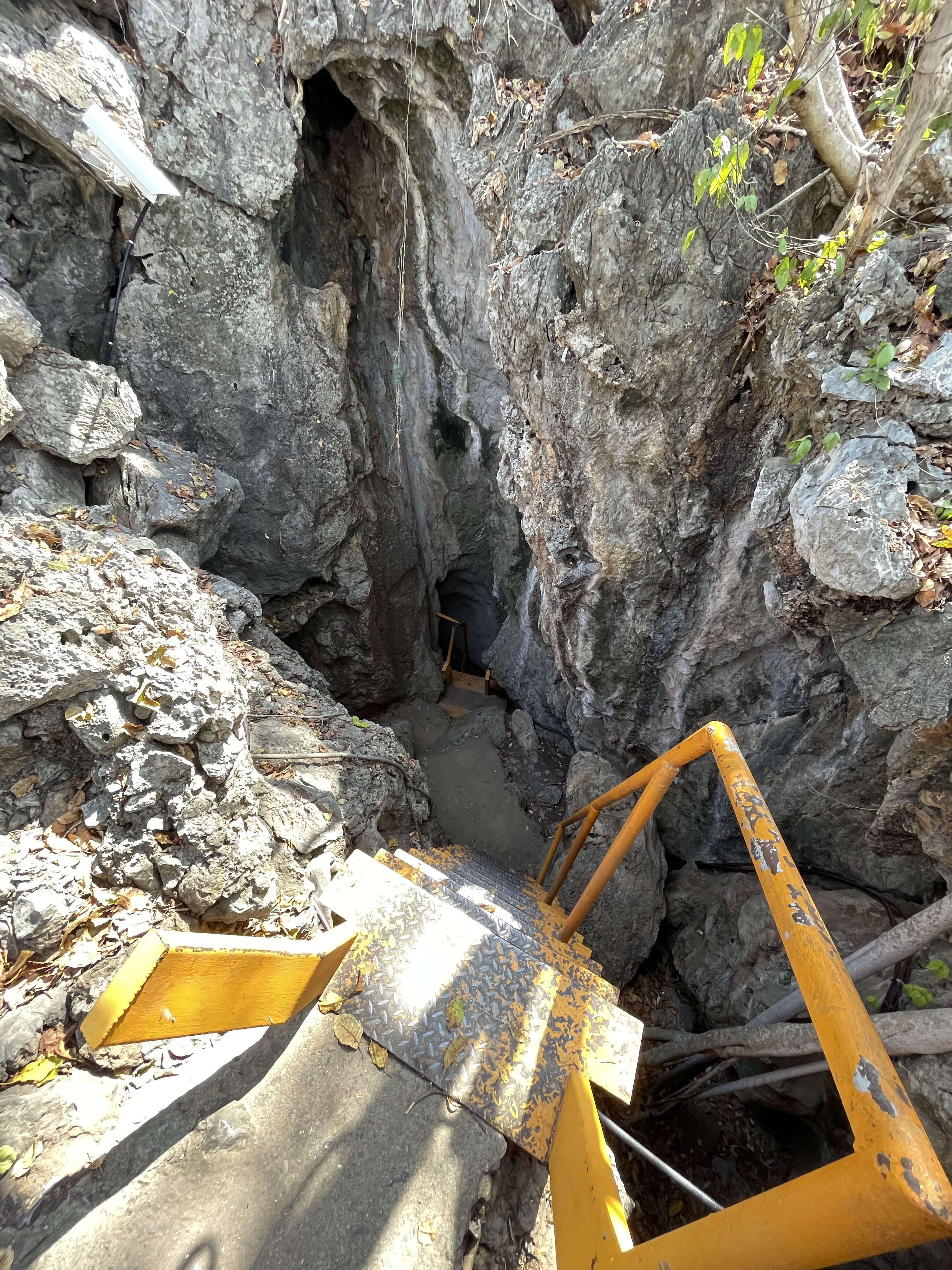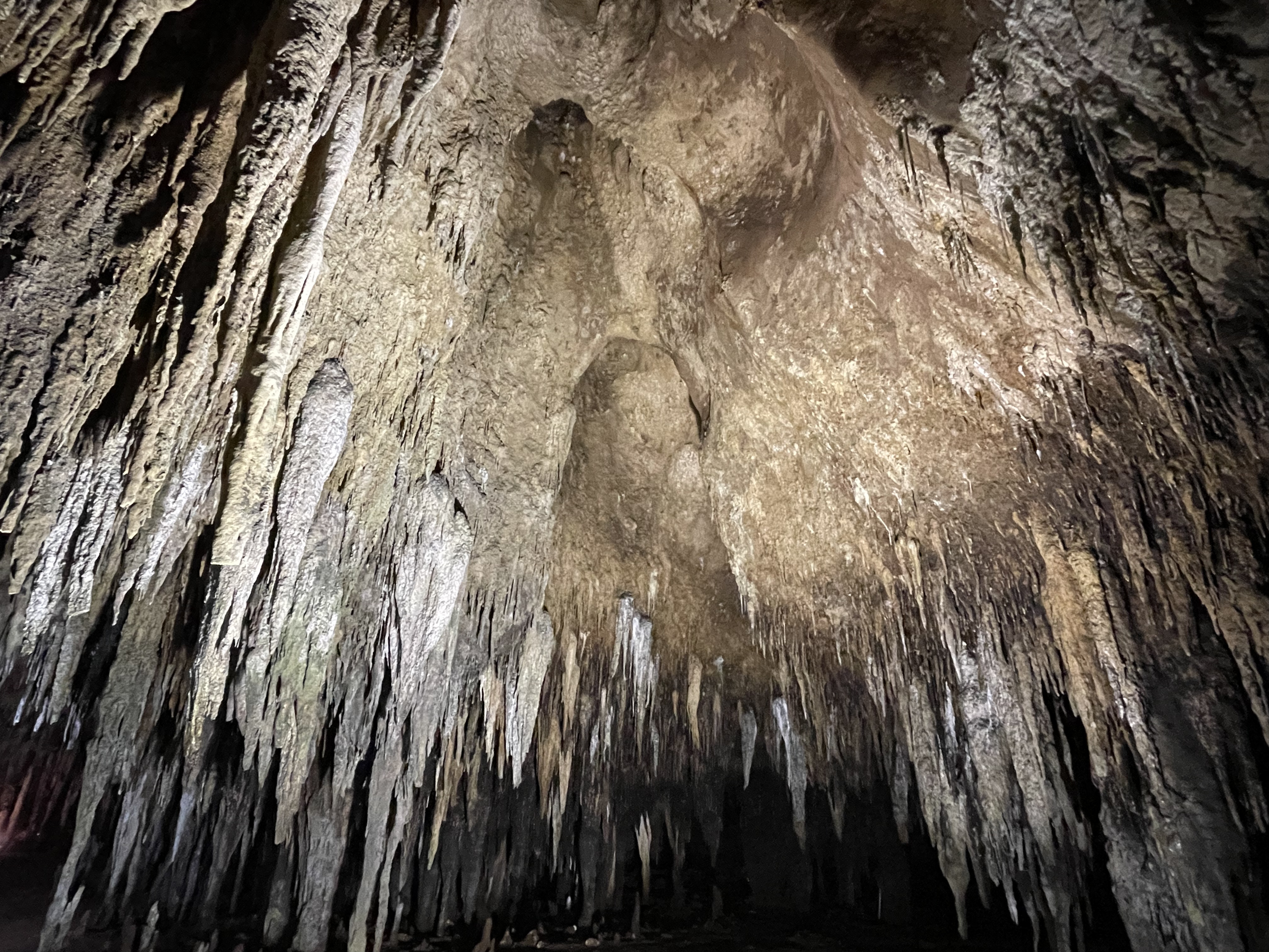 And oh boy was this a wonderful cave! Once you descend the steep initial stairs, you'll hit the first small chamber, filled with bats camping right above your head. Many, many bats. Very interesting! And then you go to the next, larger chamber, and now you can't see the bats in the darkness, but you hear them. Even more of them!