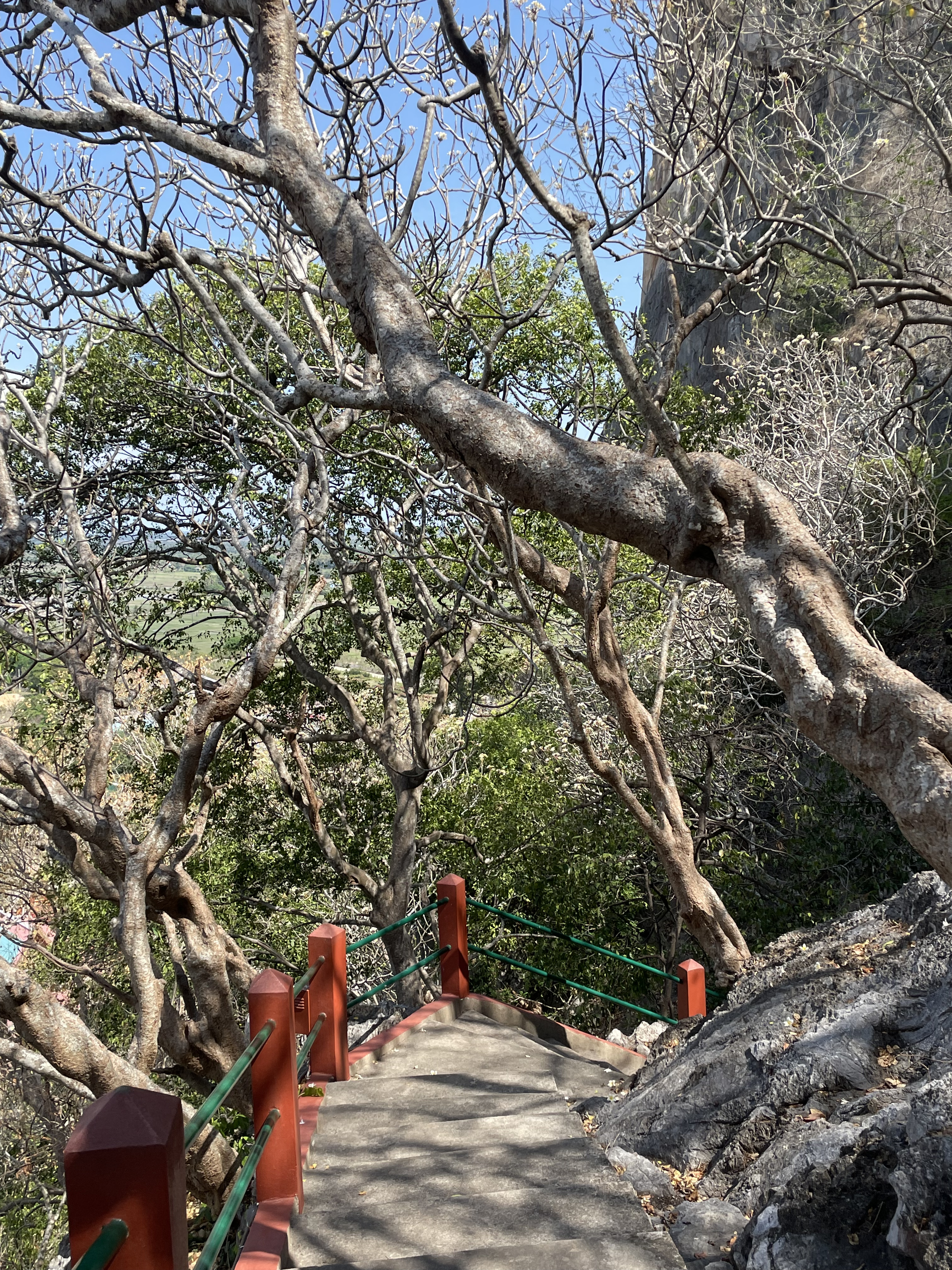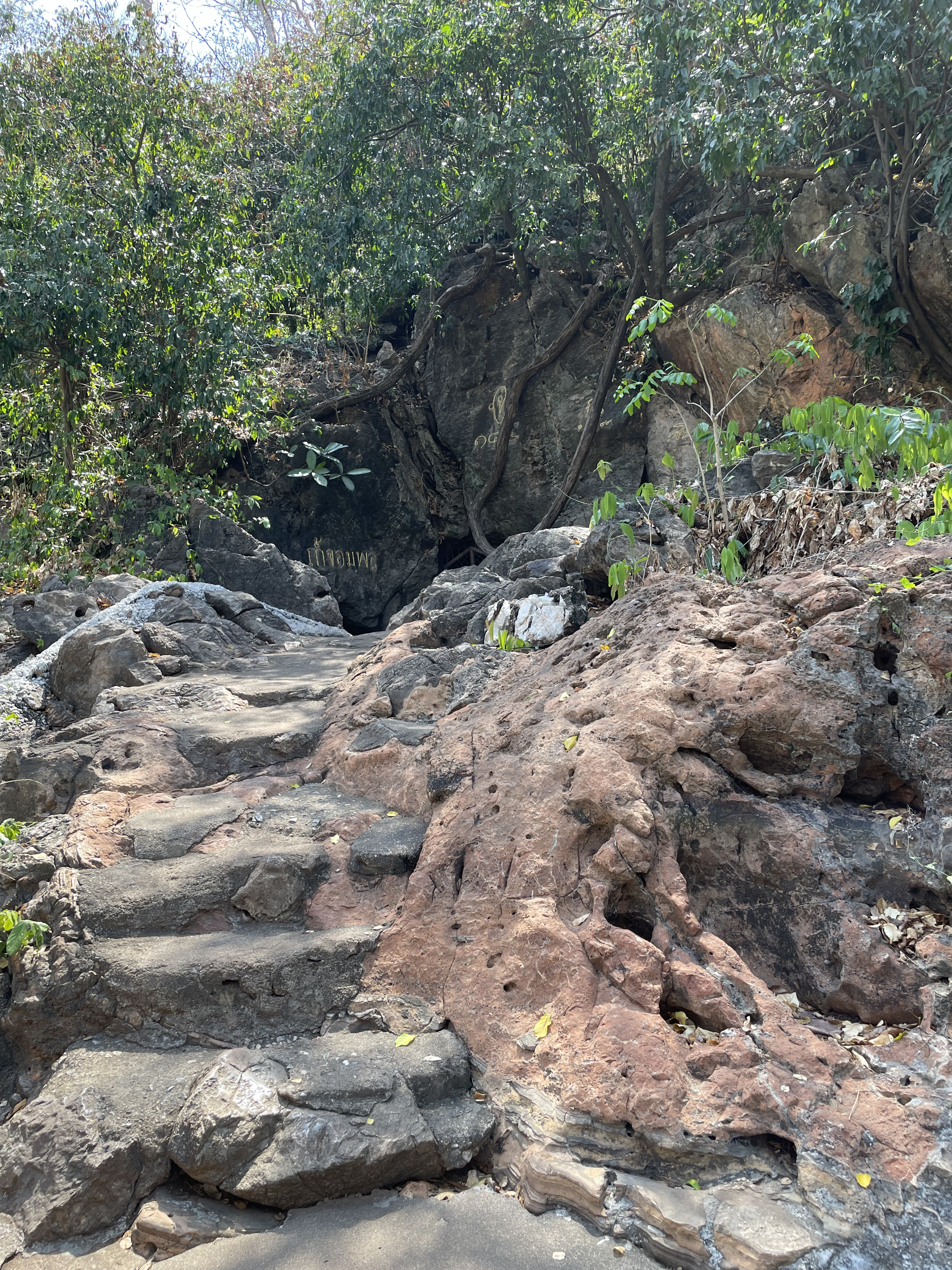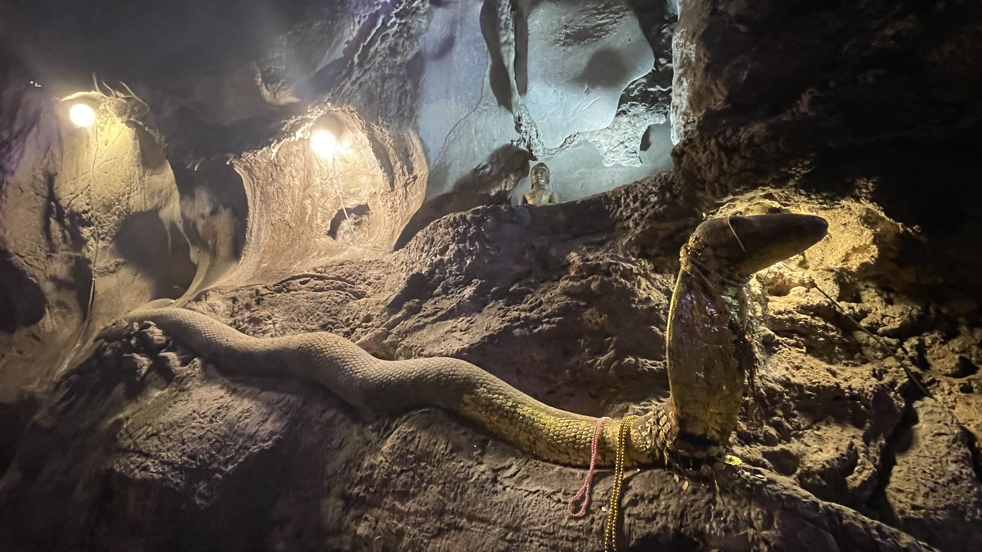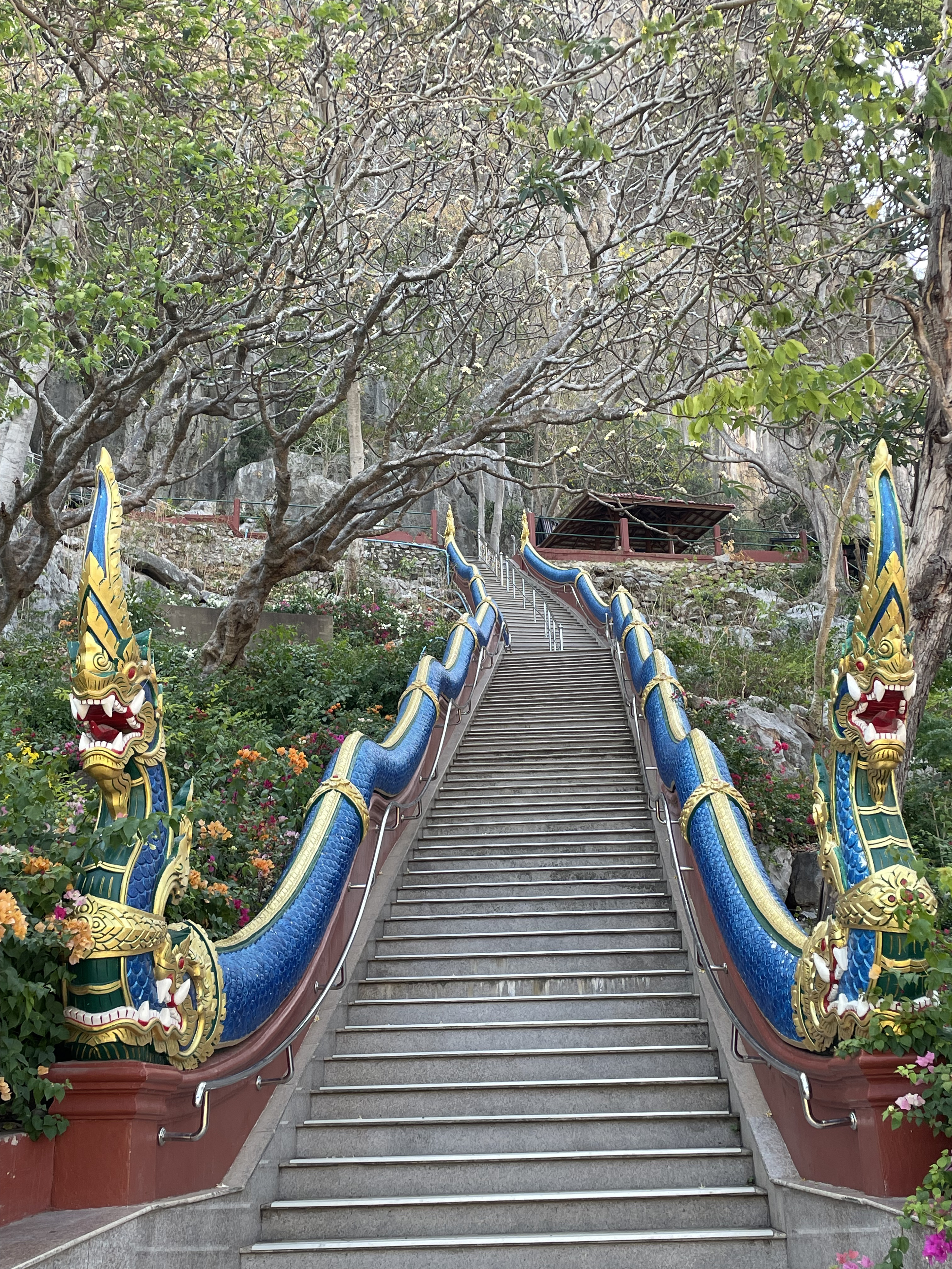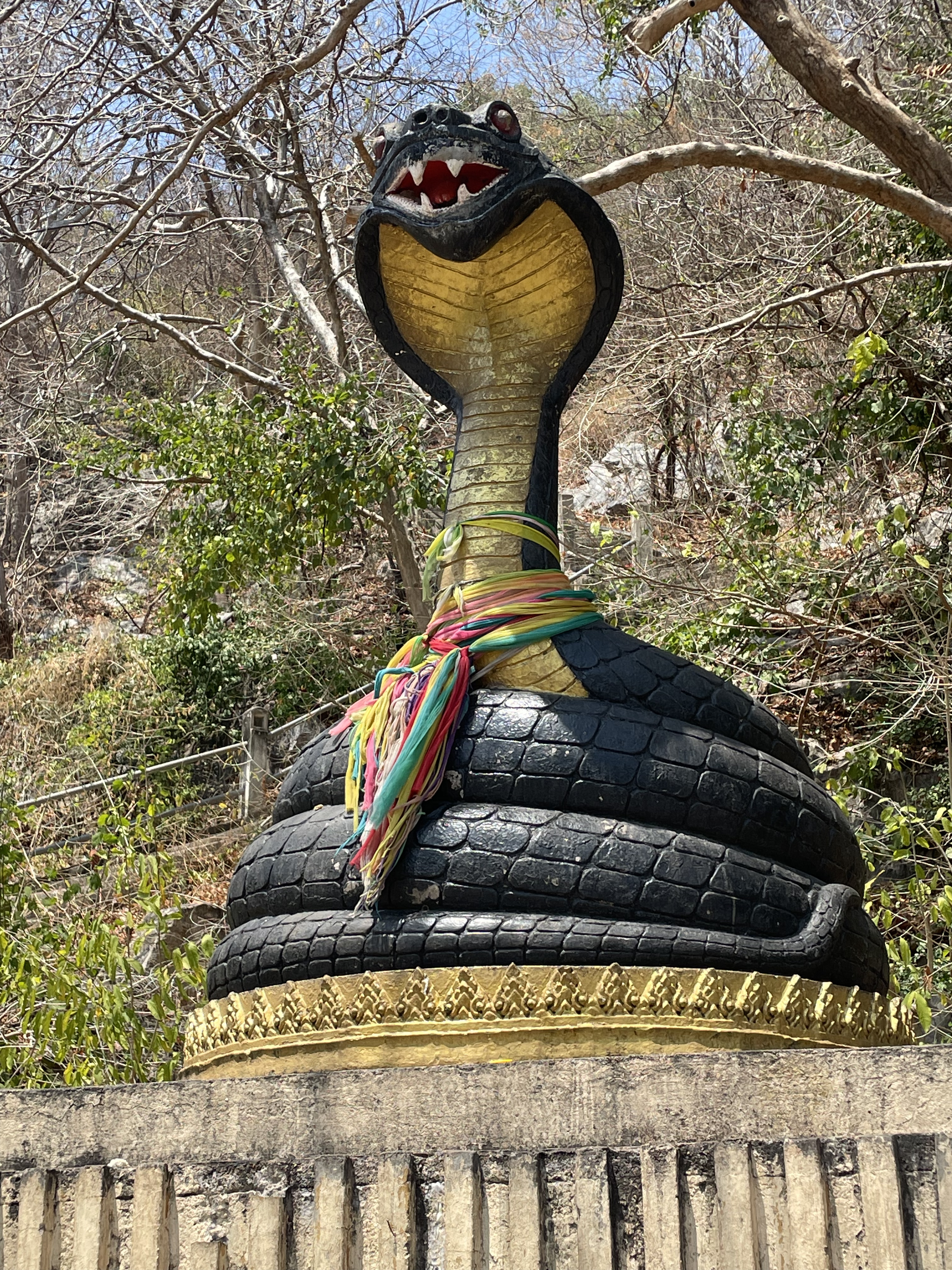 The snake statue near the steps towards both the no-caves-here (left of the statue) and the Fa Tho cave (right):