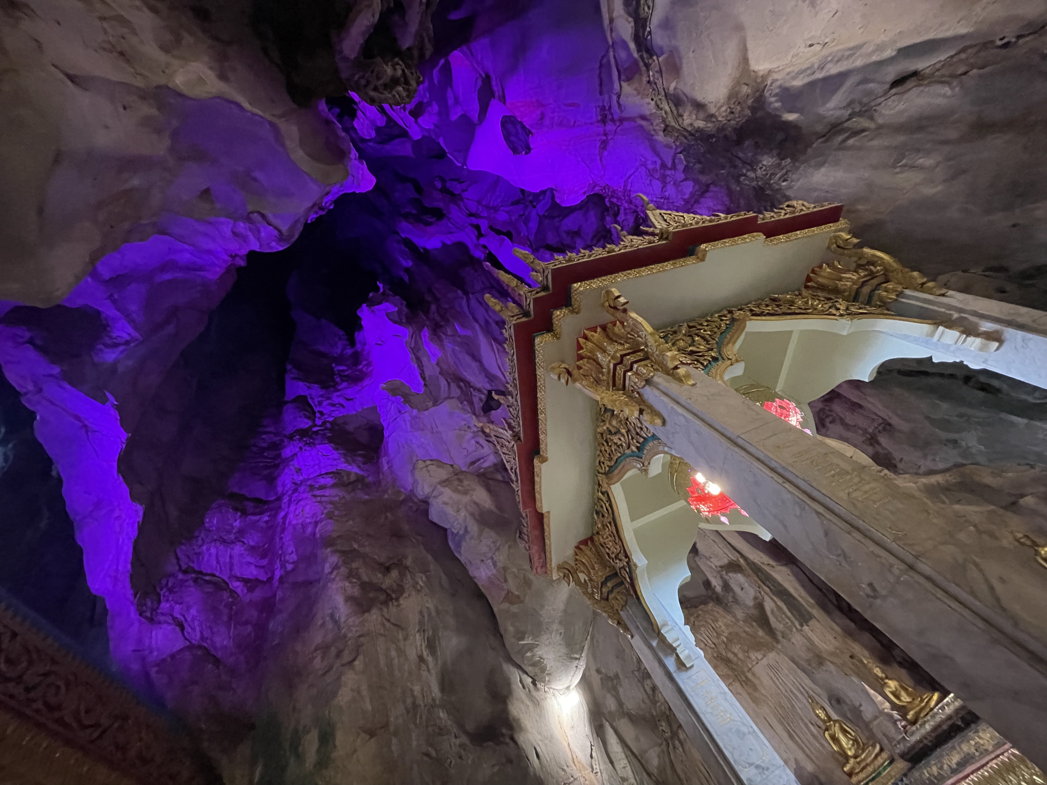 The cave is on three levels, the entrance is to the main hall that houses for instance a massive Buddha statue on its side, right by the entrance when you come in, some open space, and very high colorfully lit spaces above. Then there are steps to the next level above, including an open roof hole towards the sky.