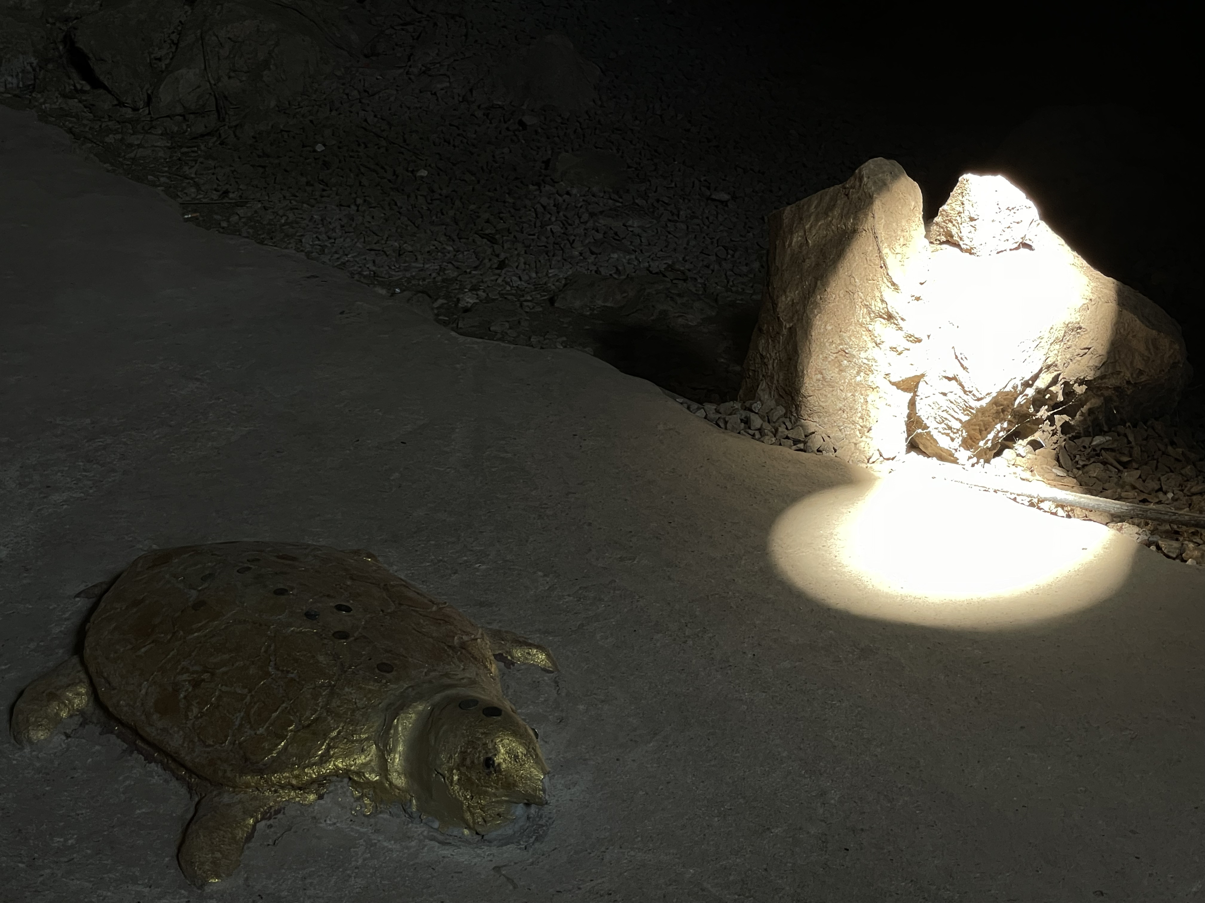 Again, the cave comes with lights and prepared paths. It begins with a quite steep descent with two sets of almost vertical ladders. The going gets easy, but the cave continues deeper into the mountain. I was a bit in a rush, so I almost turned back before the end, but that would have been a big mistake. Again, at the end I was revealed to a very Chomphon Cave -like setup: a massive chamber with light shining through from a couple holes, and a shrine to respect the gods. At some time during the day, the light from the holes will also shine on a tortoise statue, I missed that time by a bit though, see the first picture below.