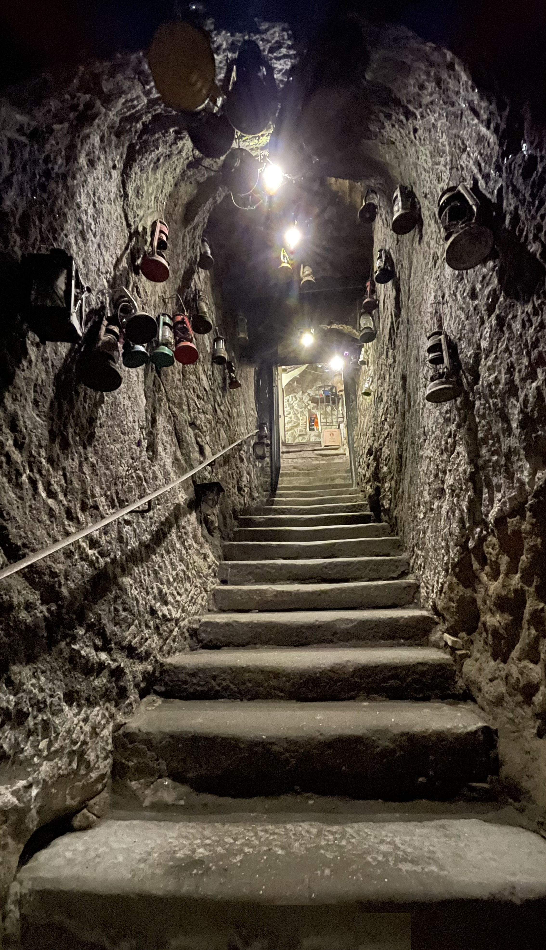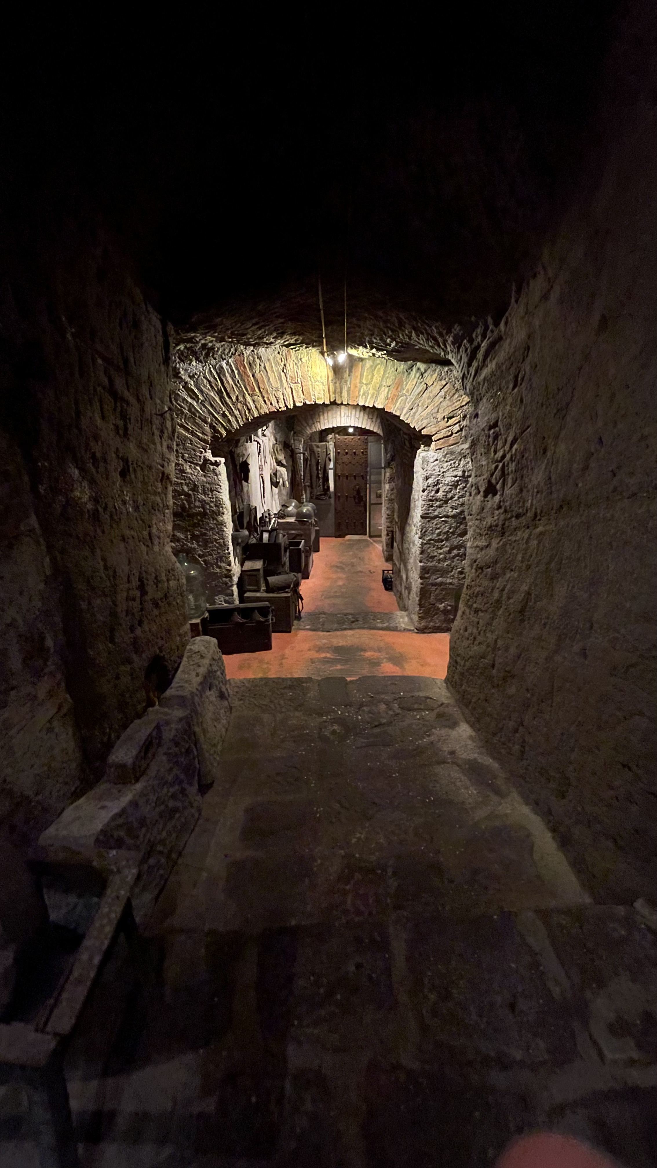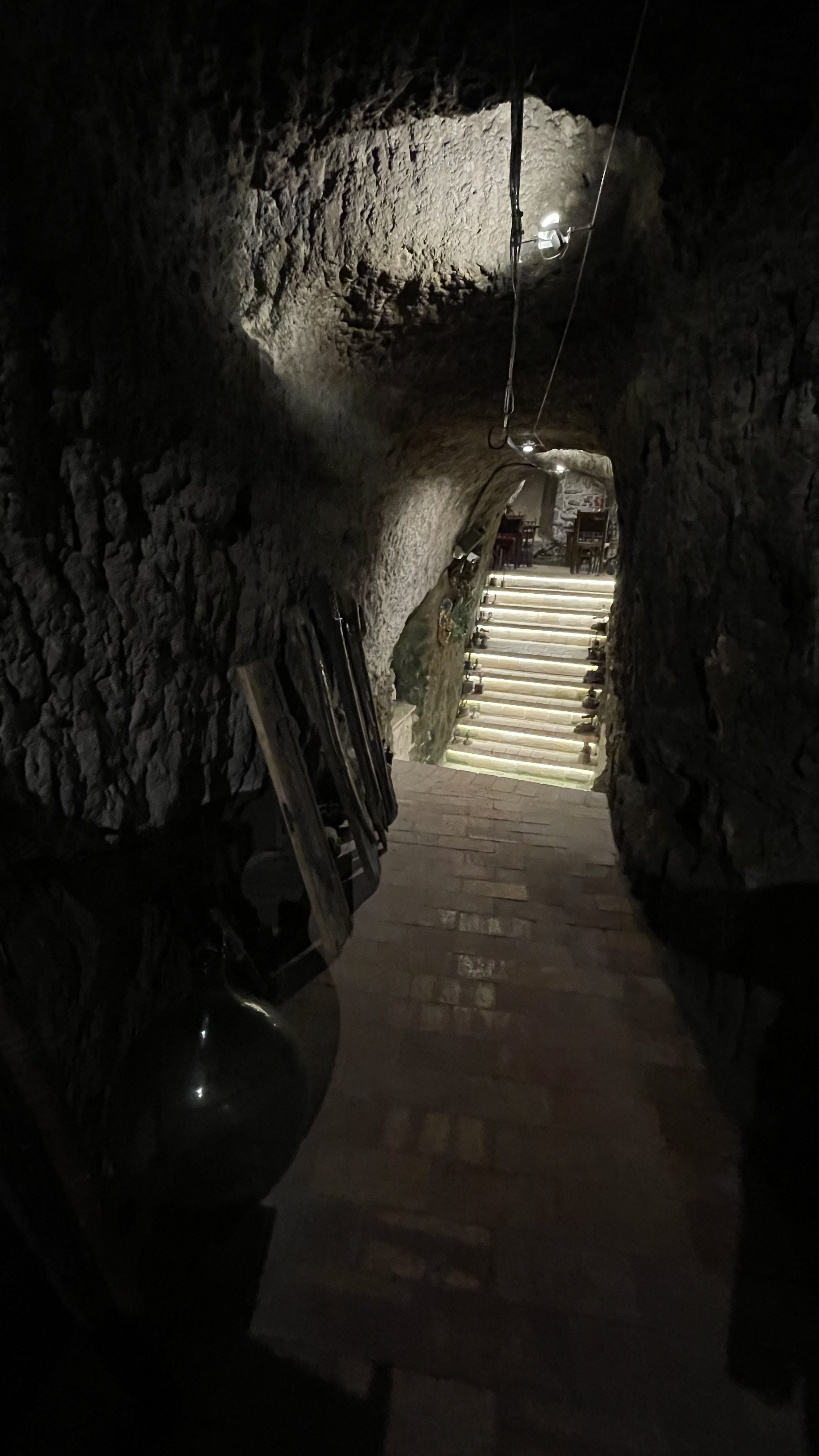 It turned out that my first cave visit would be in an unexpected place: the dinner restaurant. Arte e Vino is a very nice restaurant in Castel Gandolfo's main street. Coordinates are N 41.745297 E 12.650869. While waiting to be seated, we were offered a tour of their cave -- a complex maze of underground rock tunnels under their basement. The maze connects a number of different restaurants on both sides of the street, and to this date houses their wine collections, vegetables, and all kinds of historic equipment for wine-making and other purposes. The cave is in part a built basement on the upper part, then a in part a human-carved set of tunnels and in part natural cave holes. Very interesting! Wish I had something like this under my house :-)