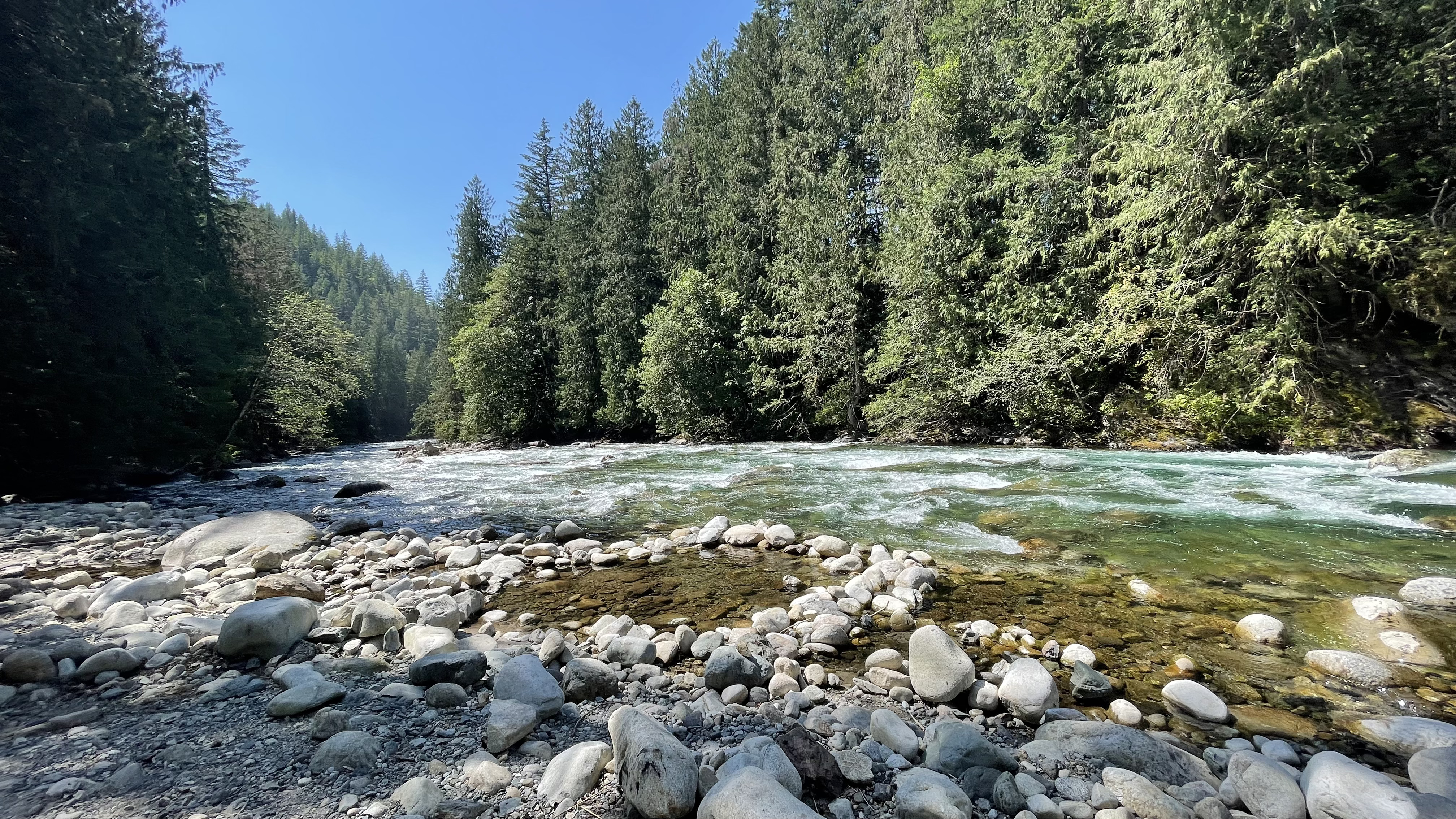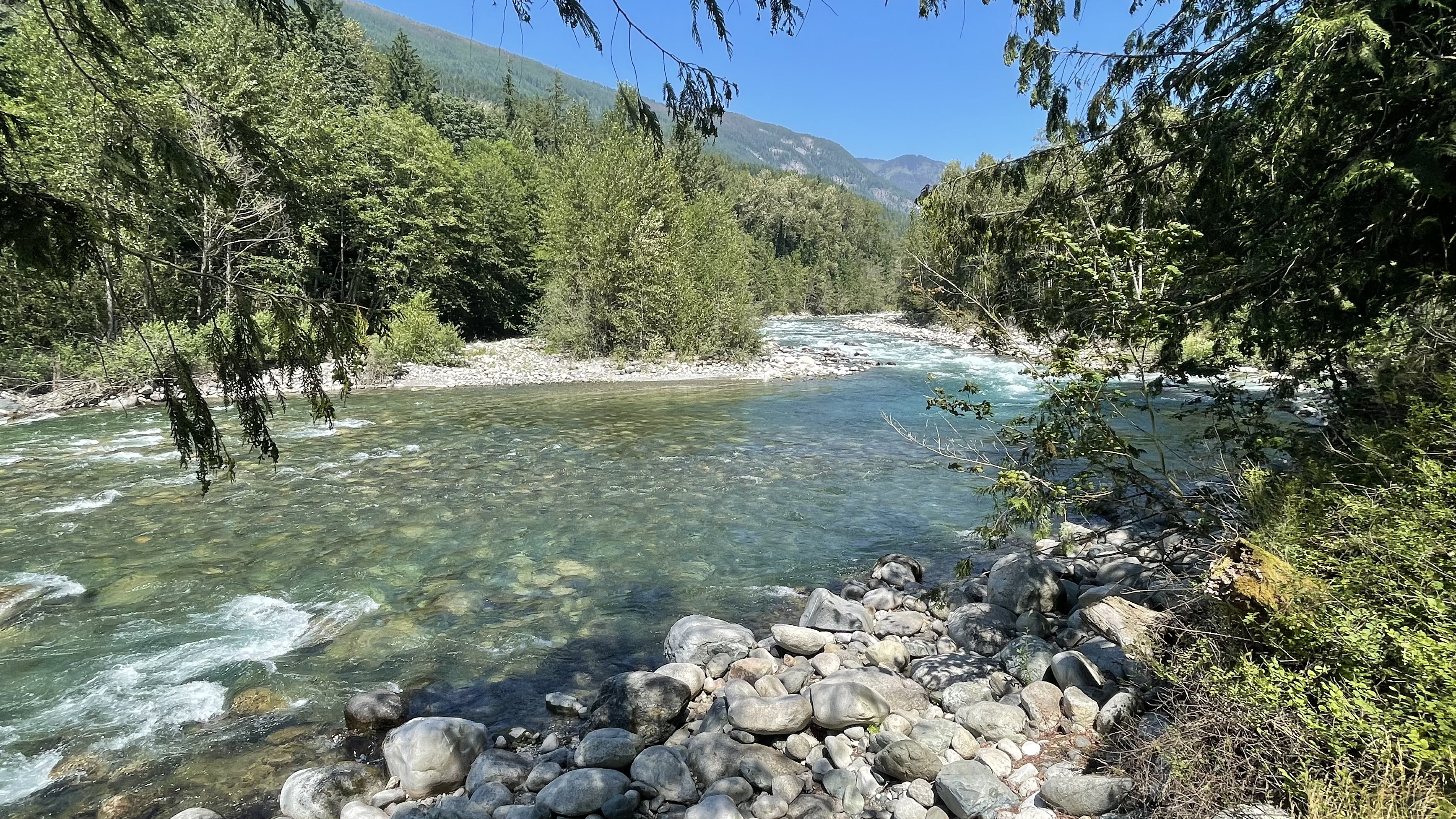 Slesse cave area. Here you can see the beautiful river, the climbing area, and some of the other cave-like holes: