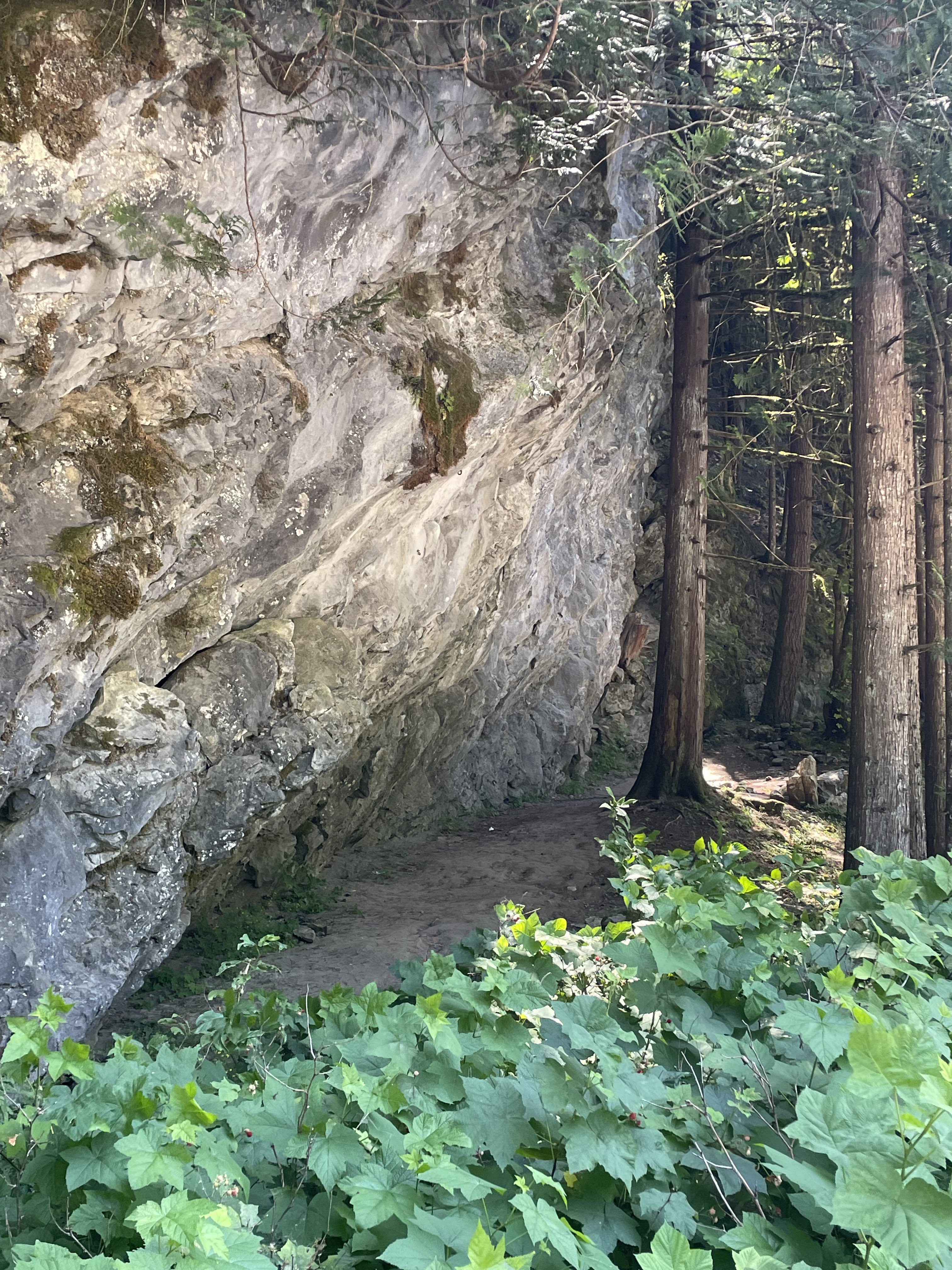 The cave that I was here to look -- the Slesse Creek Cave -- at was understood to be small, but I was surprised how small it was, just maybe an 8-meter hole by the road. It is under a large cliff that rises straight from the road. A bit further to the west from the cave there's a place where climbers climb on the cliff face.