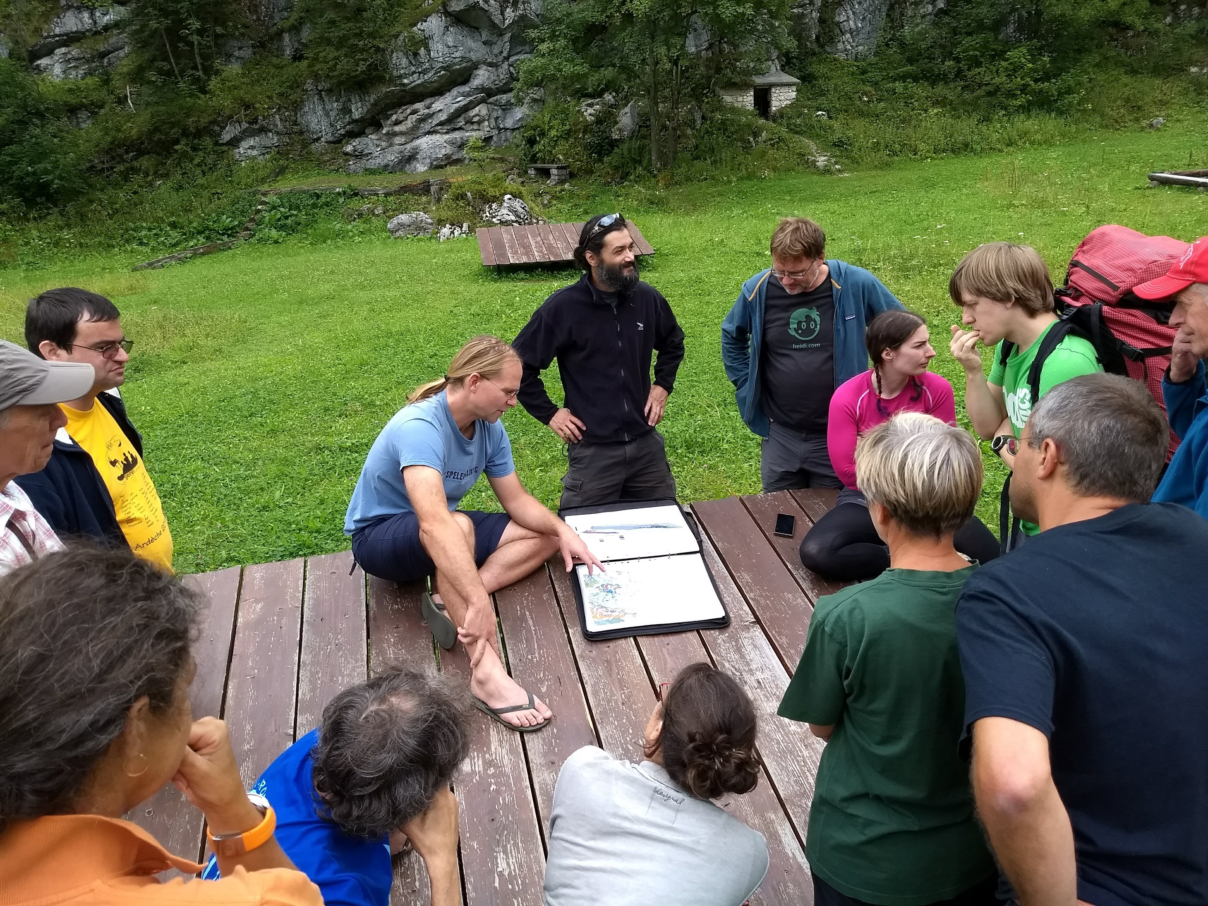 Our guide in the cave was a geologist, Lukas Plan from the Vienna Natural History Museum. We focused mainly on signs in the cave of how it was formed, and what had happened in the past. As a karst cave, it was obviously created through chemical reactions and water. But still, there are many questions. Which way did water flow on this tunnel? Sometimes water flows uphill in caves, if the particular part of the cave is under the normal underground water level the tunnels and the water they carry can zigzag up and down. At Dachstein Mammuthöhle there's an added complication of the tilted bedding planes in the rock, hence tunnels being forced be tilted as well.