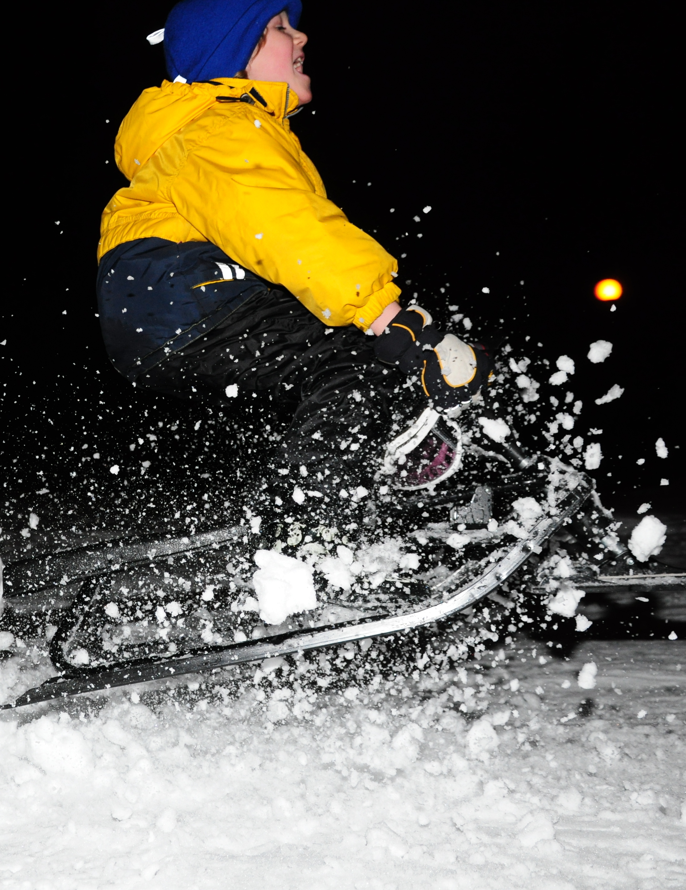 By the way, I used a flash to take the opening picture above with rice flakes. I can also recommend using flash photography in many situations, even in children's sled rides. A flash can fire for 1/20000s, much less than usual camera shutter times. This means that it can freeze flying snow (or rice!) in a very nice way. I used to build small piles of light snow and skied or sledded through. Just 20-30 cm of snow is usually enough to make snow fly around, if you hit it at speed. Set your SLR to all manual and the the flash on a low power setting (e.g., 1/16). This allows you to use continuous shooting mode and take several shots in sequence. Here's one example of a photo taken in this manner: