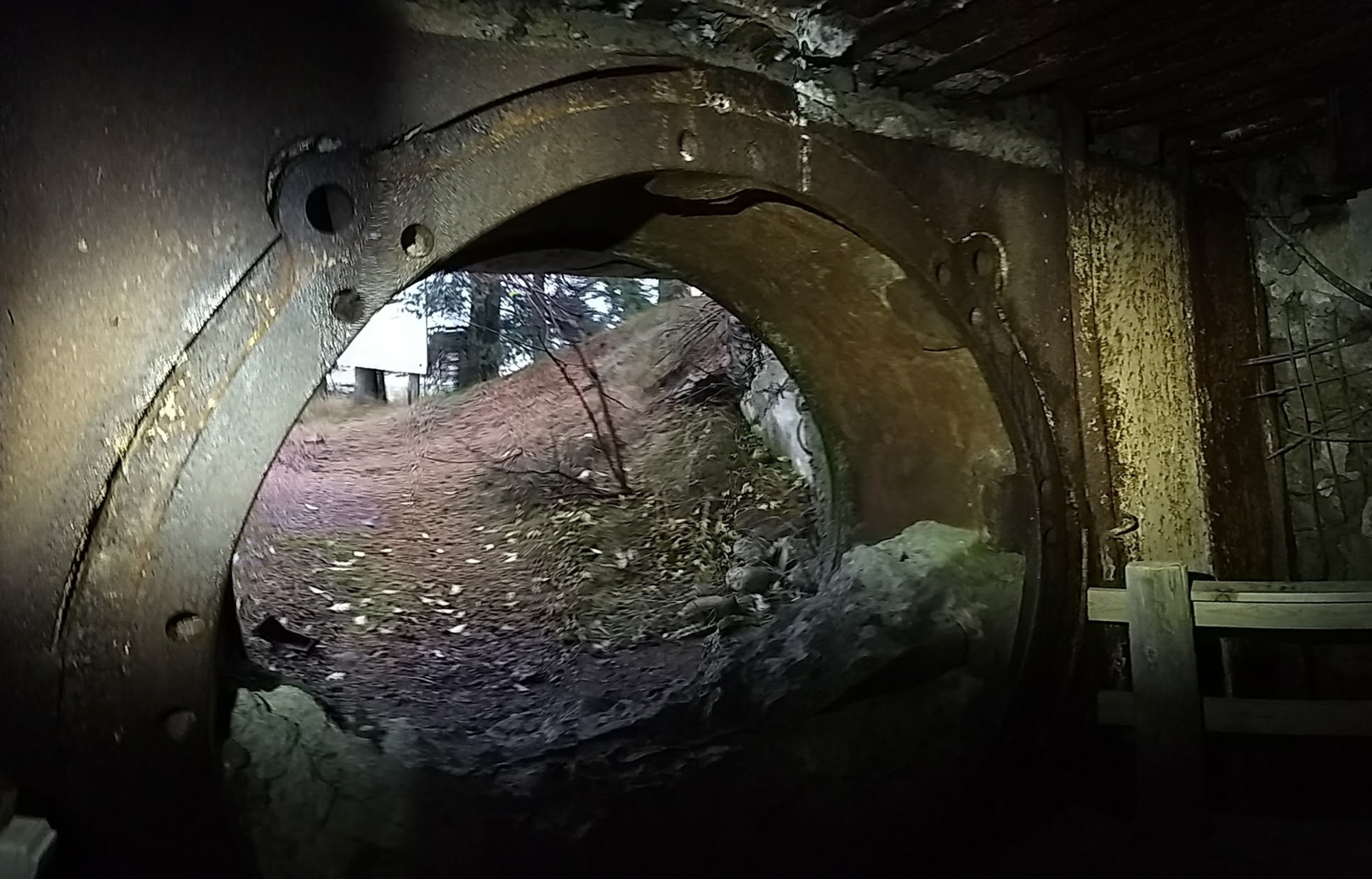 This particular bunker is very easy to reach, next to the road at Inkoon Rannikkotie 551, Degerby (N 60.078693 E 24.144999). There's an easy parking spot on the grass, the round gun door is the way to enter, and there's a wooden platform to stand on inside. On the right side there's even a light switch!
