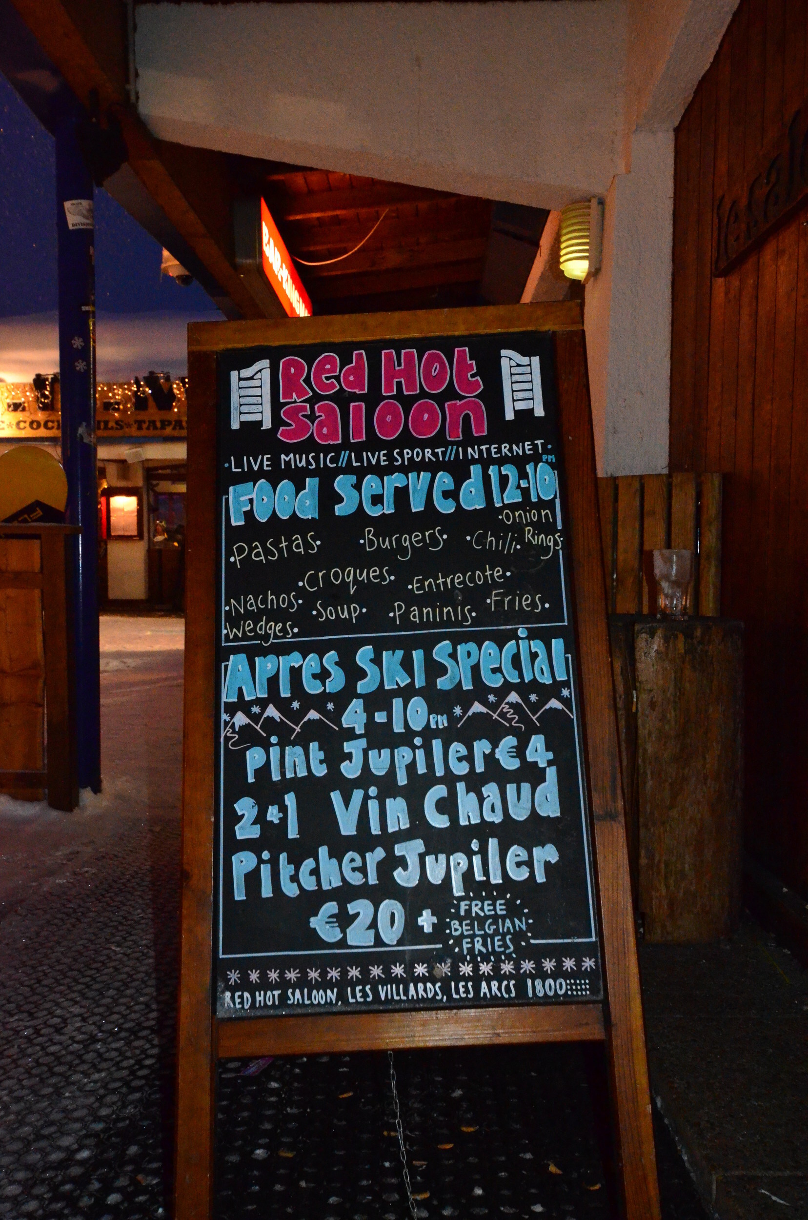 The most widely recommended place in Les Arcs is the Les Arcs 1800 village and the Red Hot Saloon bar. Even with typical party goers dancing with not one but two beer jugs in their hands, it is still not as crazy as La Folie Douce was. And it is half-empty right after a ski day, it is completely empty around 6PM, and only comes full later in the evening. Still, when it is full it seems to be a fun place. Not necessarily my type of music or crowds, however, and since I had already tested my camera for beer-proofness, I really didn't need to be around those dancing beer jugs. Time to move along...