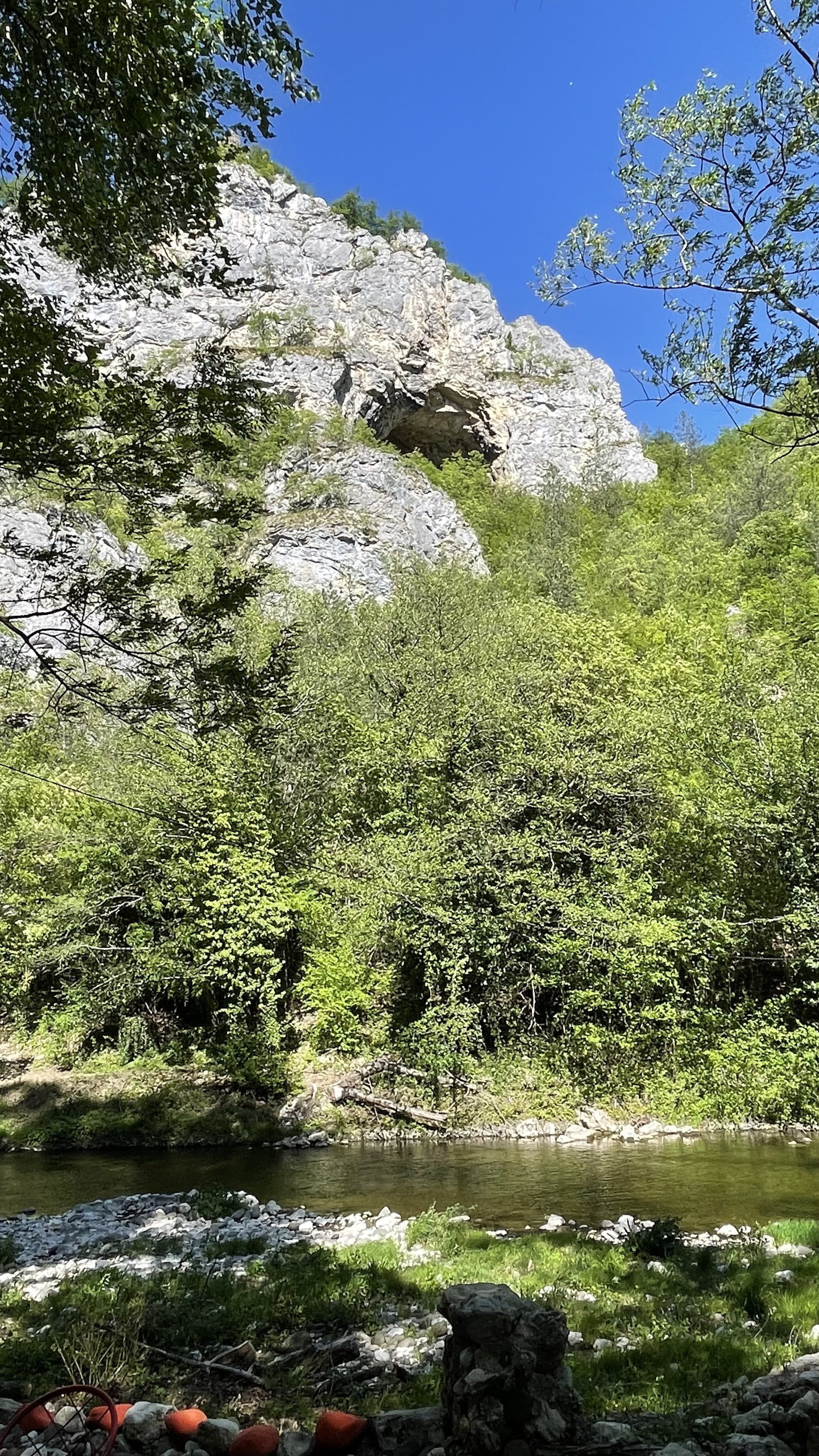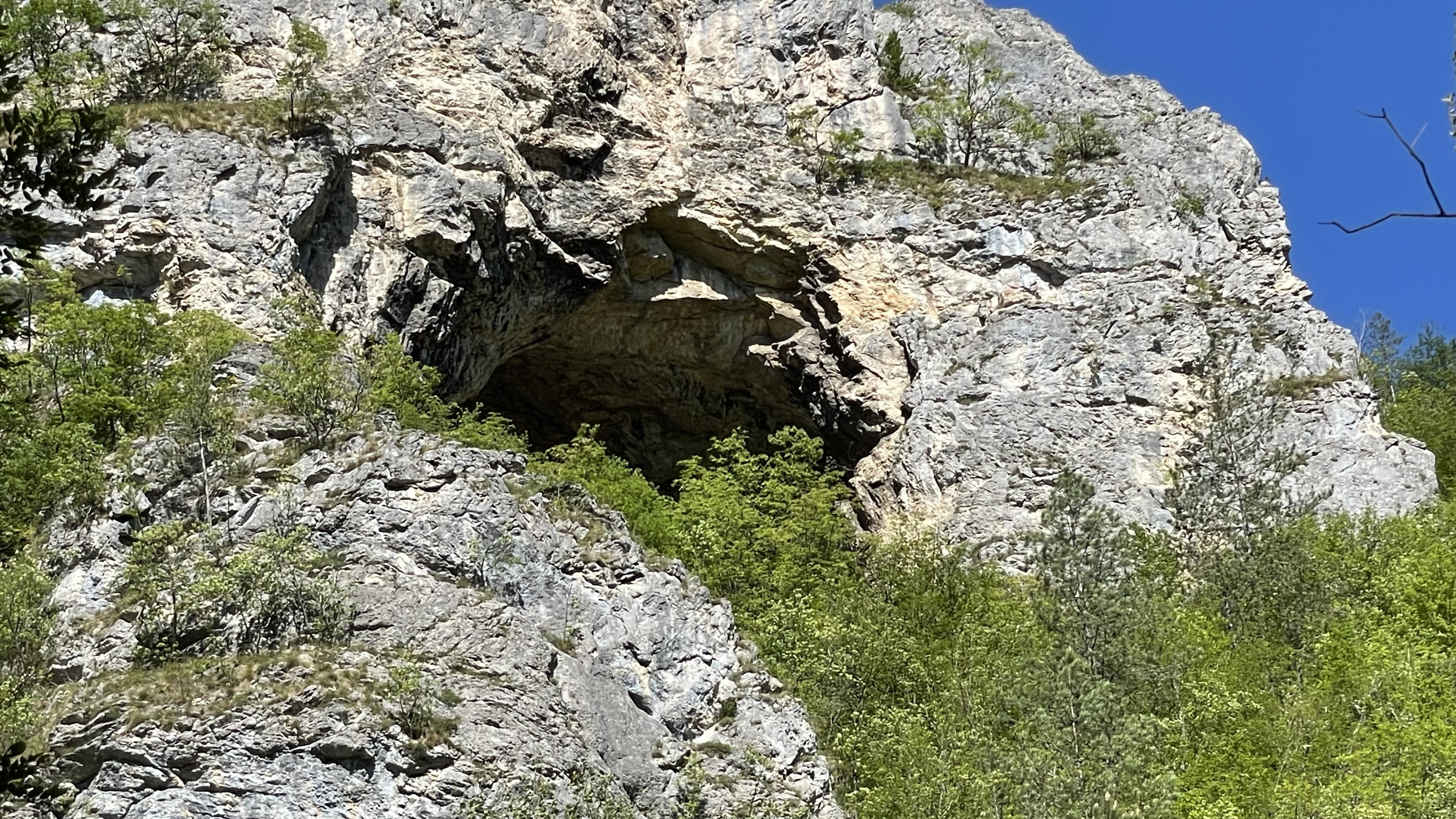 Perhaps there is. But the approach from another direction would have required a boat to get further in the river, as the cliffs around the river were vertical. I had attempted to walk up a forested scree slope towards the cave. And even to get to the this slope I had to stop on the highway where there's two houses and cross a railway just across the tunnel. Not to mention a border crossing from Serbia that at different times can take up to three hours to cross...