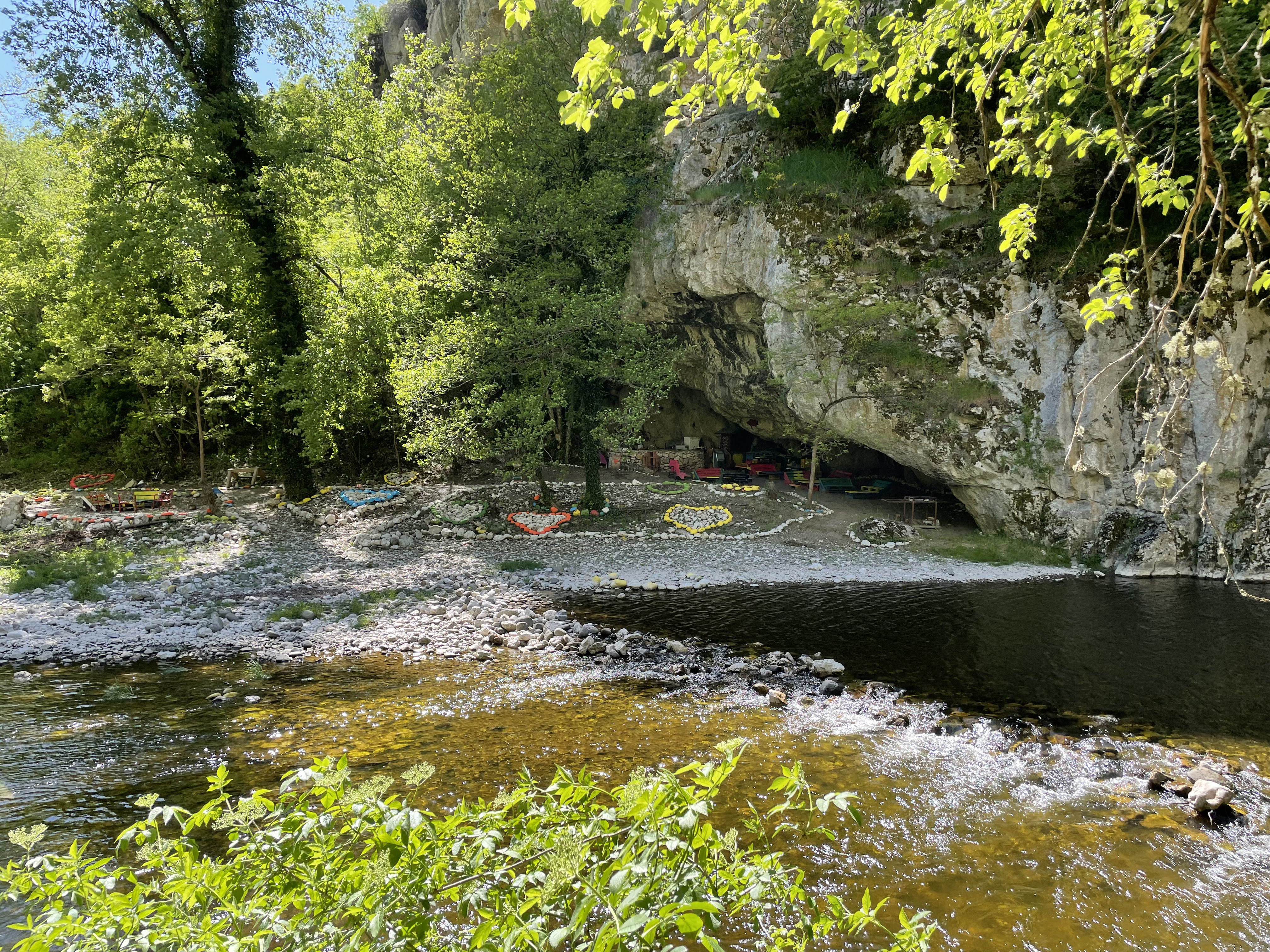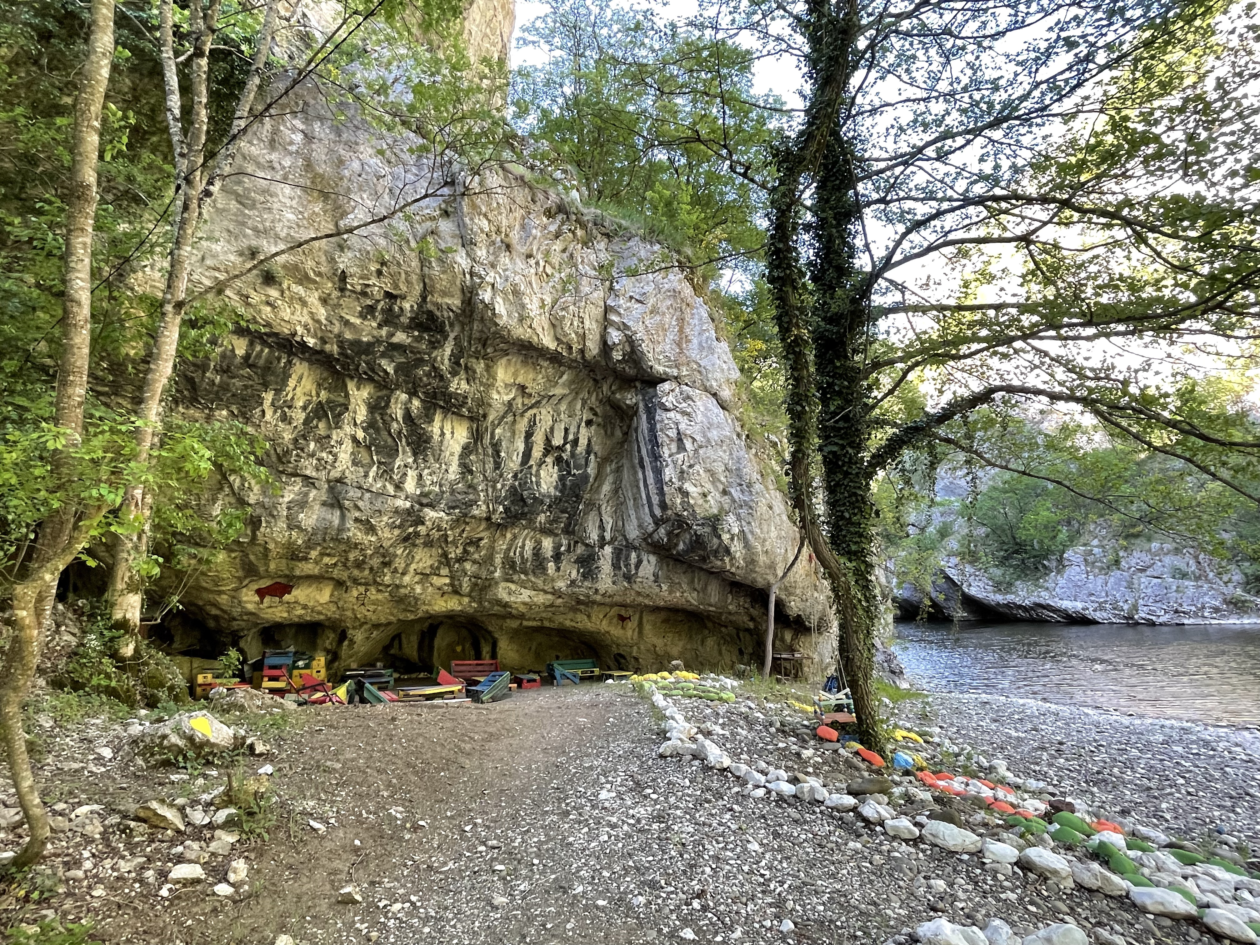 Fortunately, at the bottom of the scree slope there was the river, the river was crossable on my bare feet and only getting my shorts wet. And on the other side of the river there was definitely a cave. Not a big one, but still maybe 25m by 10m, kind of a shelter cave at the bottom of the cliff against the river.