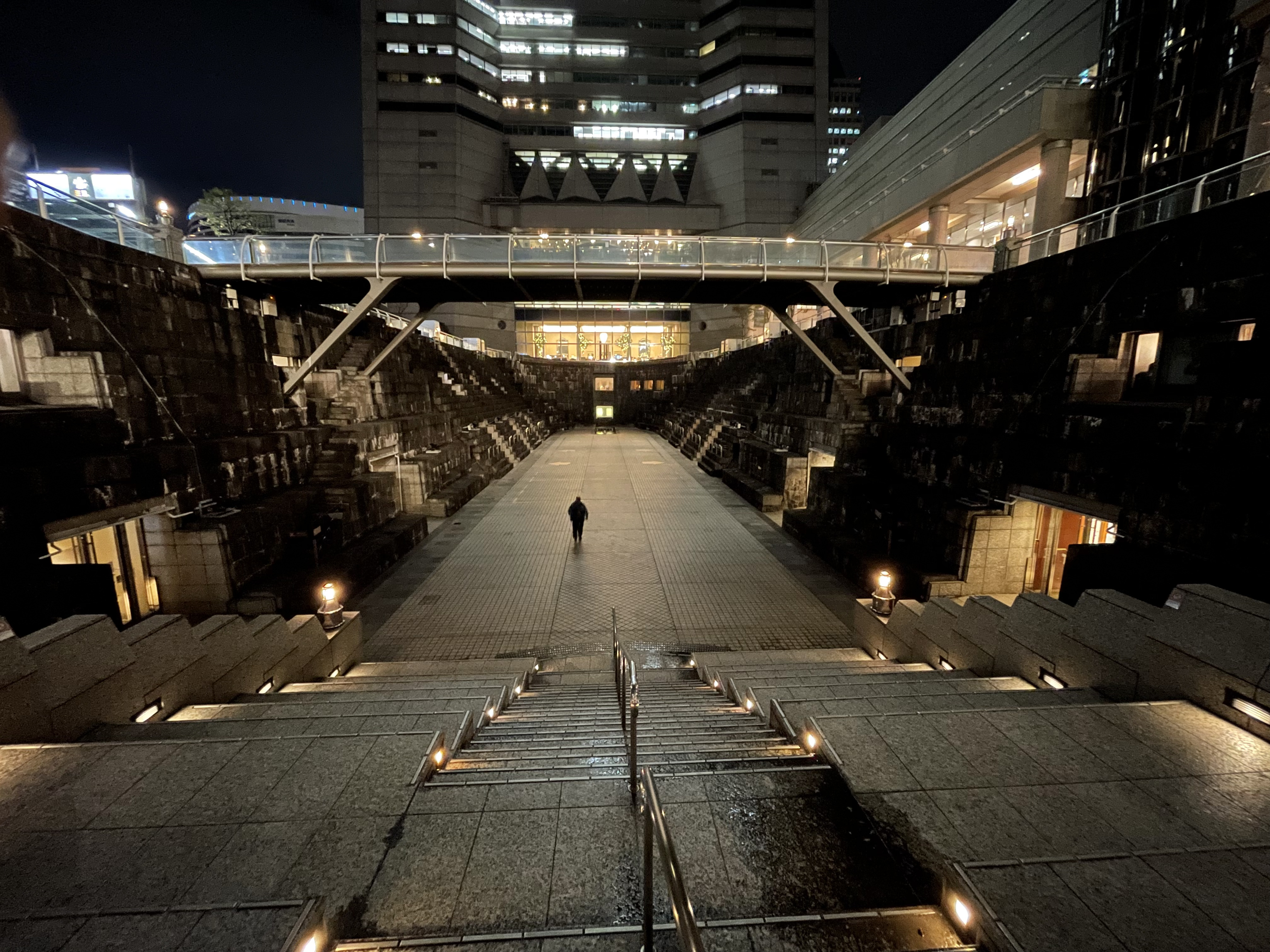 Dockyard Garden is an old dry dock in the Yokohama harbor, cornered between some of the highest skyscrapers in Japan. Doors have been cut to the sides of the massive rock walls protecting the dock, to build access to nice restaurants at the bottom.