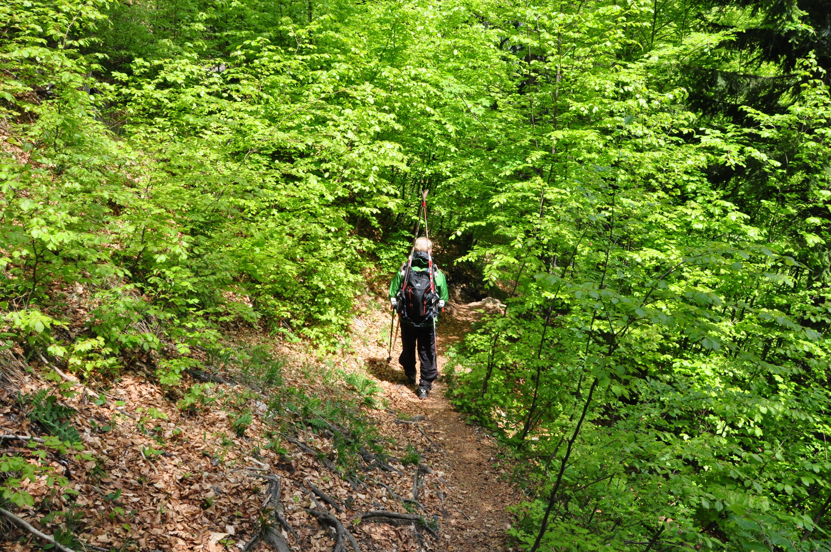 But we decided to risk it anyway. We could always turn back if the weather become a real problem. And that was a good decision. With the exception of a three minute shower, we whole day was sunny. We parked our car at the end of a small road and started the climb through a thick forest at an altitude of 1000 meters. This was an easy walk along a well-marked path. A bit later the path reached a more rocky area, involving a few sections with ladders or safety wire handrails. (These posed a small challenge for Lana, as the young dog needed more climbing experience.)