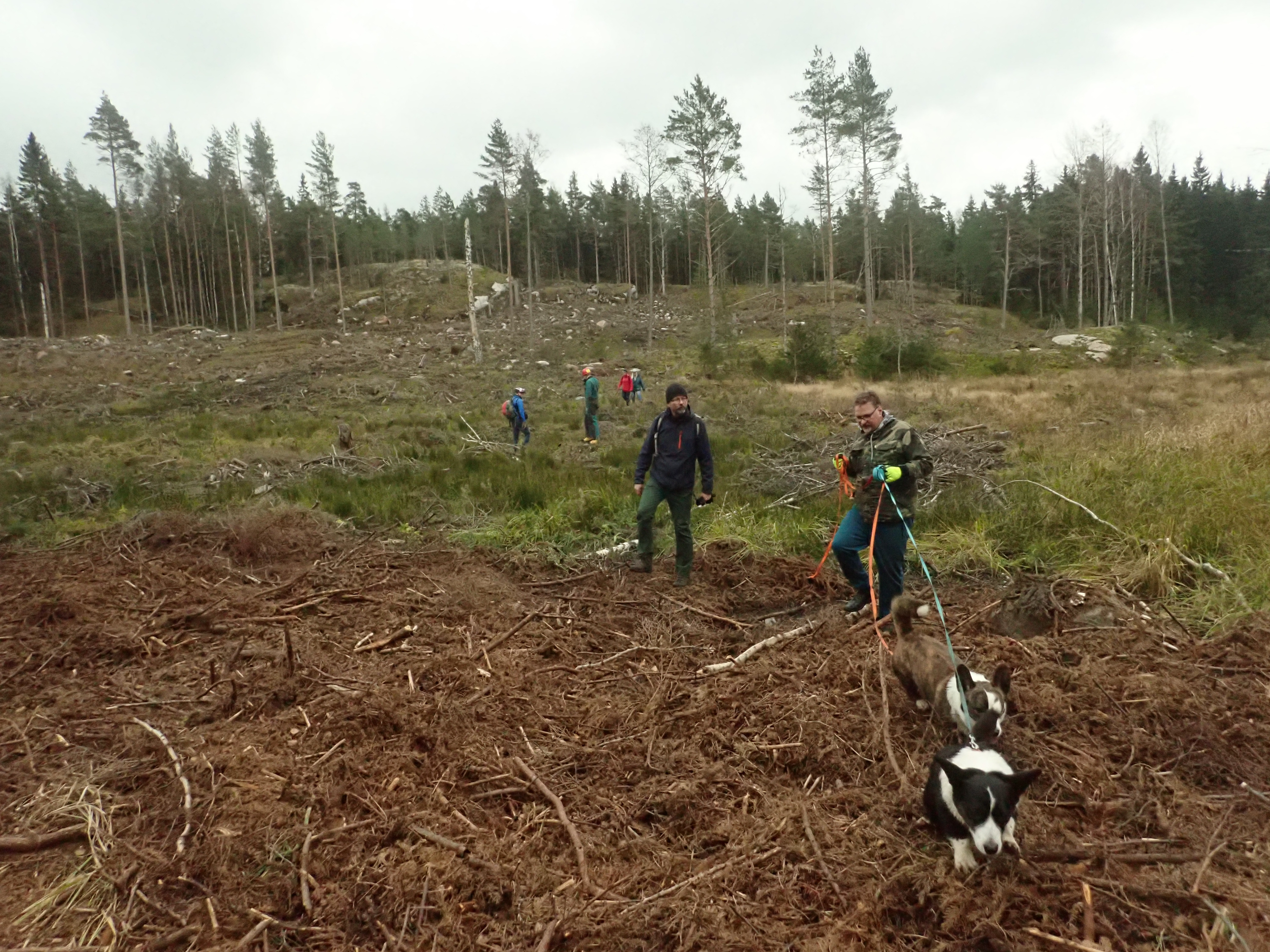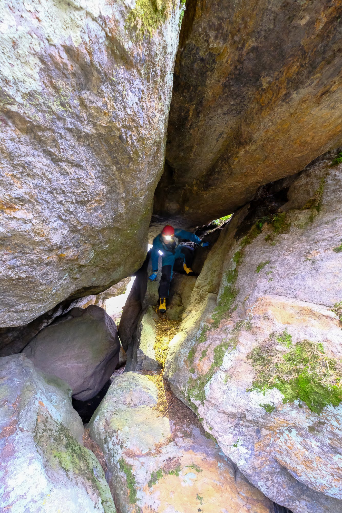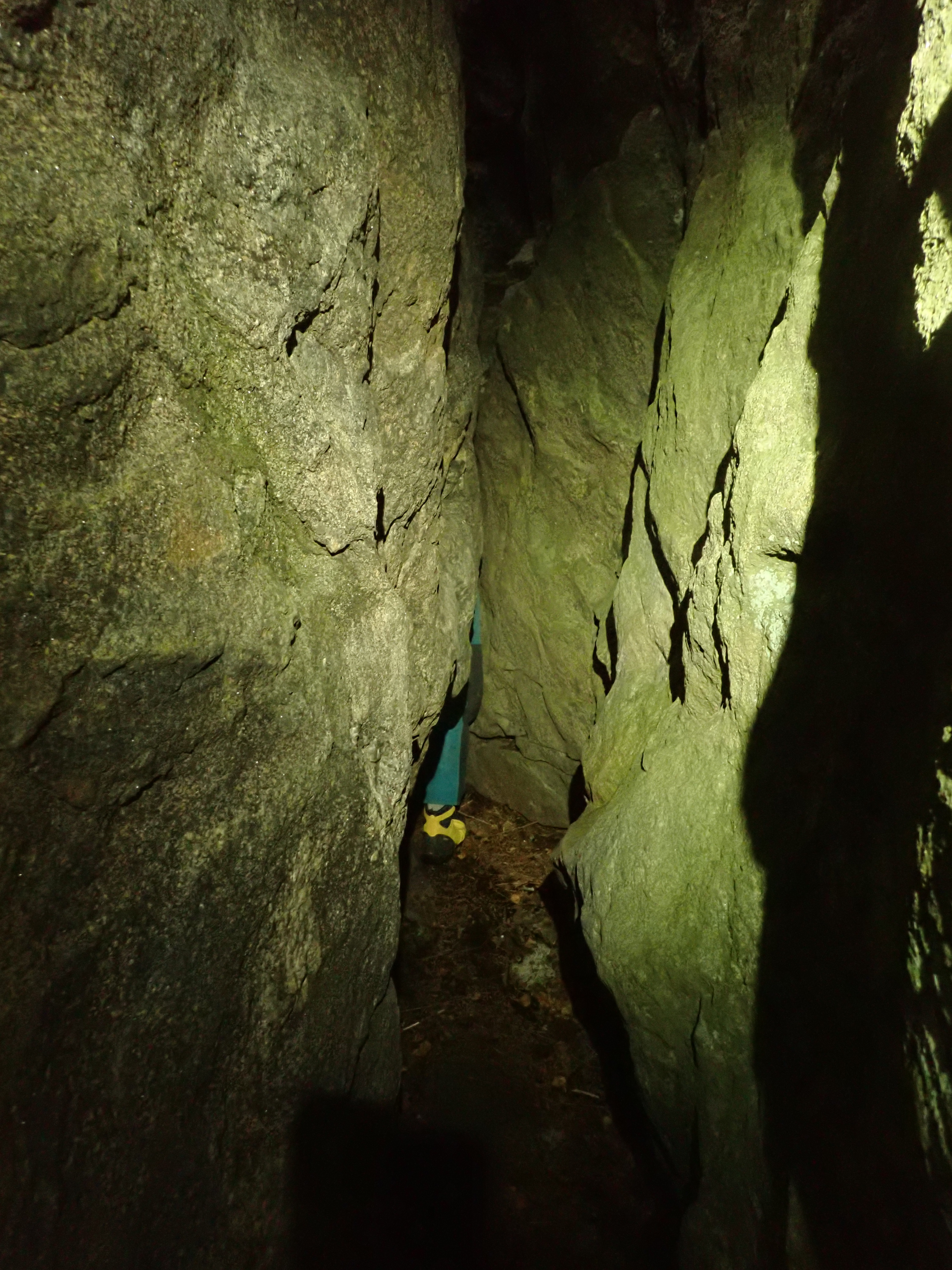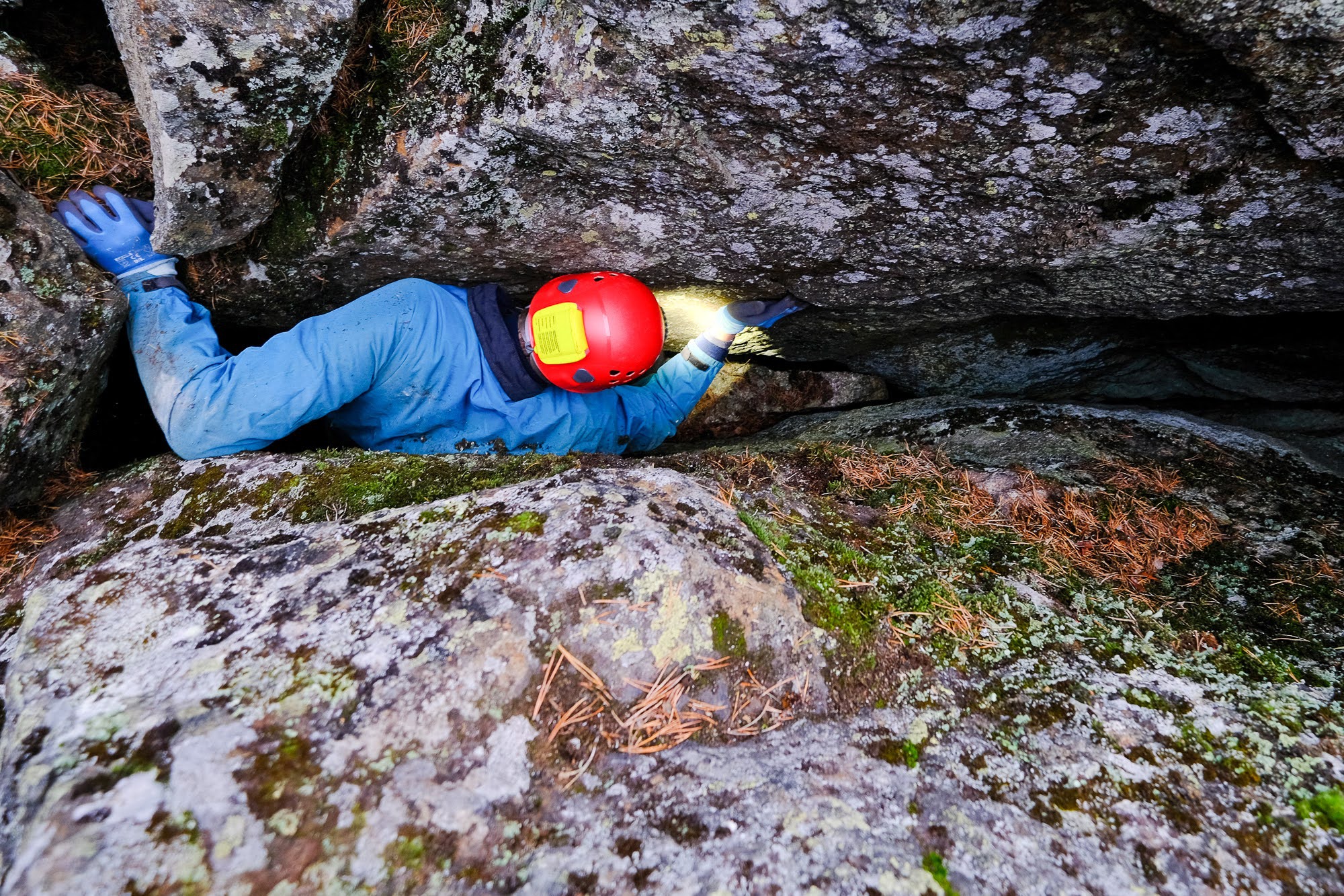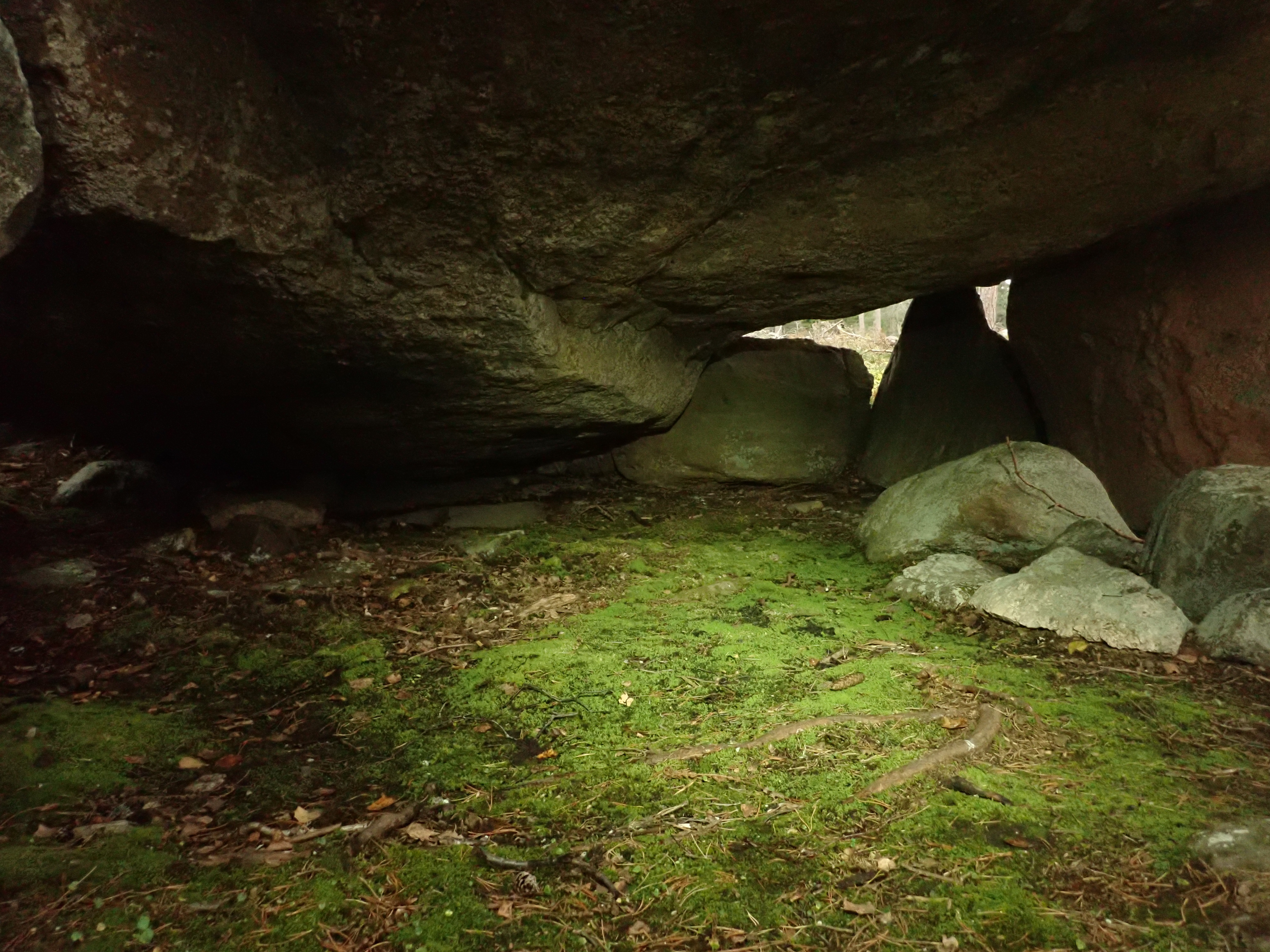 The north side was a particularly impressive surprise. Massive boulders, with interesting caves underneath. There's one main cave with some side passages and levels inside, total length of passages nearing 30 meters. Under the same massive boulder there's also another separate cave room, with very tight entrances on both ends, one roughly 30cm high under the boulder and one in a tight crack on the other end. And another large boulder has a large, high room under it as well.