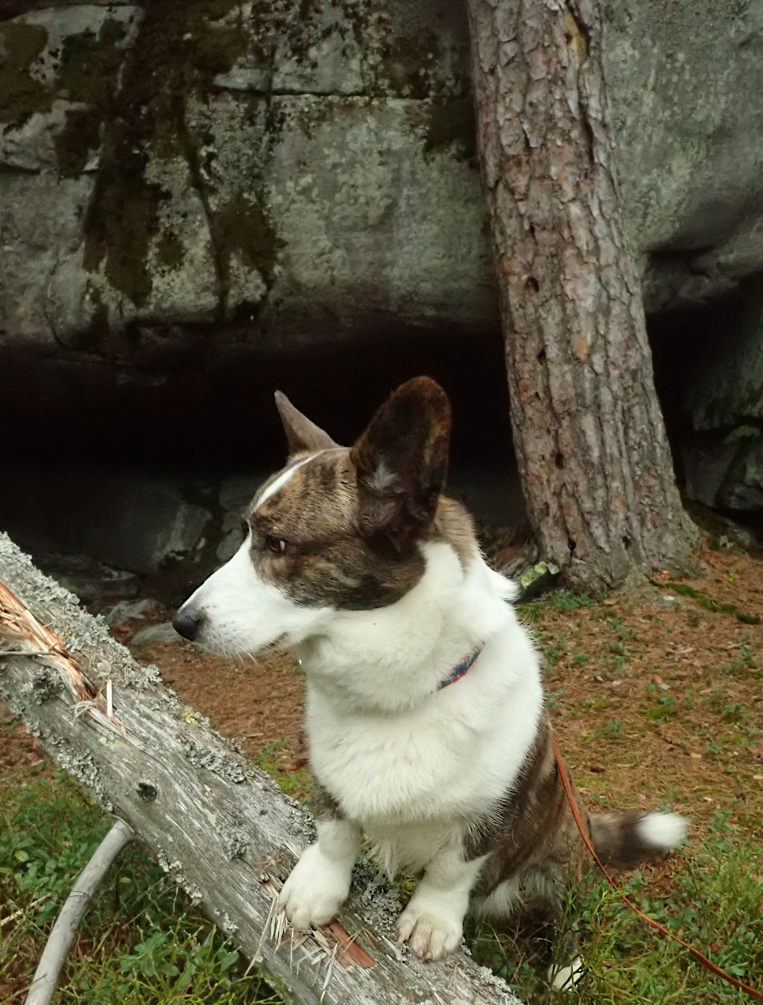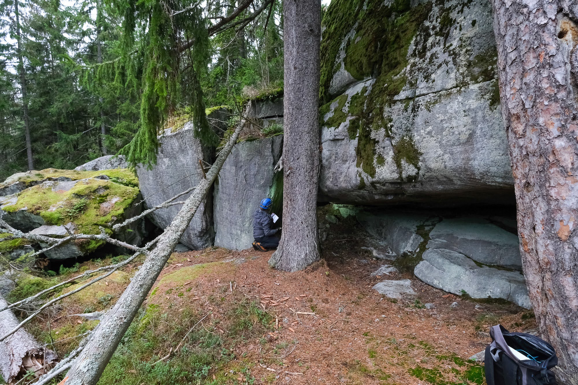 The caves near the cliff area were also impressive, kind of reminded us of the caves in Vihti's Rokokallio. Roof caves at the bottom of a cliff, but with cracks continuing deeper into the hill. We realized that the two most obvious caves next to each other are actually connected after Tor and Jouni crawled through. I followed them, and realized that I was in a place that I had already been from the other cave only after sitting a few minutes in there. On my first visit I had not realized that one could actually go through the very low bottom to reach the next cave. Together these two caves form a fairly big cave by Finnish standards.