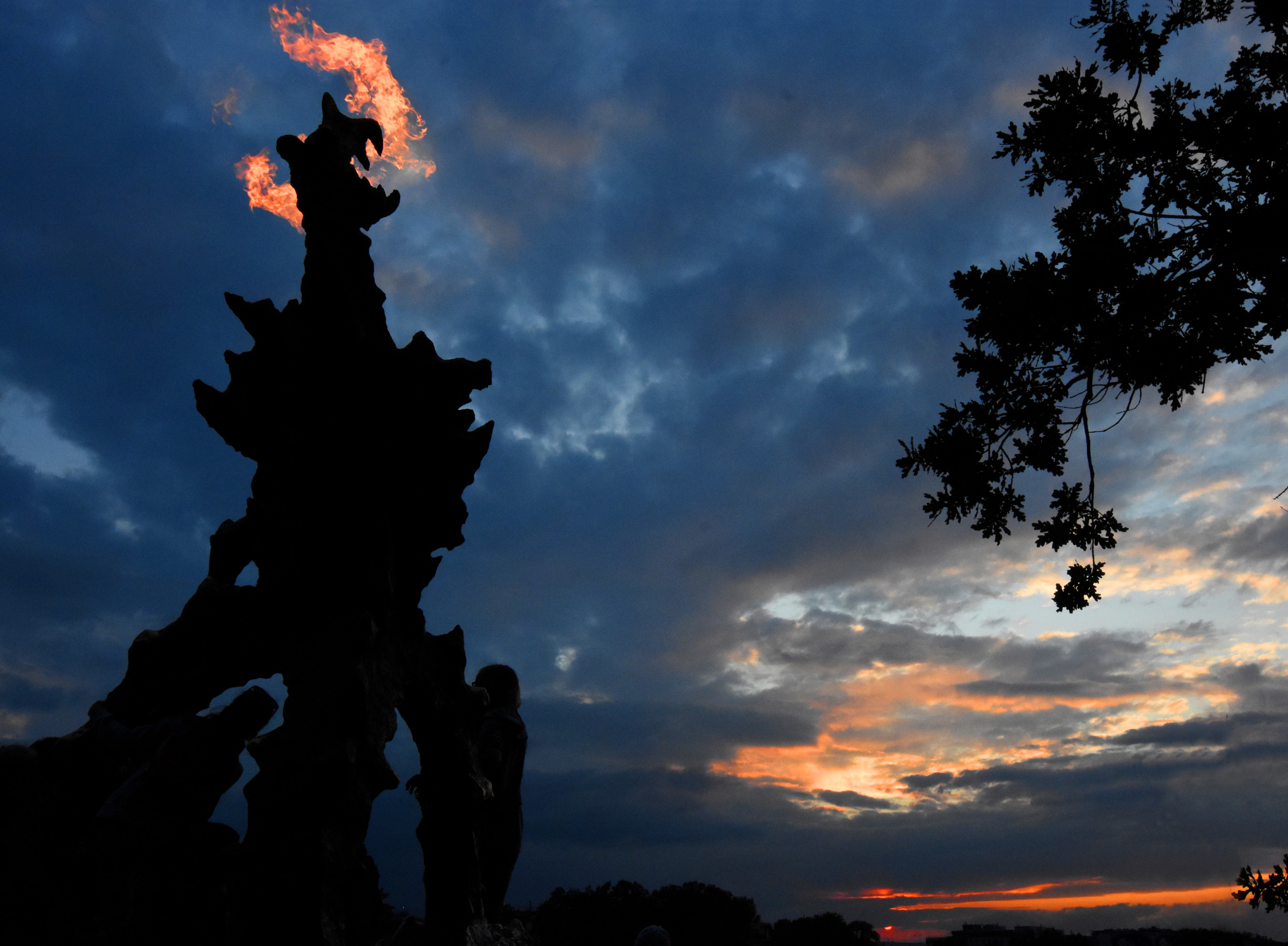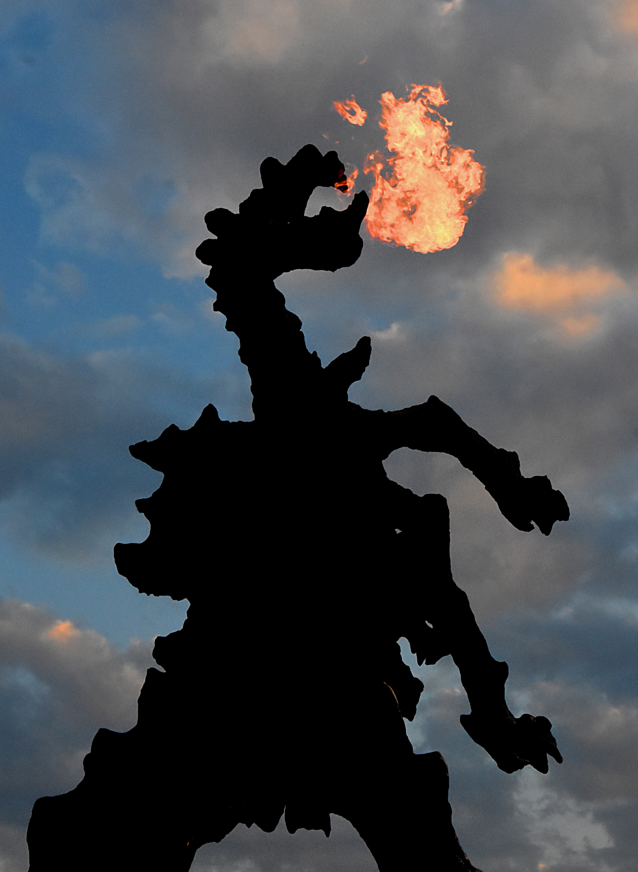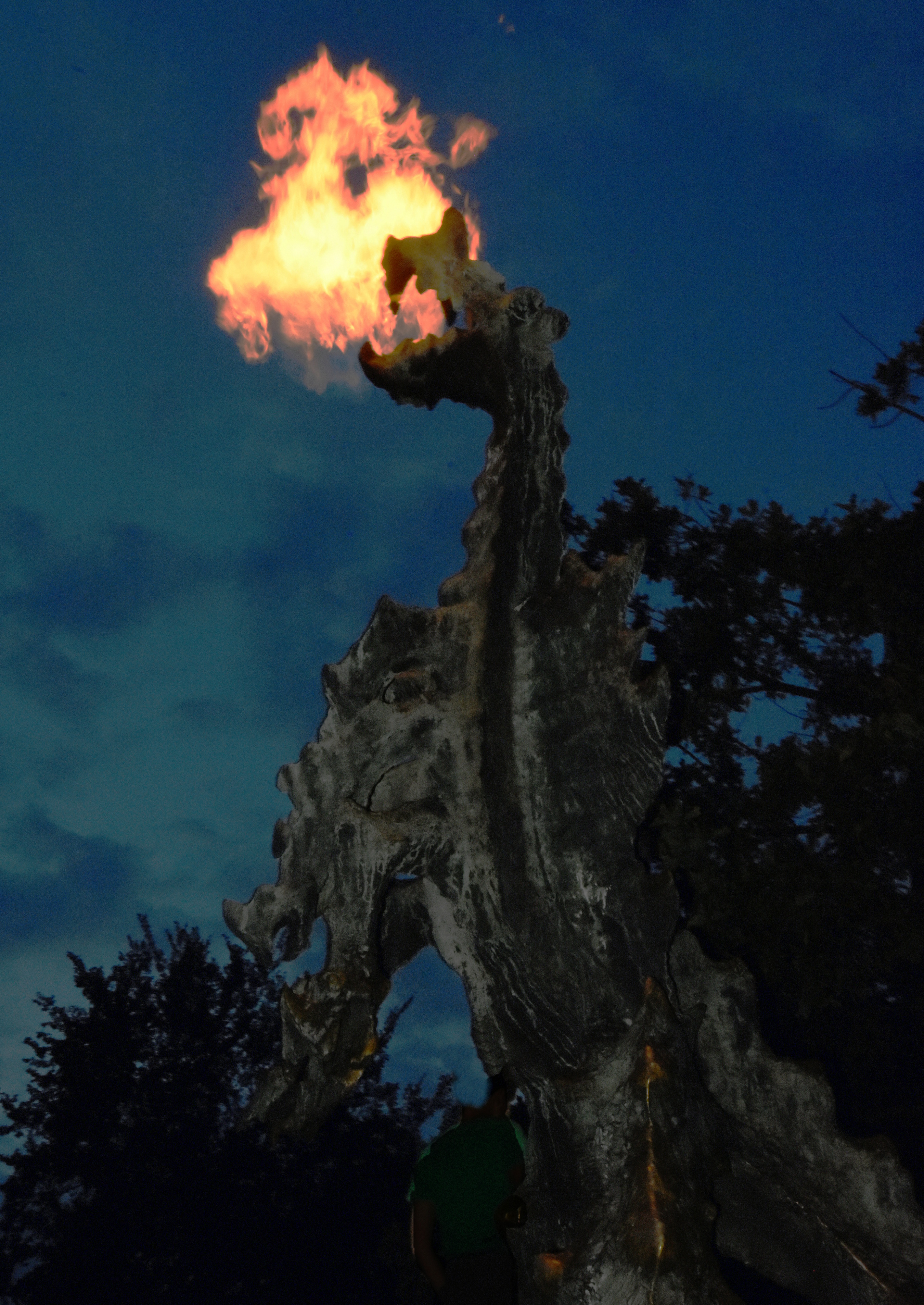 The dragon statue is in front of the cave exit on the public area. It breathes fire about every 4 minutes, and is best observed during the evenings. There's usually a collection of small kids crawling on top of the rock that the dragon stands on. The cave itself closes though before the evening, the exact time depends on the season. I was in Krakow for a meeting, so had trouble making it to the cave in time. On the first day I missed the closing time by 30 seconds.