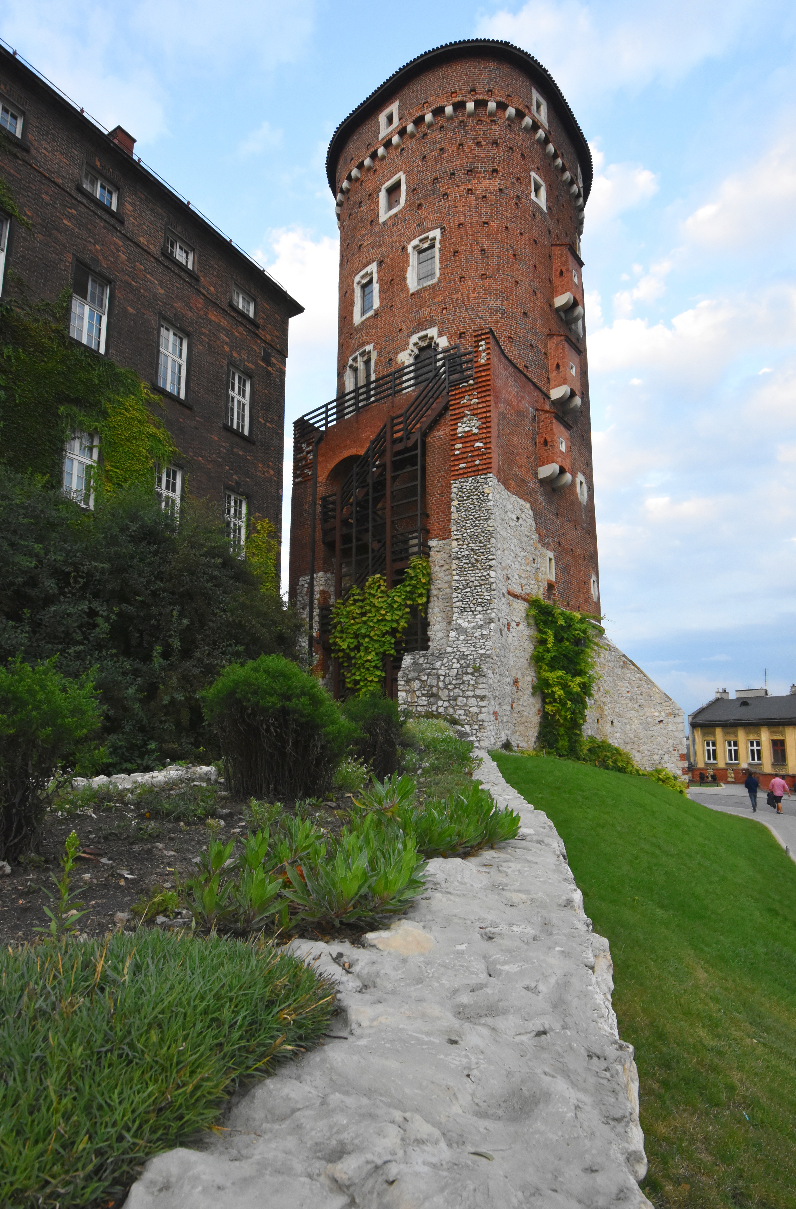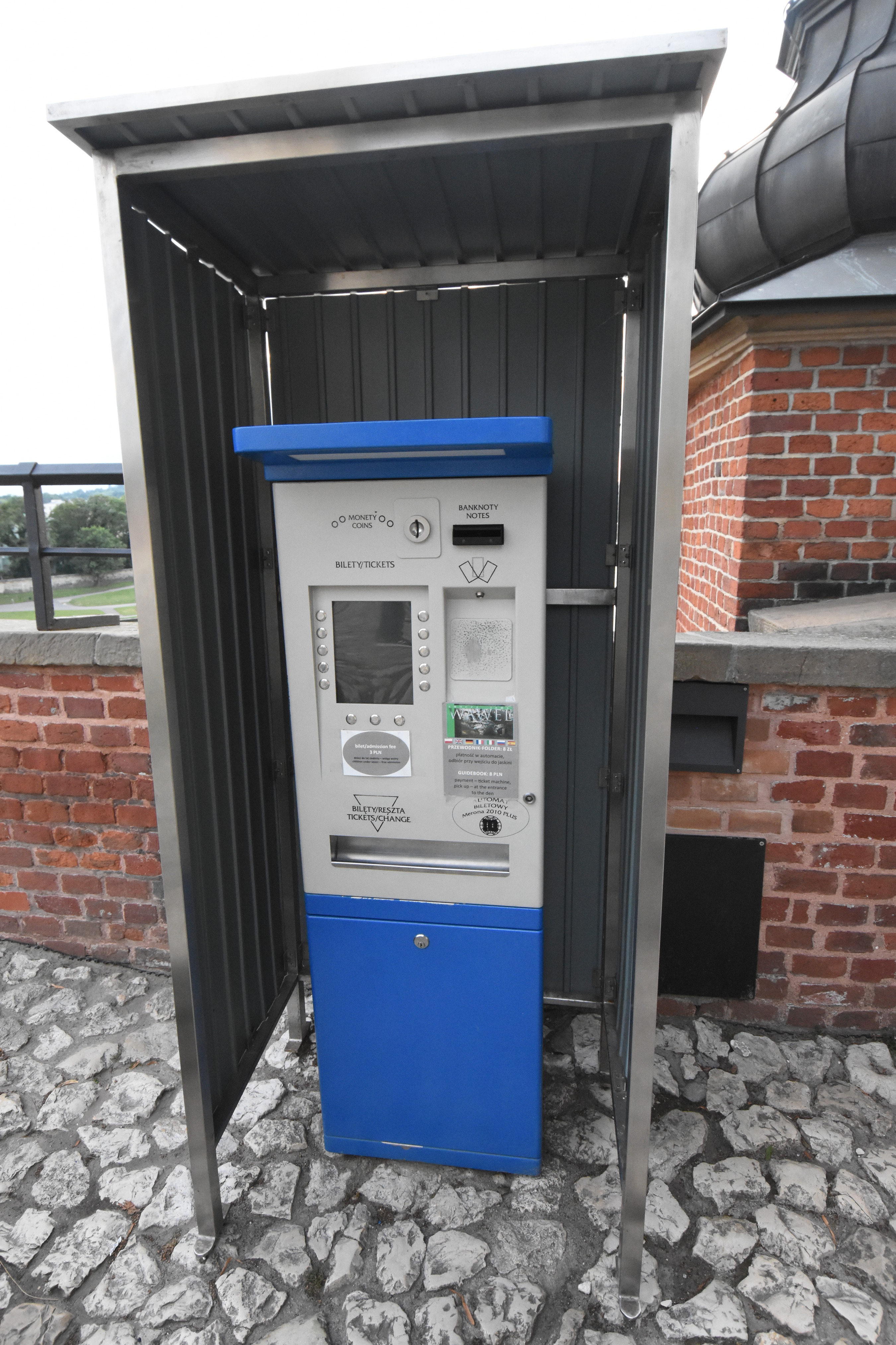 Signs, Wawel buildings, ticket machine, and the entrance stairs to the cave: