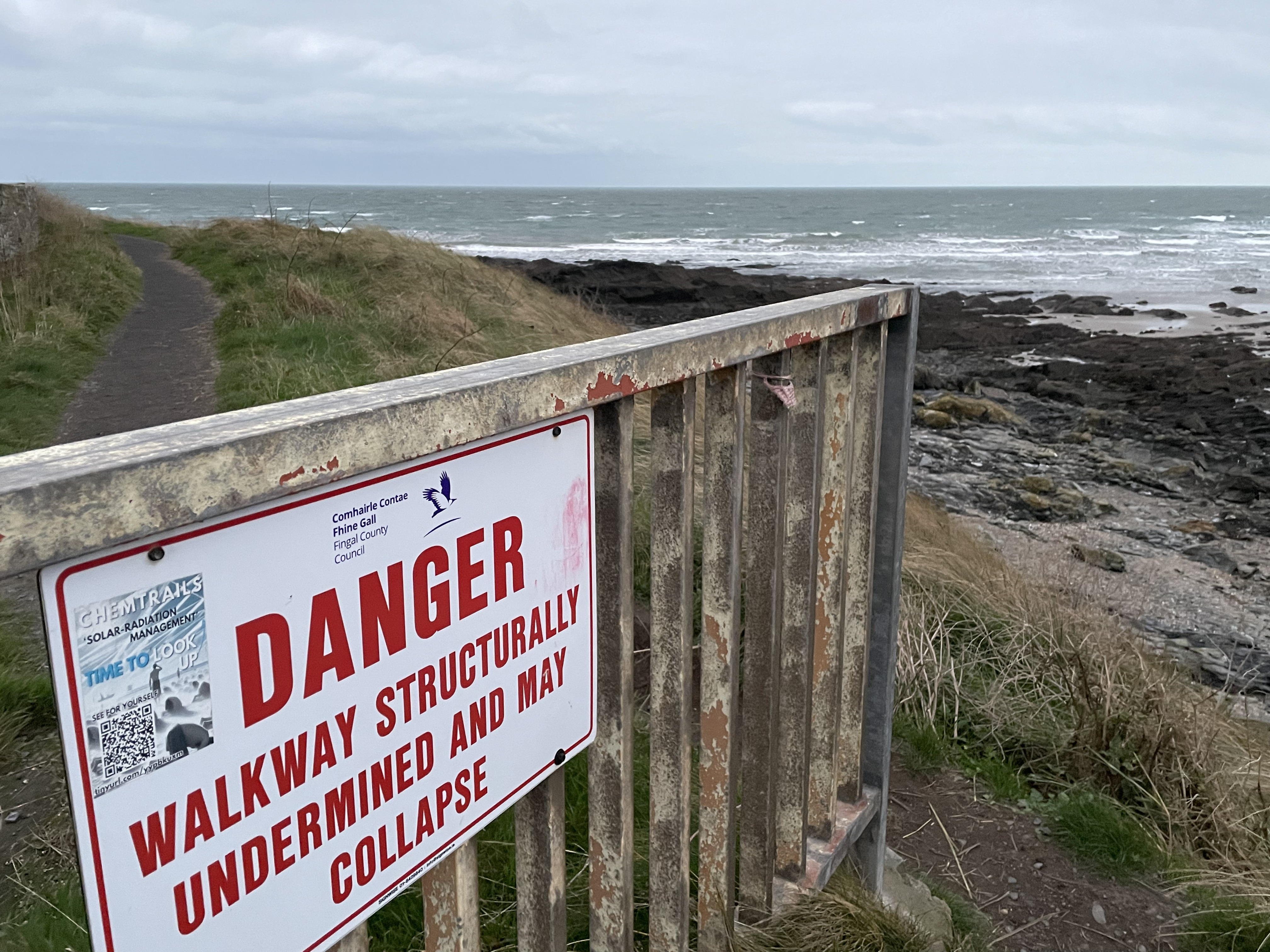 Then there was a sign that the path may collapse. Ok, that's normal. But then I looked more carefully... it also warns about chemtrails :-)