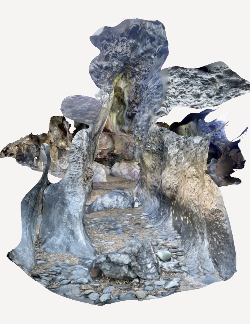 Note that the first side passage to the right of the entrance is fake, resulting from a scanning artifact where the iPhone's sensor double-recorded the entrance wall, thinking it was inside the cave. I also don't know if the left and right branches of the cave actually connect, but according to the model they do.