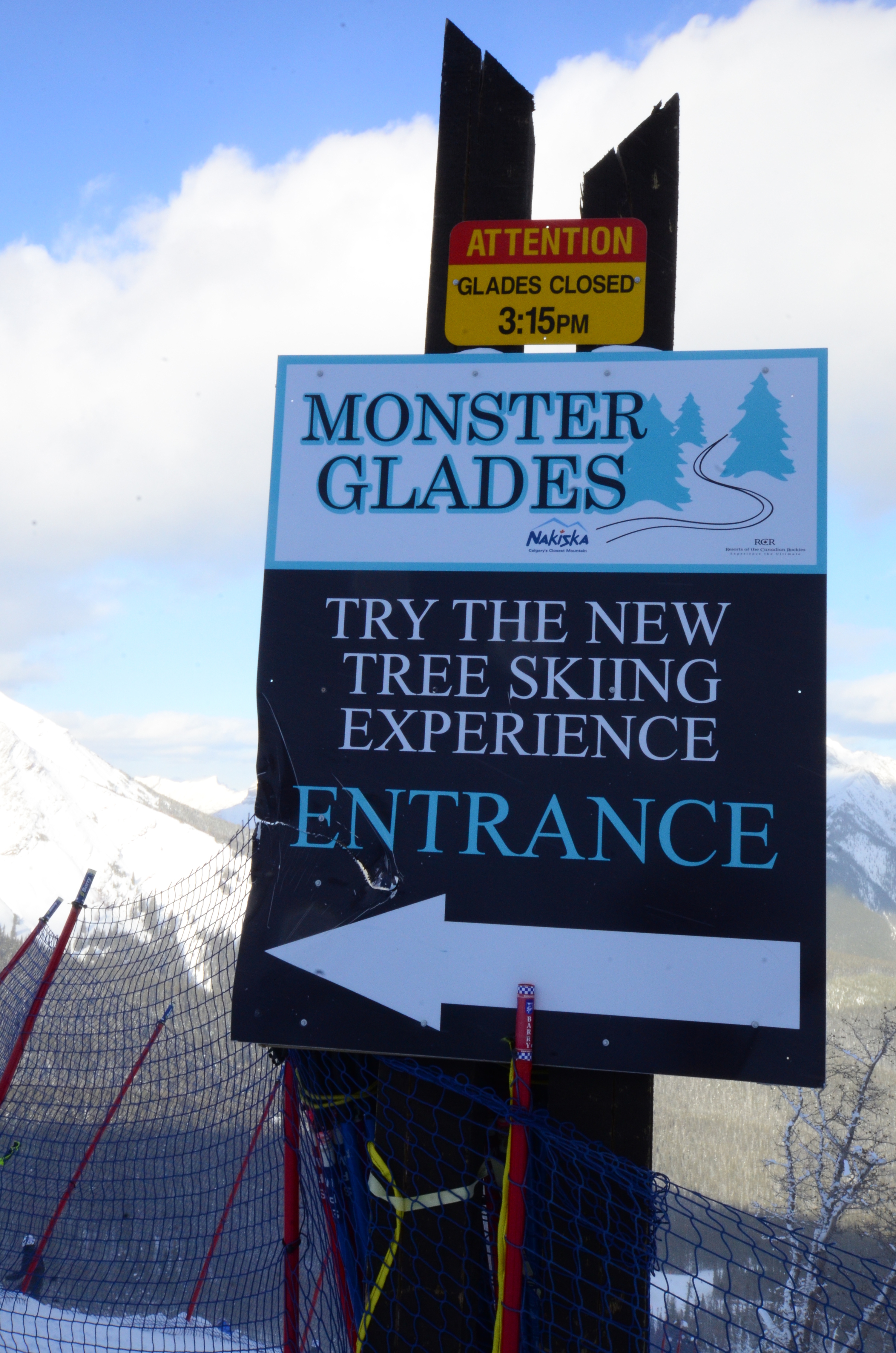 Nakiska is a small ski area on the way from Calgary to Banff. At the time, only one slope was open. Fortunately they had also opened up their new "Monster Glades" section next to the slope. Skiing through the steep woods was a fun, even if a bit rocky early-season experience. Sandy, my local friend helped me navigate in the woods, on her recently healed leg. (Thanks - I'm hoping skiing icy woods was good recovery training.)